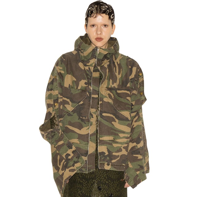 着方で印象が変わるモジュラーデザイン。 袖のボタンをすべて開ければケープのようなシルエットに。 袖を胸で縛ればジレに。 ランダムに留めればニュアンスを加えられる。 閉じればスーパーロングスリーブ。 折り返せばすっきりとしたバランスへ。 その日の気分で自在にシルエットを変えられる設計。 ユーズドのようなハードウォッシュ加工を施したカモフラージュが、ラフで無骨な表情を演出。 取り外し可能なショルダーパッドと立体フードで構築的な緊張感を加える。 フロントには、入念に磨き上げられた最高級メタルファスナー“EXCELLA”を採用。 滑らかな開閉と静かな光沢を備えたダブルジップ仕様。 総メッシュ裏地で軽量かつ通気性を確保。 カジュアルとモードを横断する、 一着で主役にも、レイヤードにも対応する汎用性の高いアイテム。 ・袖ボタン開閉による5WAY仕様 (ケープ、ジレ、ランダム、スーパーロングスリーブ、折り返し) ・最高級メタルファスナー「YKK EXCELLA」使用 ・ダブルジップ仕様 ・胸ポケット×2 ・両脇ポケット ・ハードウォッシュ加工 ・フード付き ・総メッシュ裏地 透け感:なし 裏地:あり 伸縮性:なし 光沢感:なし 生地の厚さ:普通 model H173cm