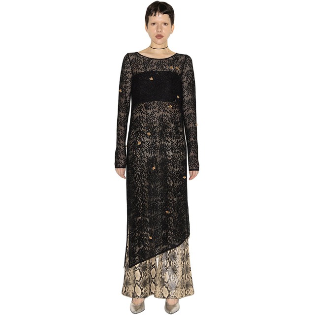 立体的なフラワーモチーフをランダムに散りばめた、アシンメトリードレス。 レースの上から模様を縫い重ねることで凹凸を生み出した、リーフ柄のコードレースを採用。 コード糸が縁取りとなり、柄を浮き上がらせることで奥行きのある表情をつくる。 さりげない光沢が、上品な存在感を引き立てる。 フラワーとレースの組み合わせでありながら、リーフ柄ベースのため甘くなりすぎず、 繊細さと強さを併せ持つバランス。 身体のラインを美しく見せるシルエット設計は、 ボートネックが首元をすっきりと見せ、アシンメトリーヘムと両脇スリットが軽やかな抜け感を生む。 ストレッチ性のあるレース素材で、見た目以上に快適な着心地。 華やかでありながら凛とした佇まい。 静かな強さを宿す一着。 ・立体フラワーモチーフ ・アシンメトリーシルエット ・リーフ柄コードレース使用 ・凹凸感のある表面デザイン ・ストレッチレース素材 ・ボートネック ・両脇スリット ・スタイルアップ設計 透け感:あり 裏地:なし 伸縮性:あり 光沢感:なし 生地の厚さ:普通 model H173cm