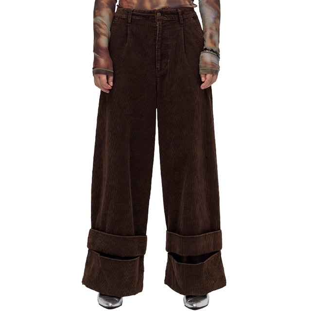 裾を大胆に折り返したダブルデザインが特徴的な、重厚感と抜け感を纏うワイドシルエットのコーデュロイパンツ。 ハードなウォッシュ加工によるユーズド感が、ルーズな腰履きスタイルにモードな抜け感をプラス。 後ろのみゴム仕様で、リラックスした穿き心地を叶えながらも洗練された印象に。 ゆったりとしたフォルムが、スタイリングに存在感を与える一本です。 ・ハードウォッシュ加工 ・ワイドシルエット ・ウエスト後ろゴム ・両脇、後ろポケット model H168cm