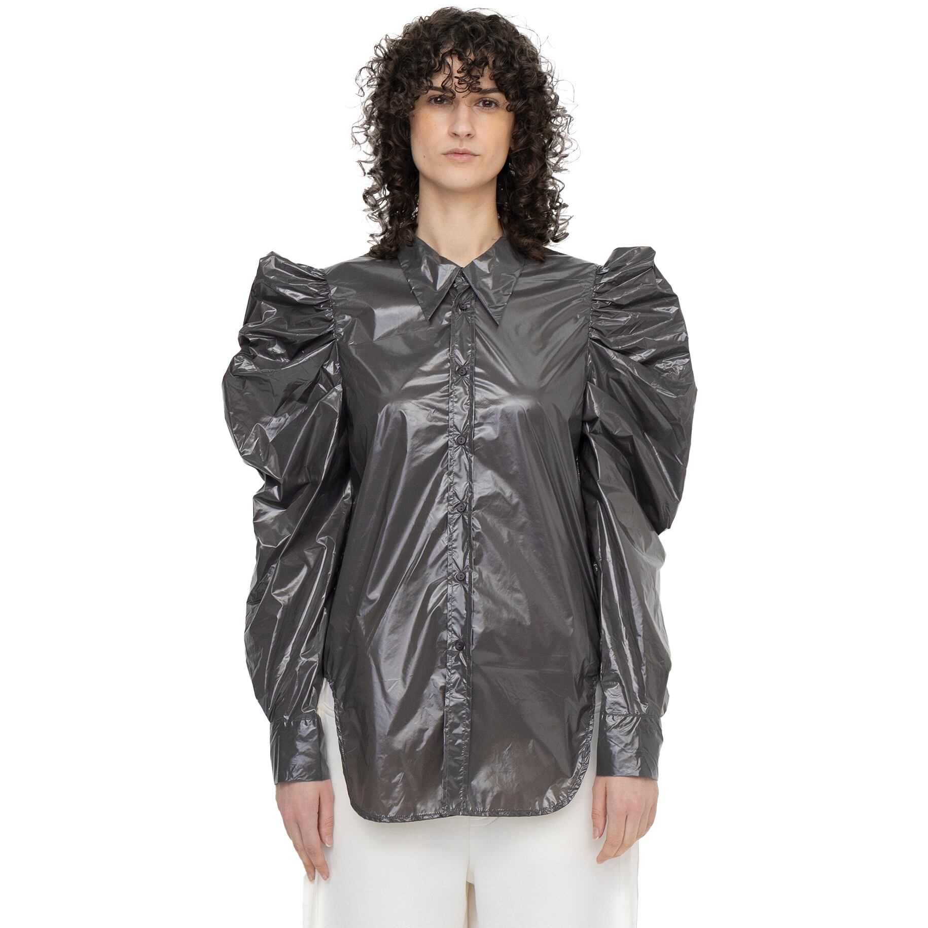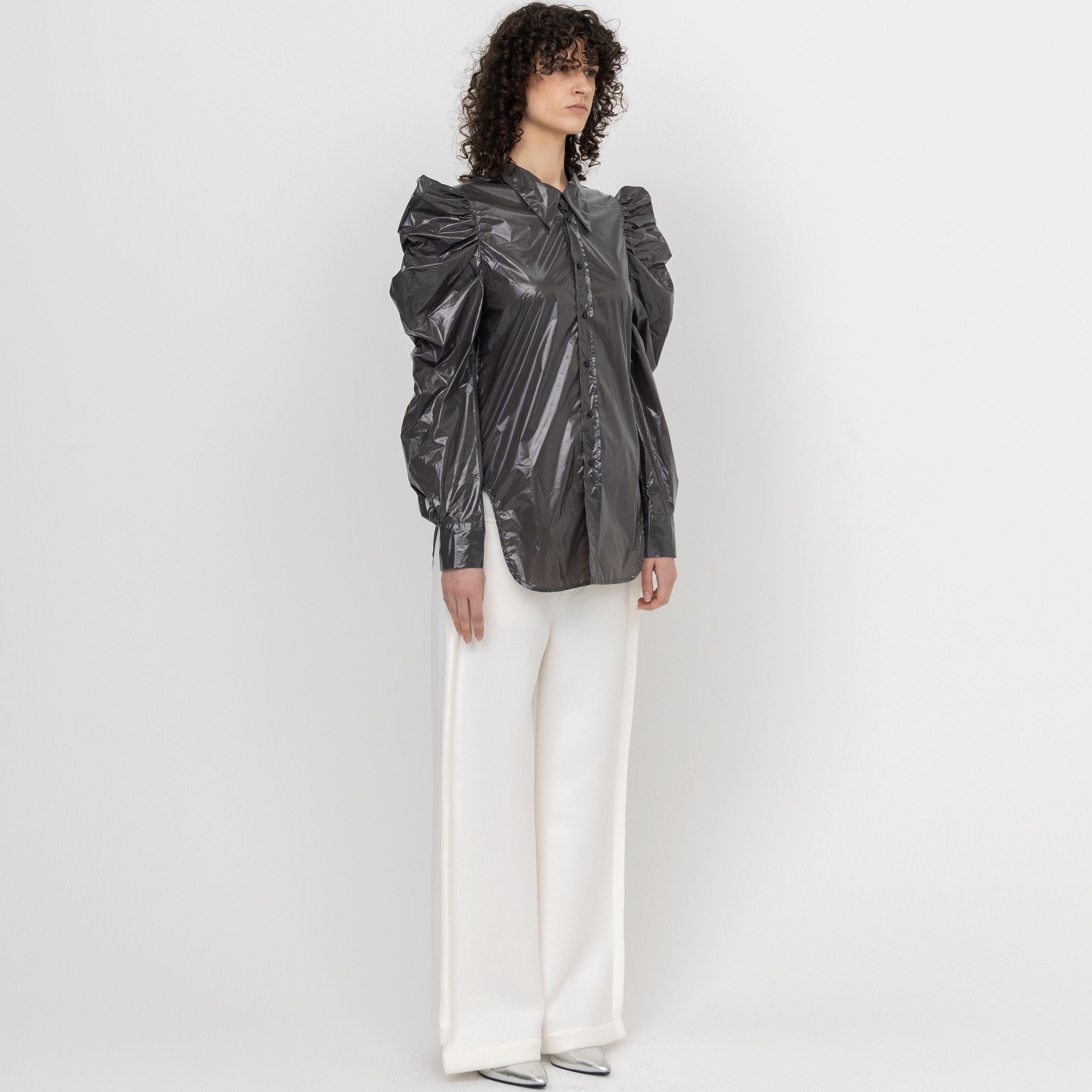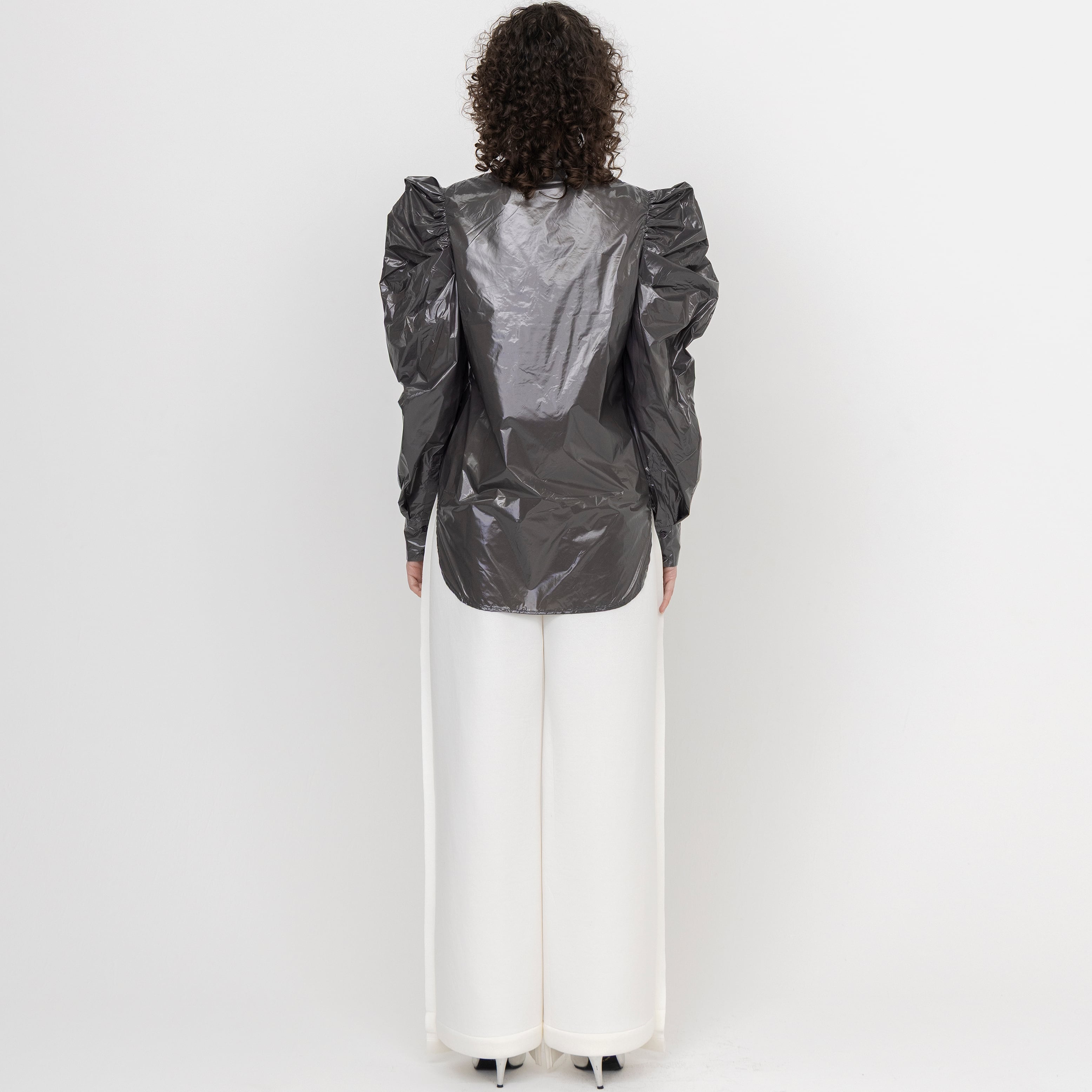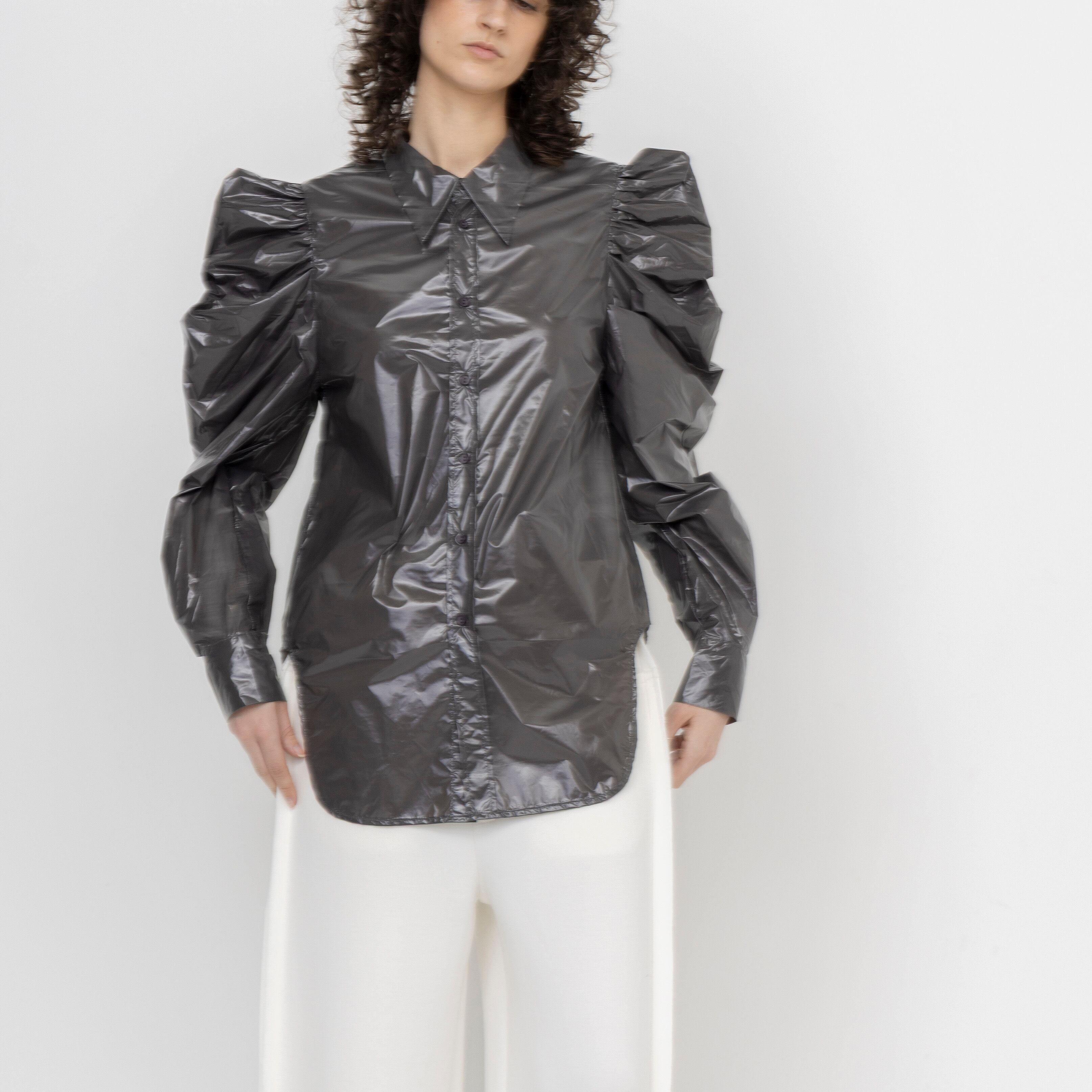 ビニールのような質感にニュアンスカラーが不思議なバランスのパフスリーブシャツ。