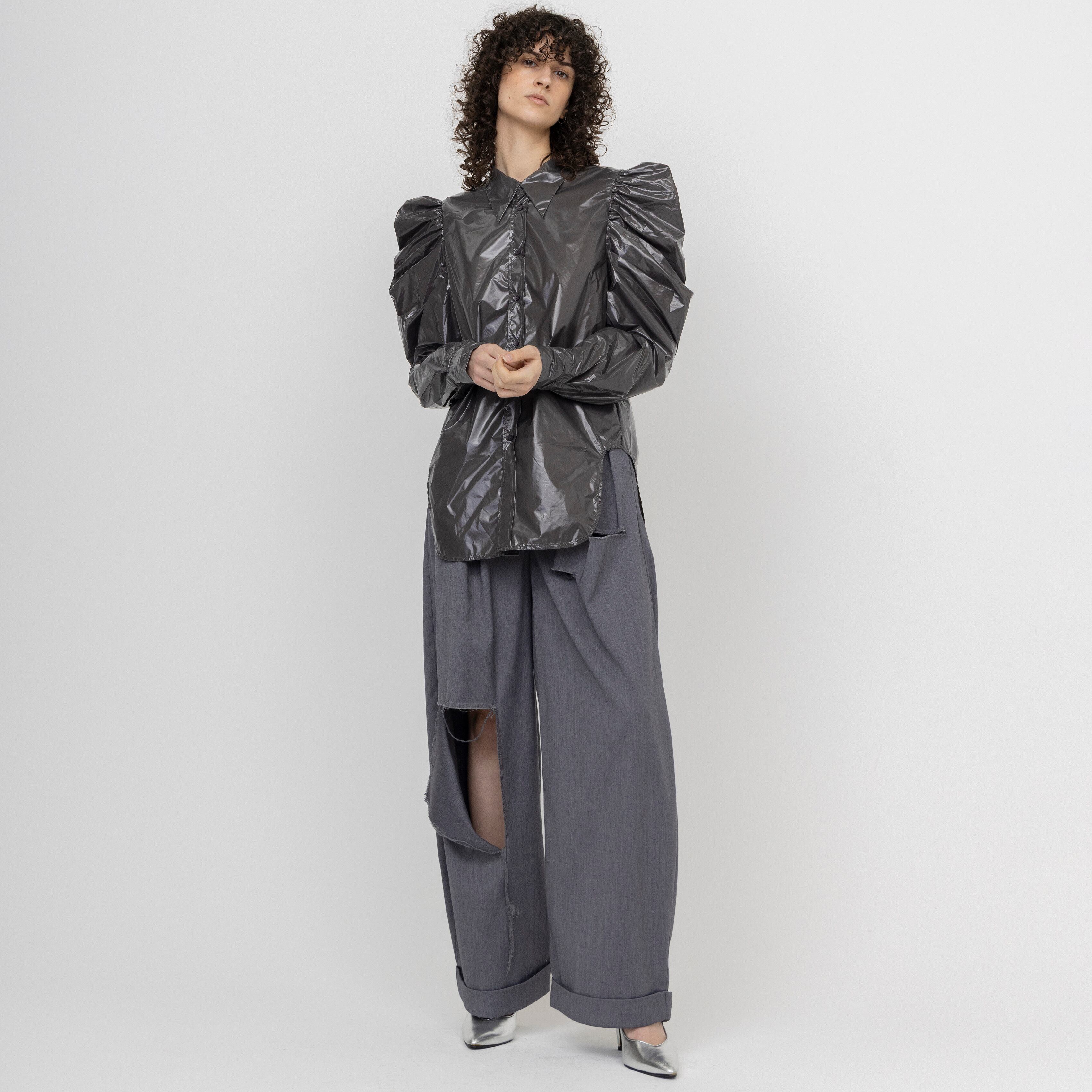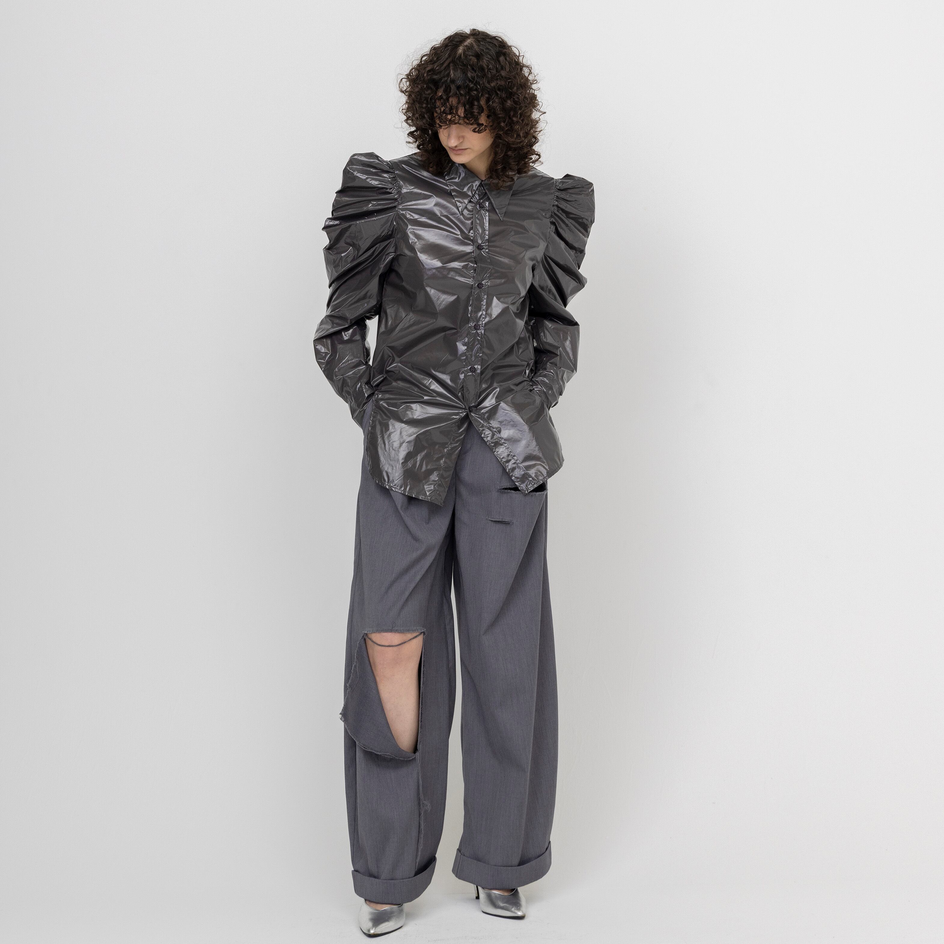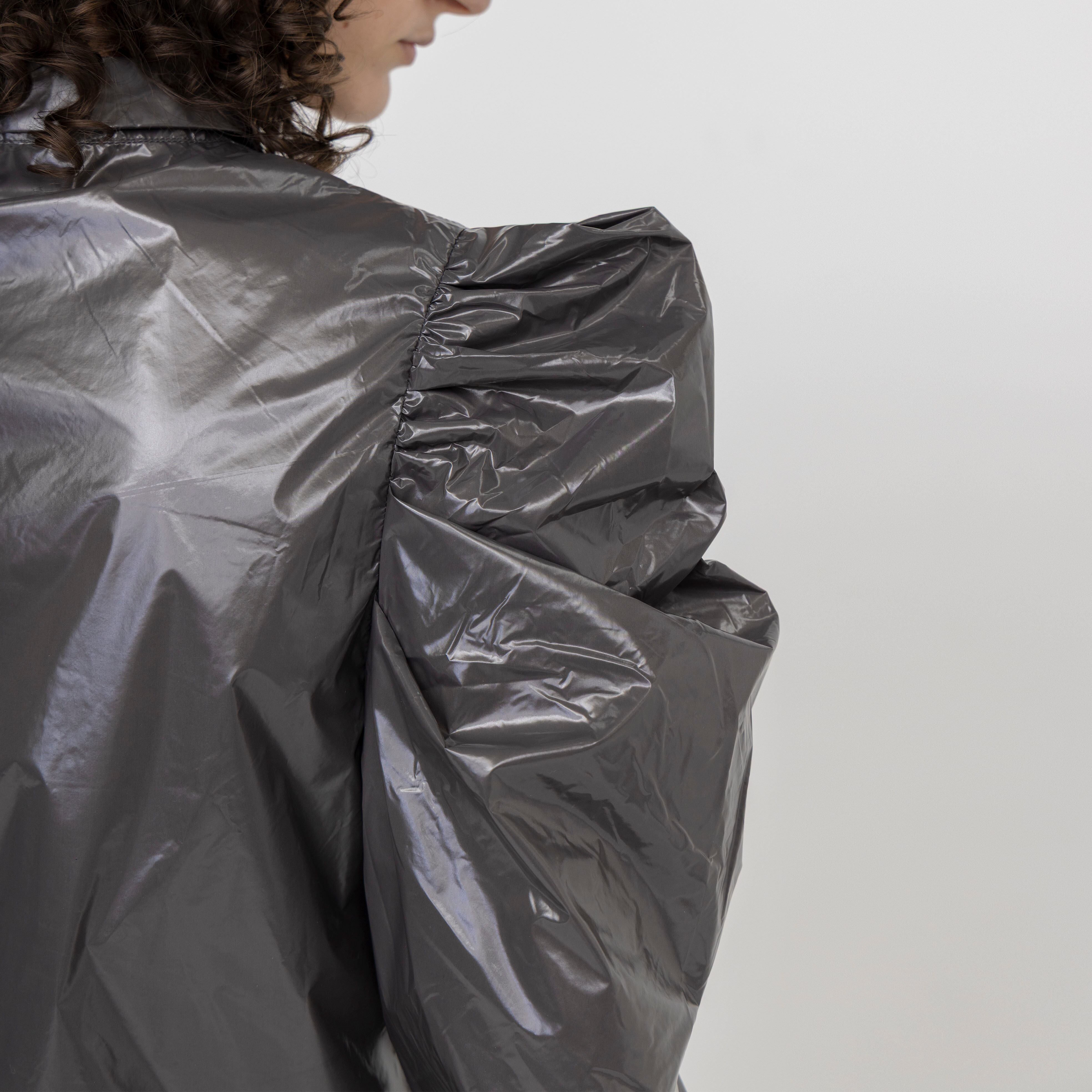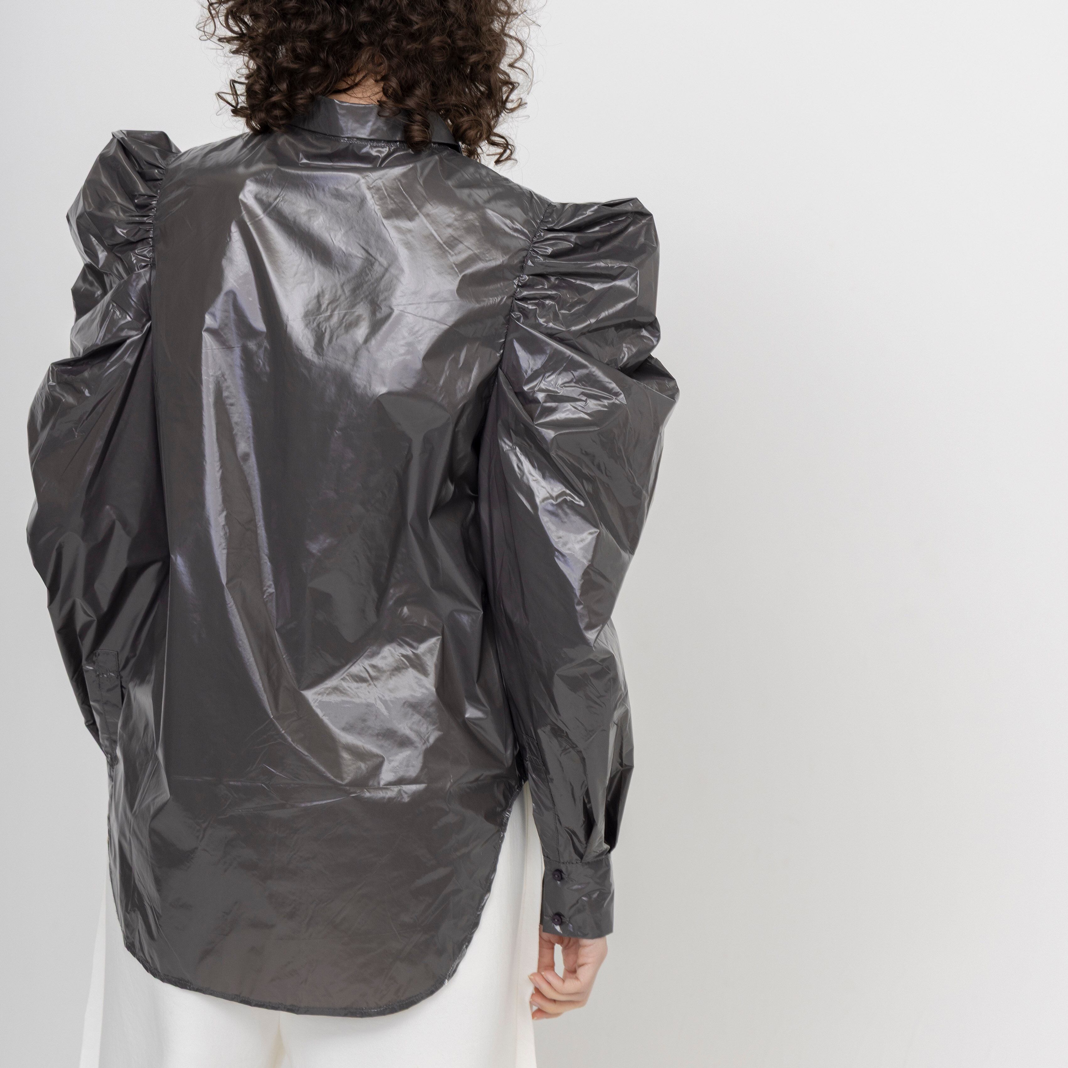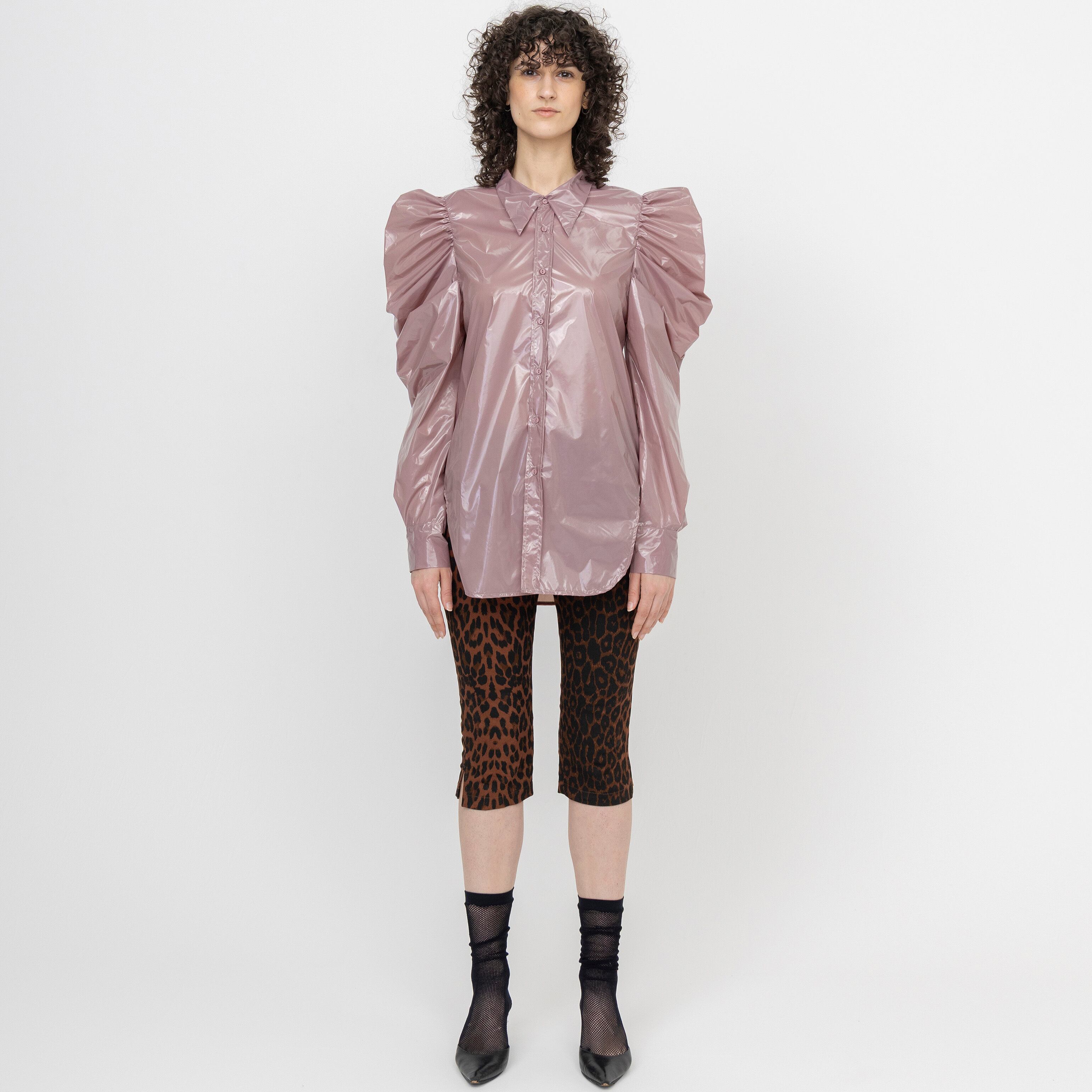 ビニールのような質感にニュアンスカラーが不思議なバランスのパフスリーブシャツ。