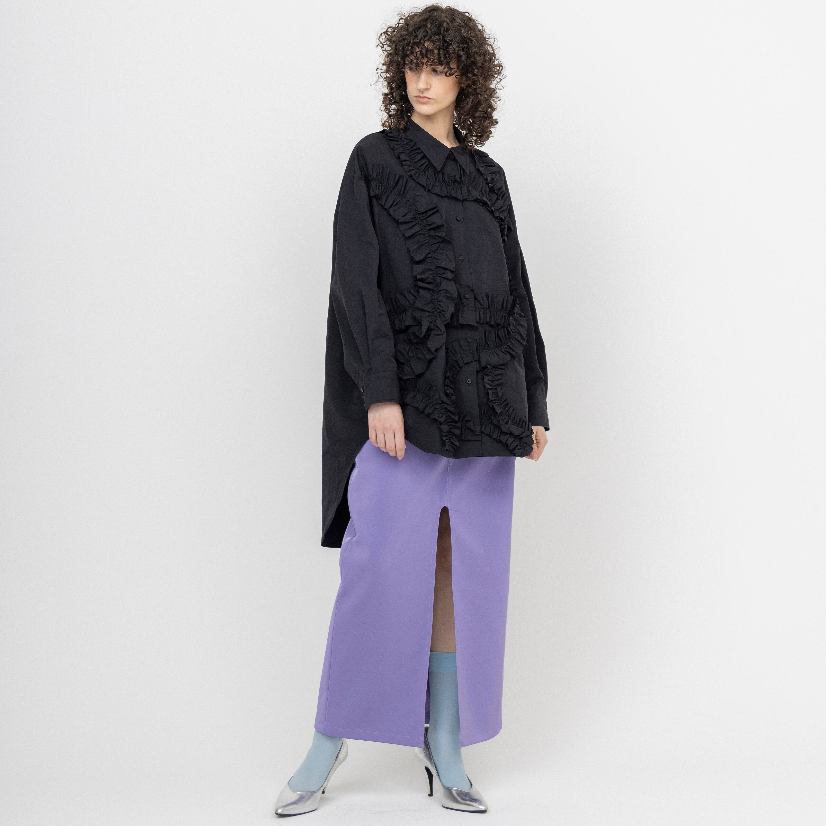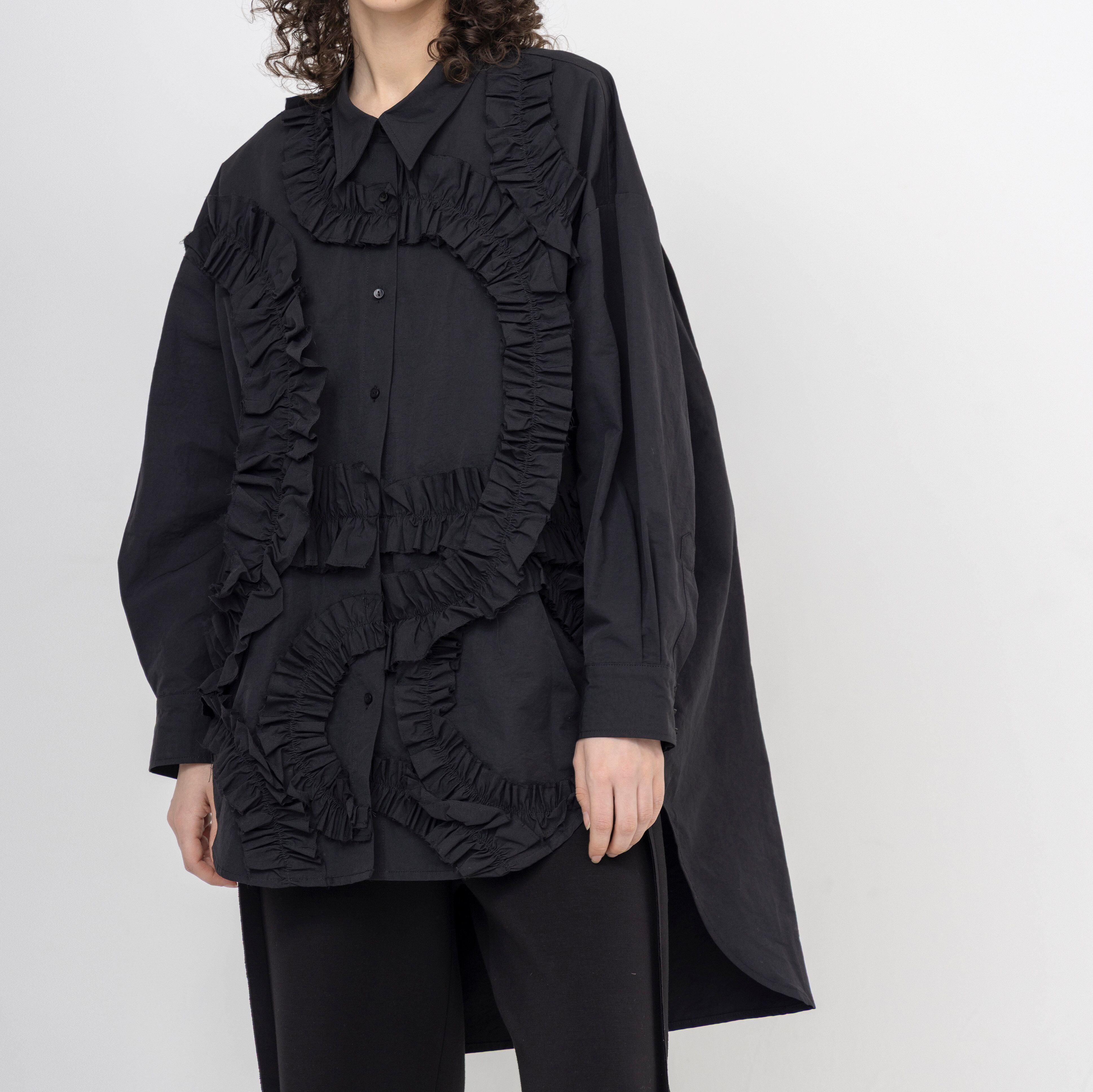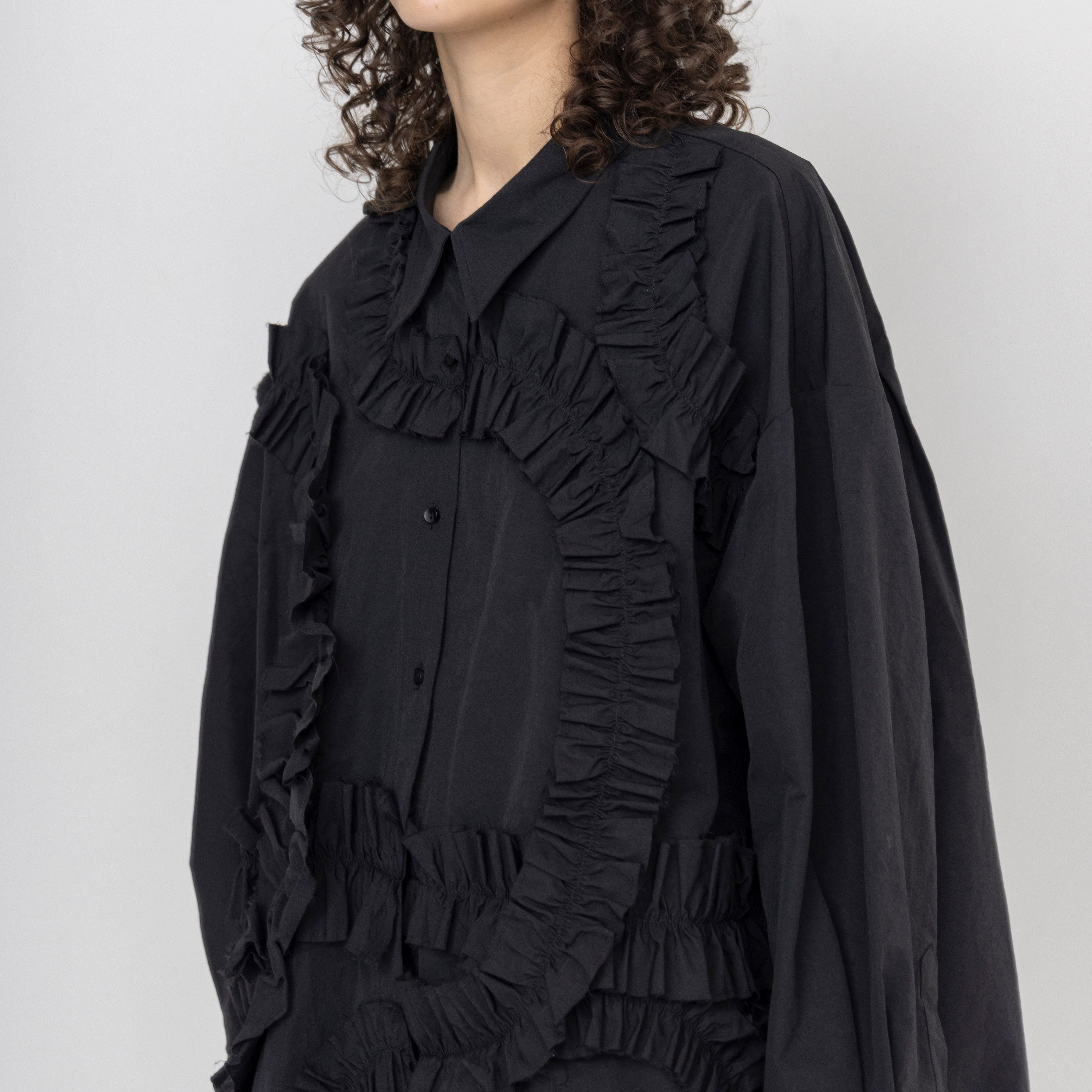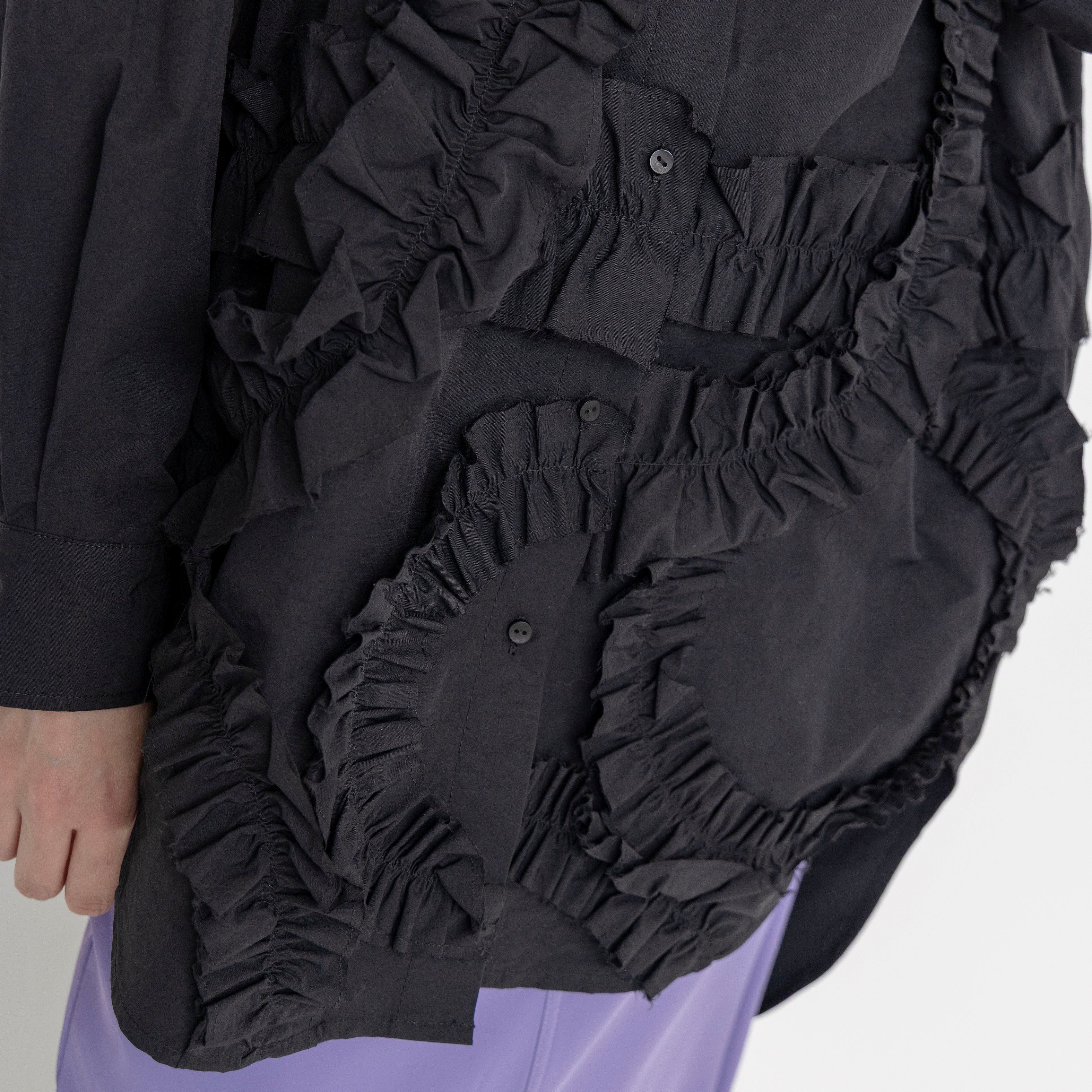 切りっぱなしのフリルを大胆にあしらった紙のような質感のオーバーシャツ。