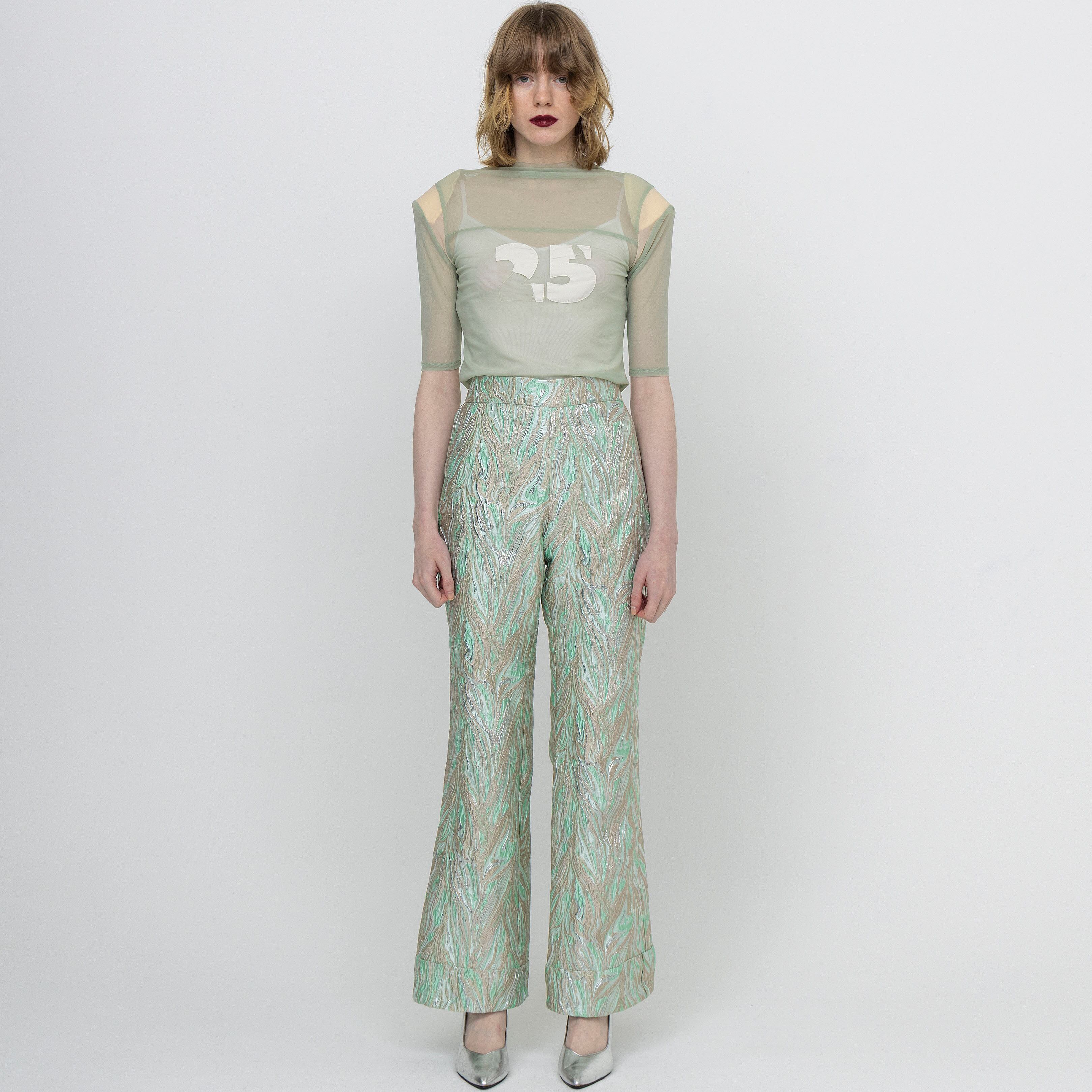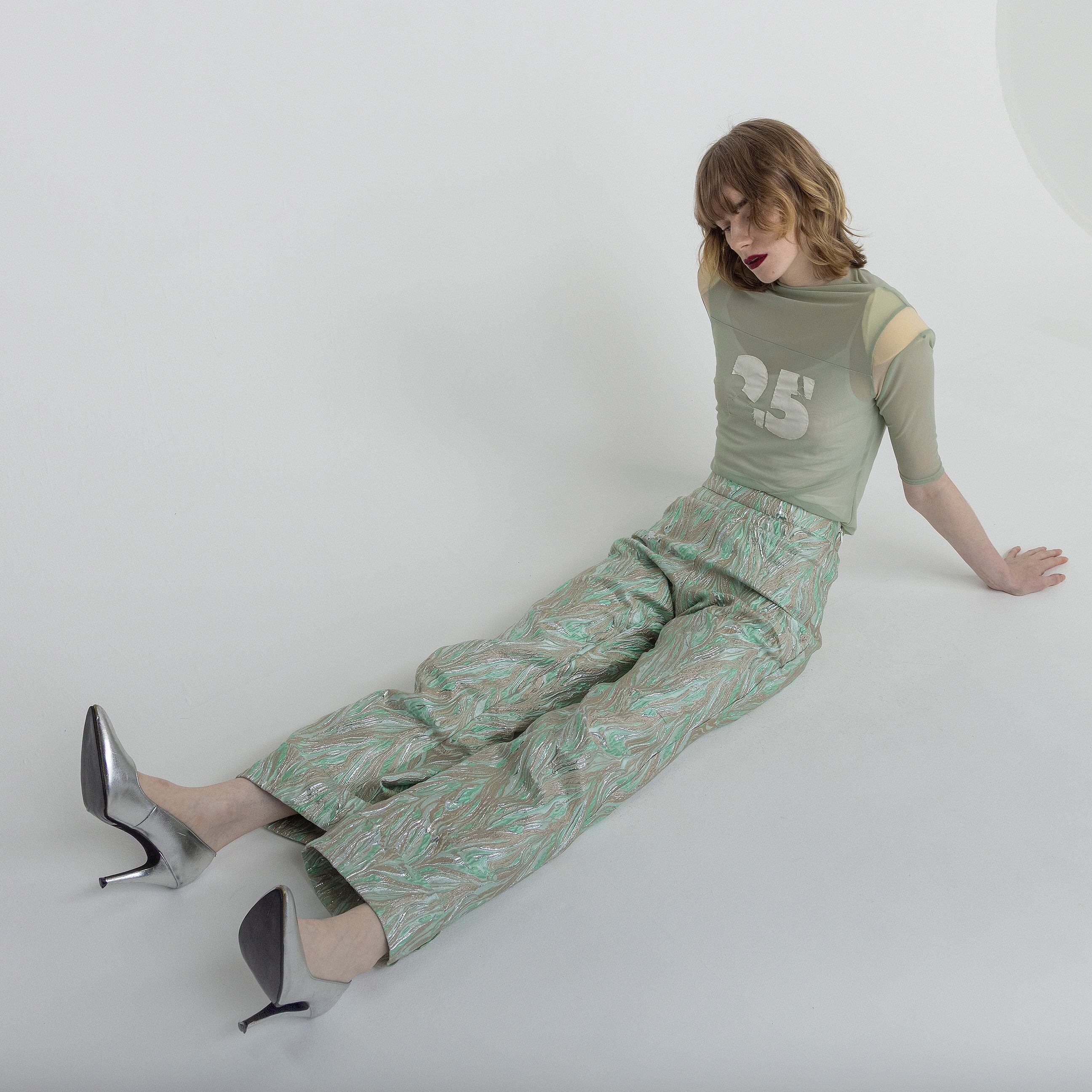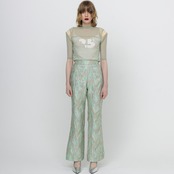 女性らしいシアー素材にショルダーパッドとスポーティな印象のナンバーディテールを落とし込み、絶妙なアンバランス感を演出。