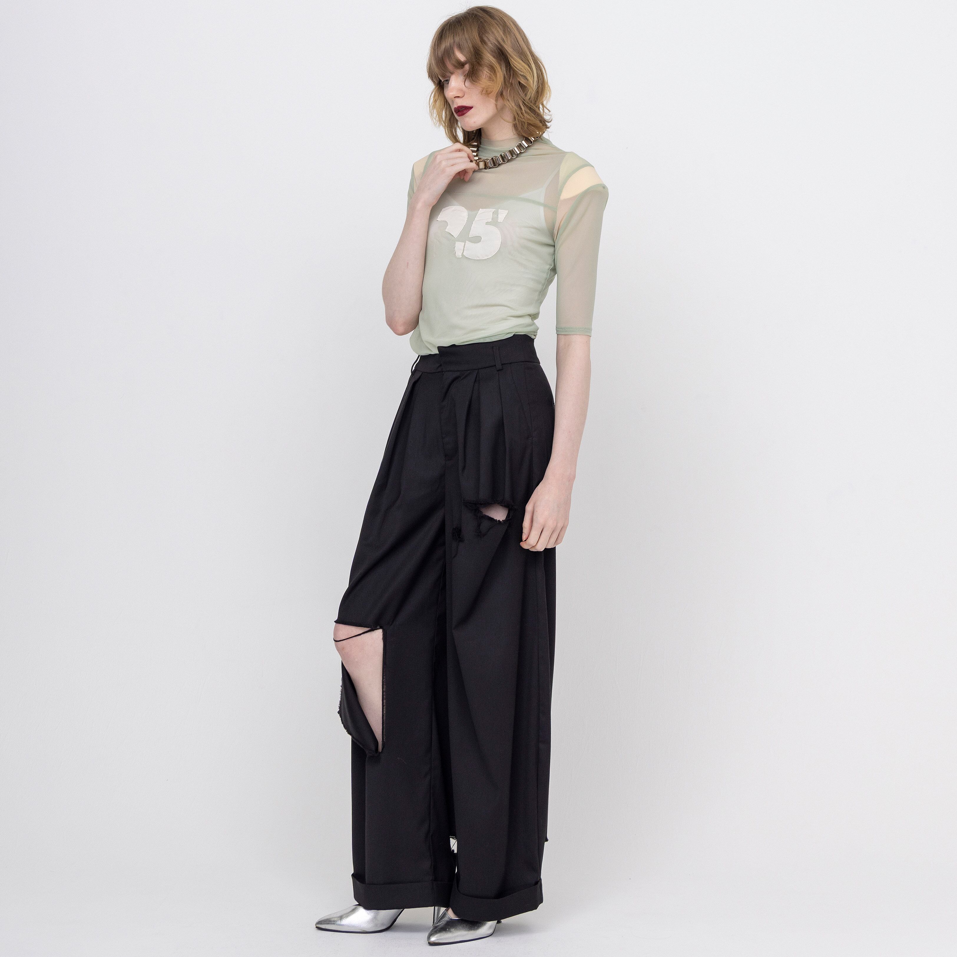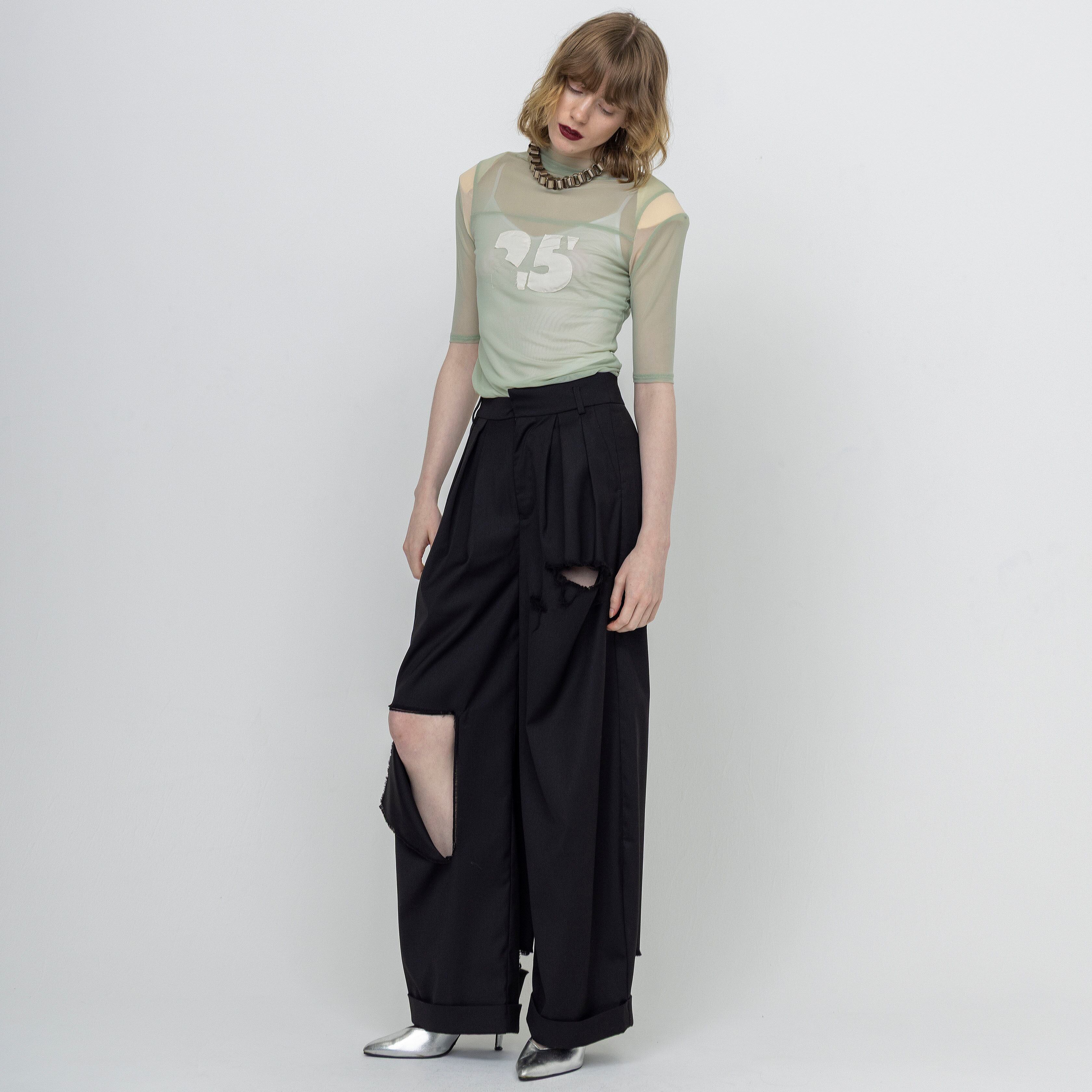まるで破れたようなナンバーディテールが印象的なシアートップス。