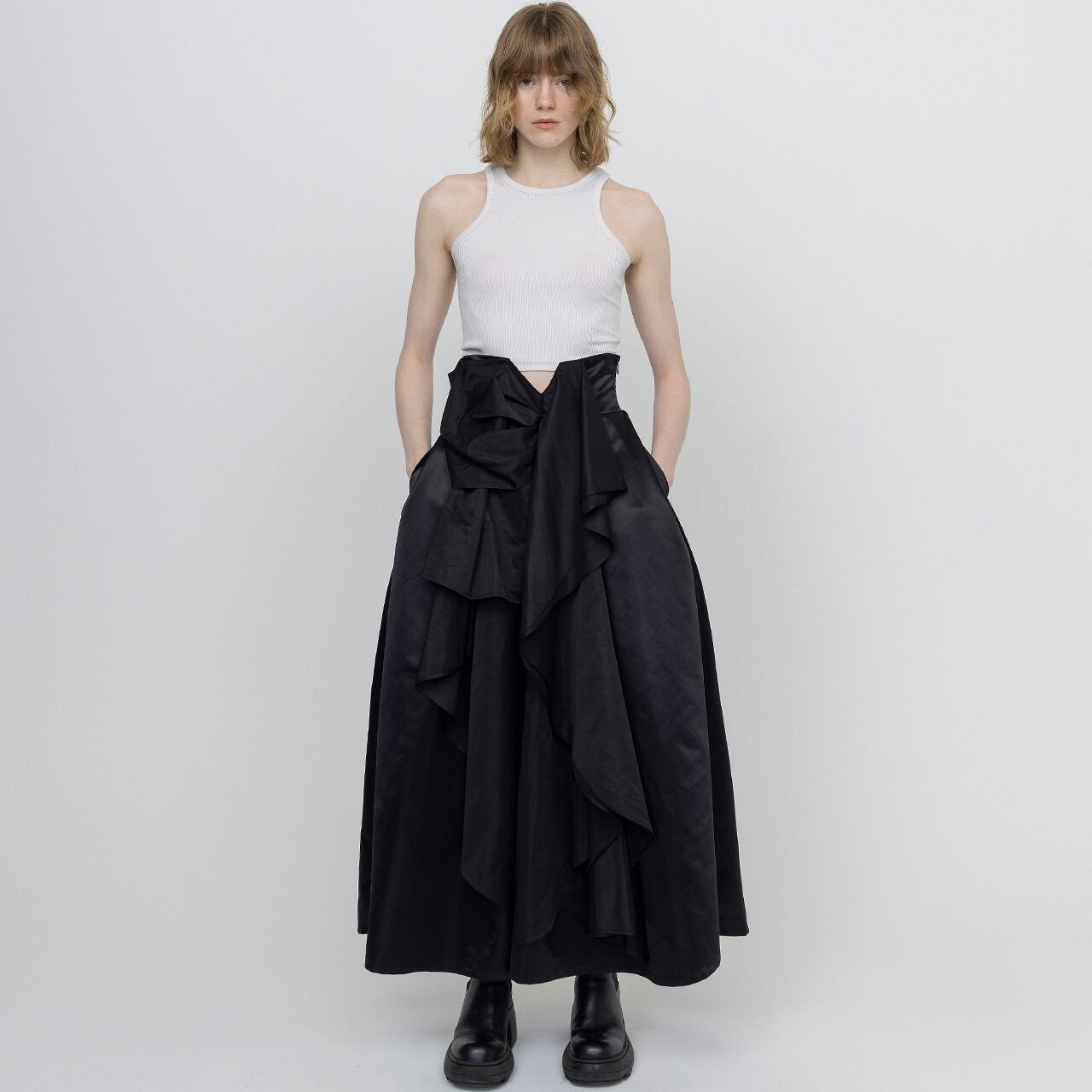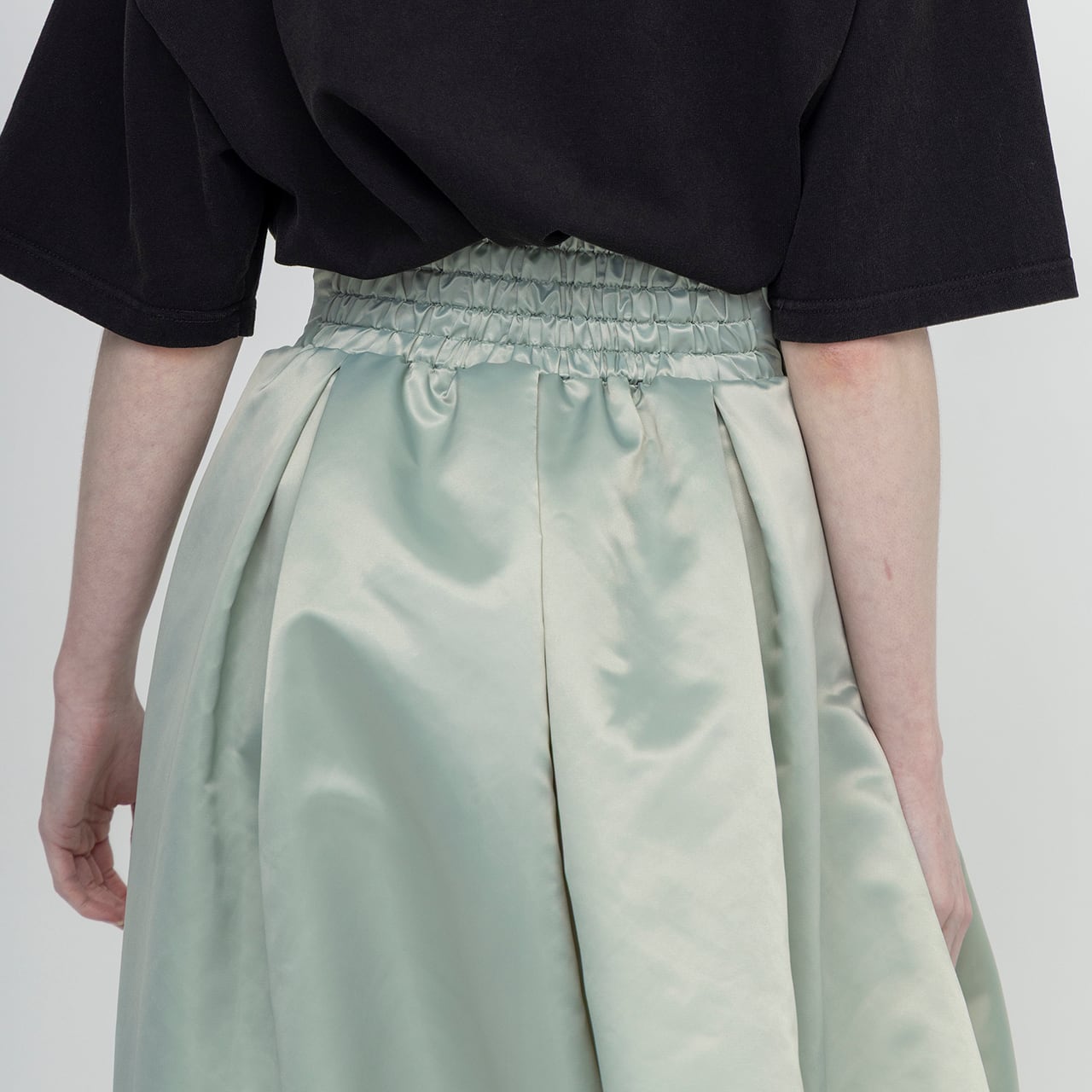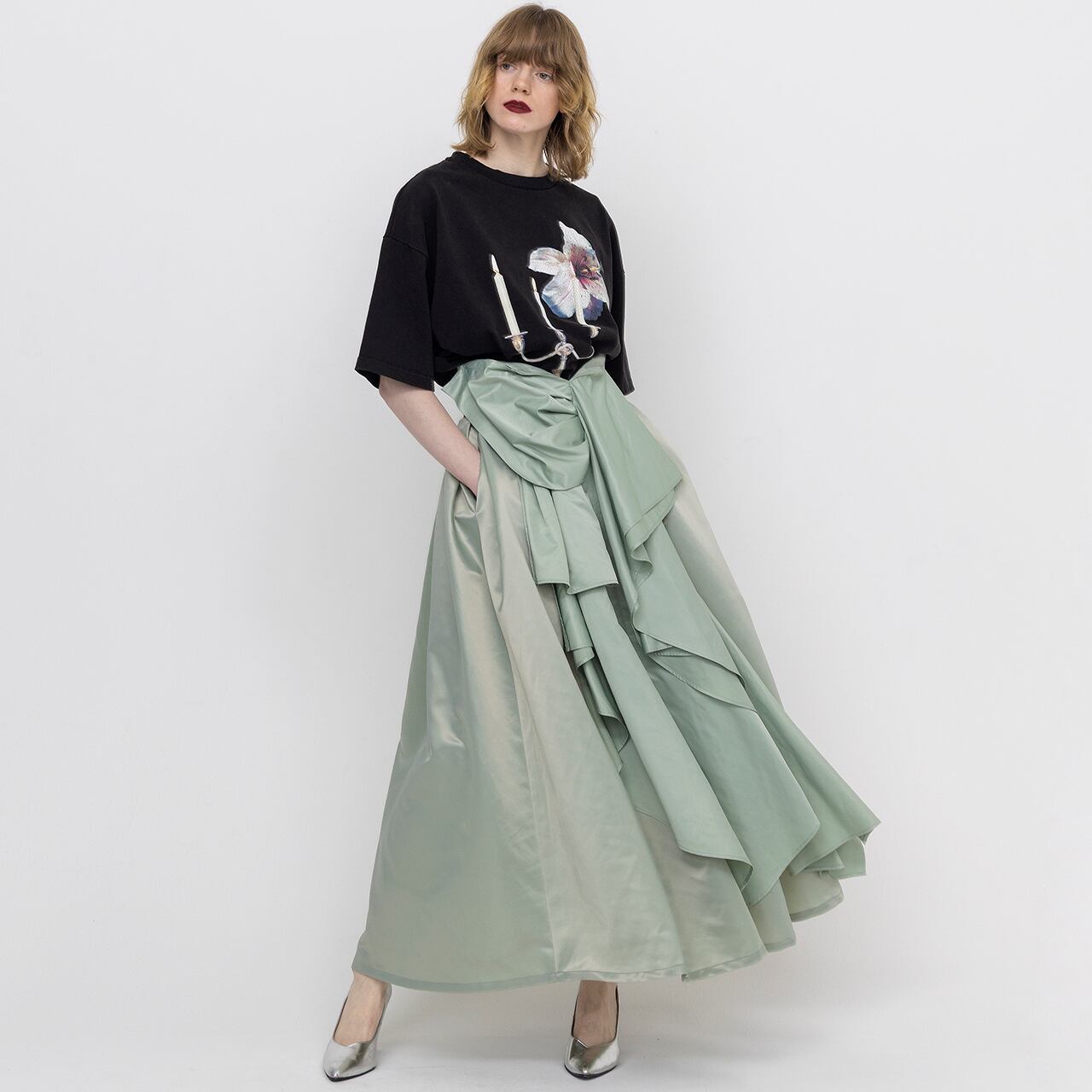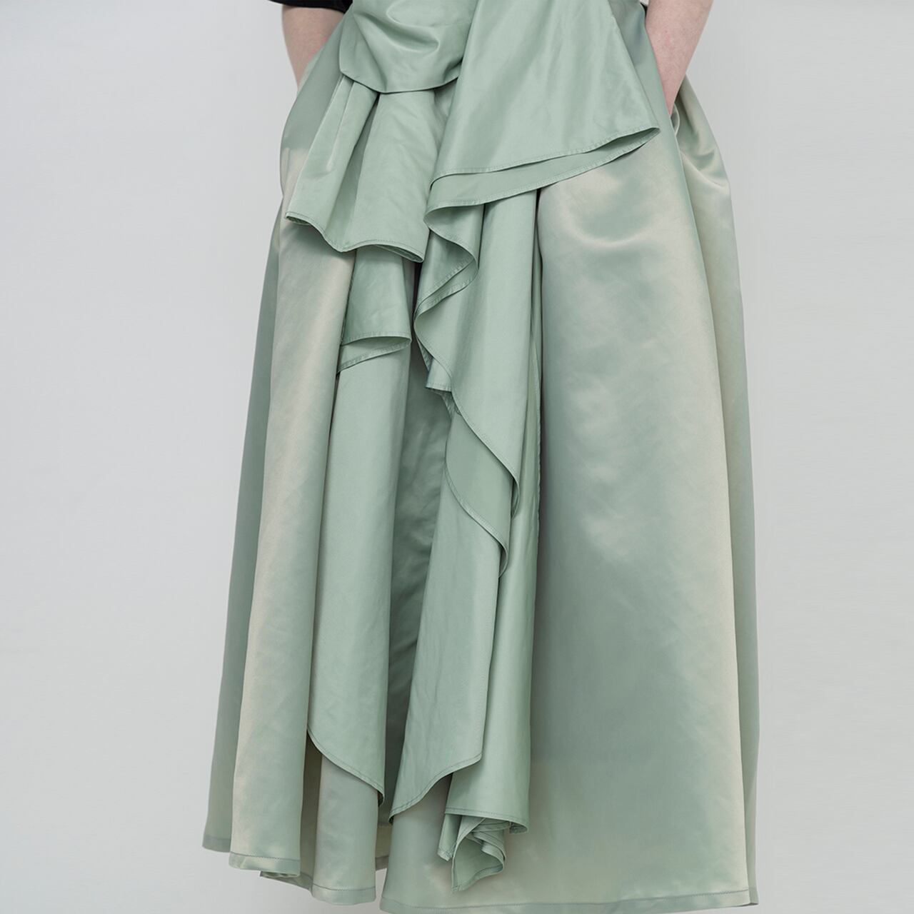 絶妙な光沢感とマキシ丈でモードな雰囲気を演出。