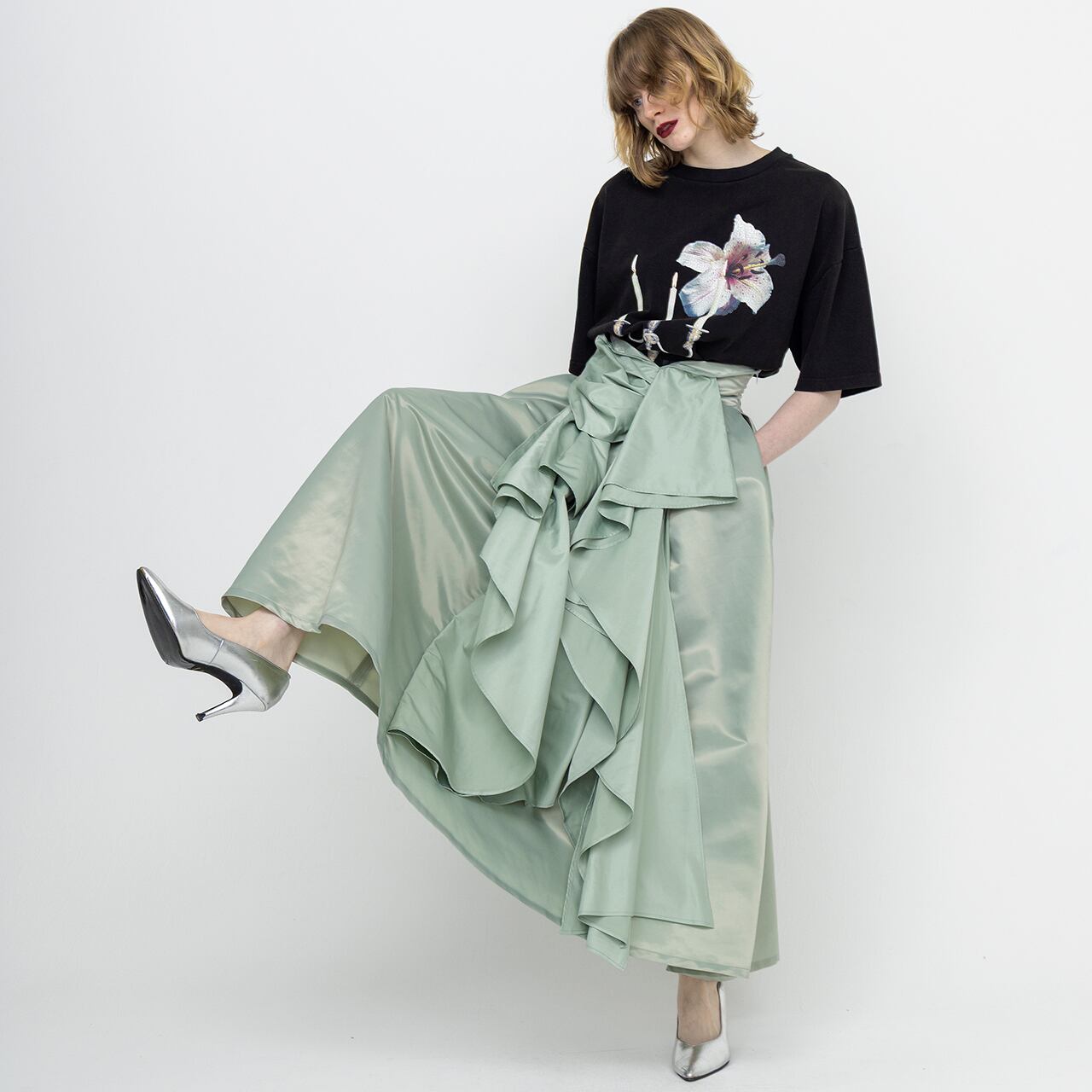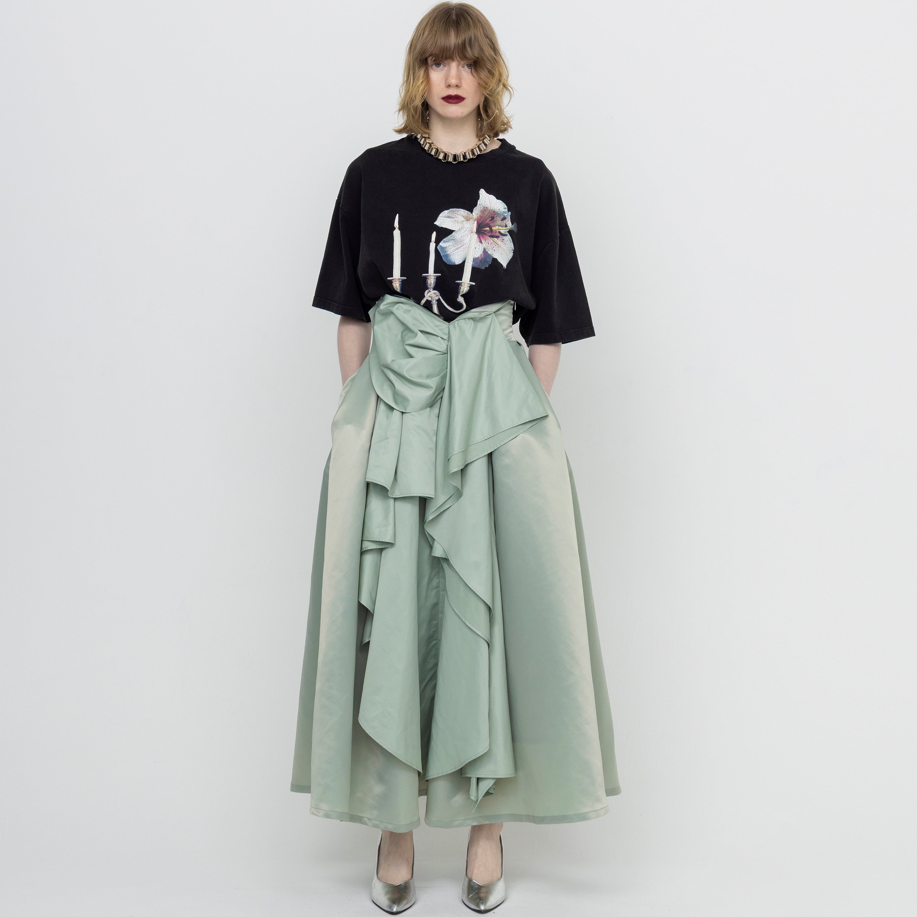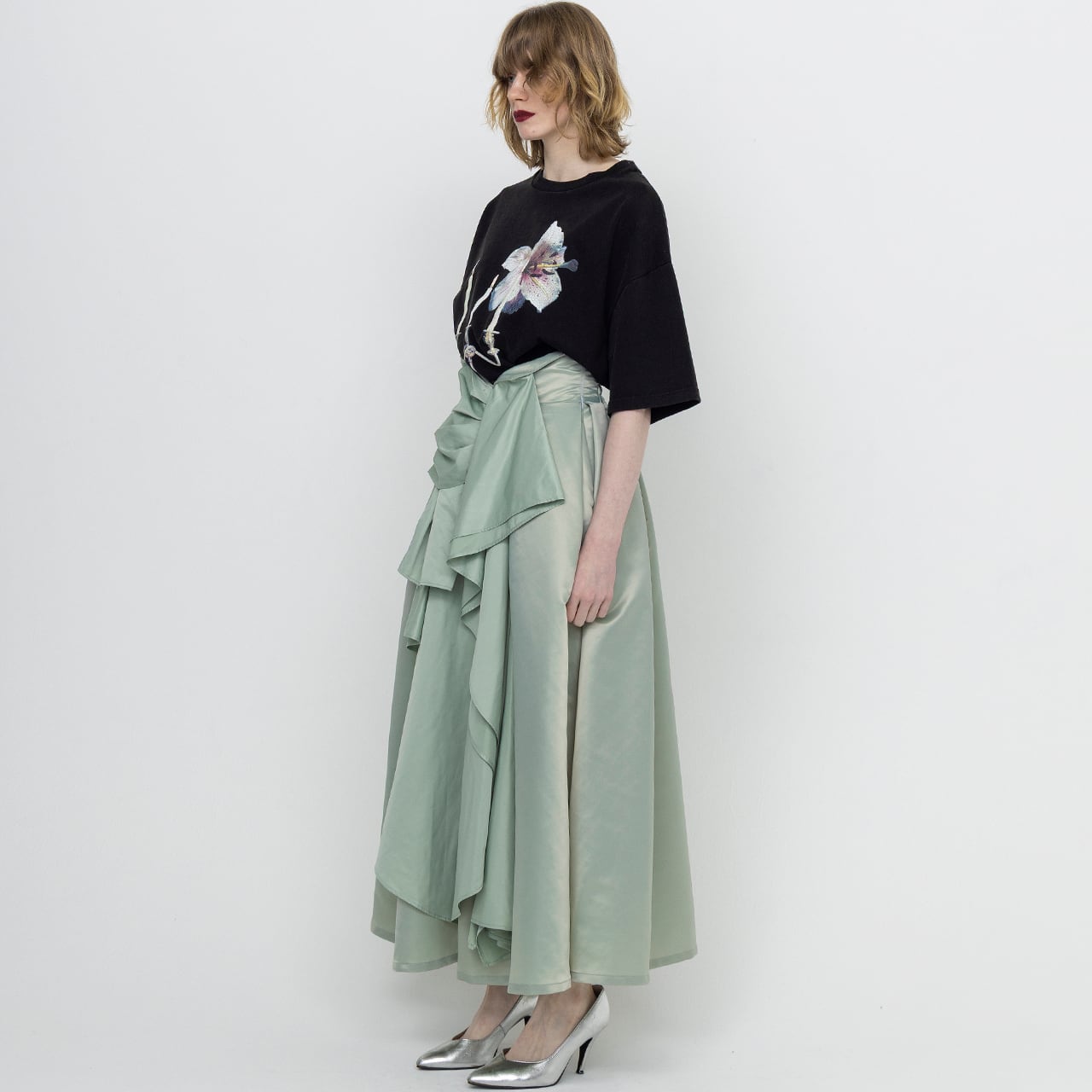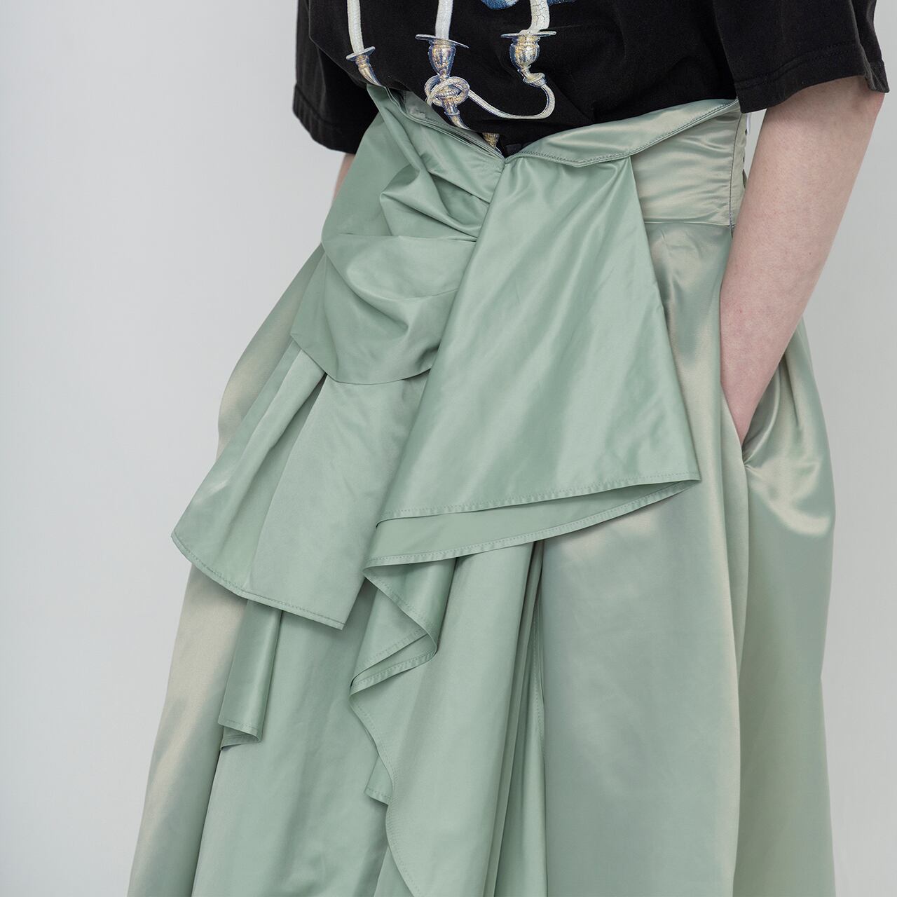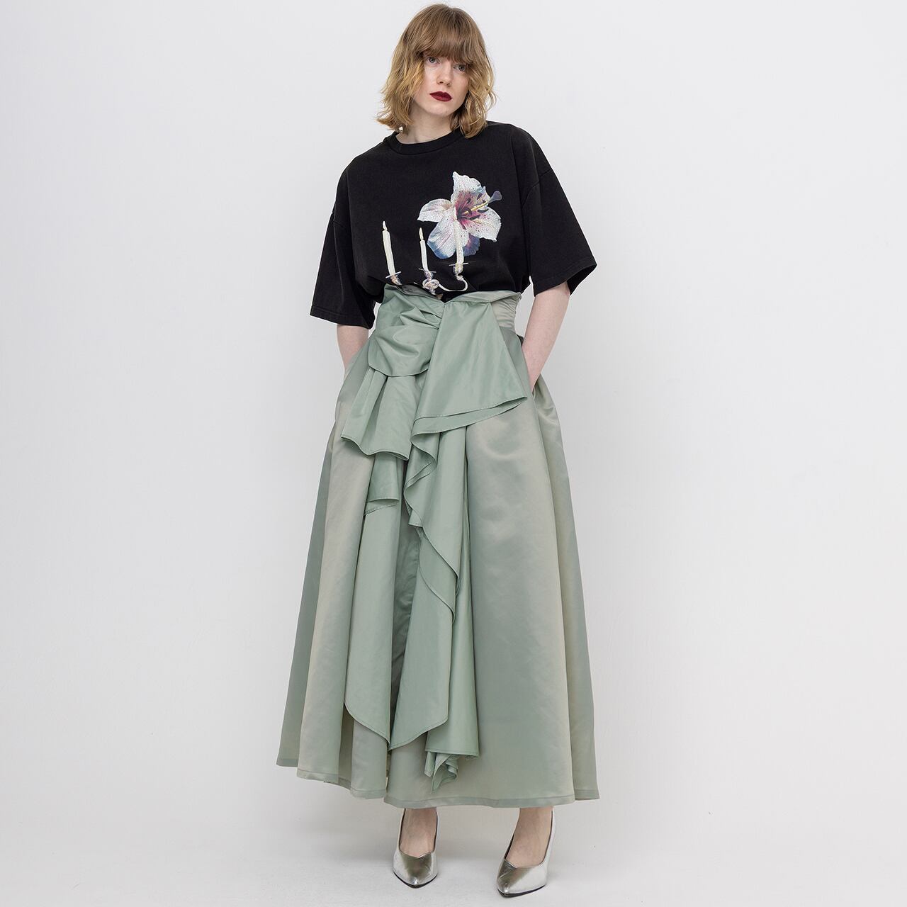 絶妙な光沢感とマキシ丈でモードな雰囲気を演出。