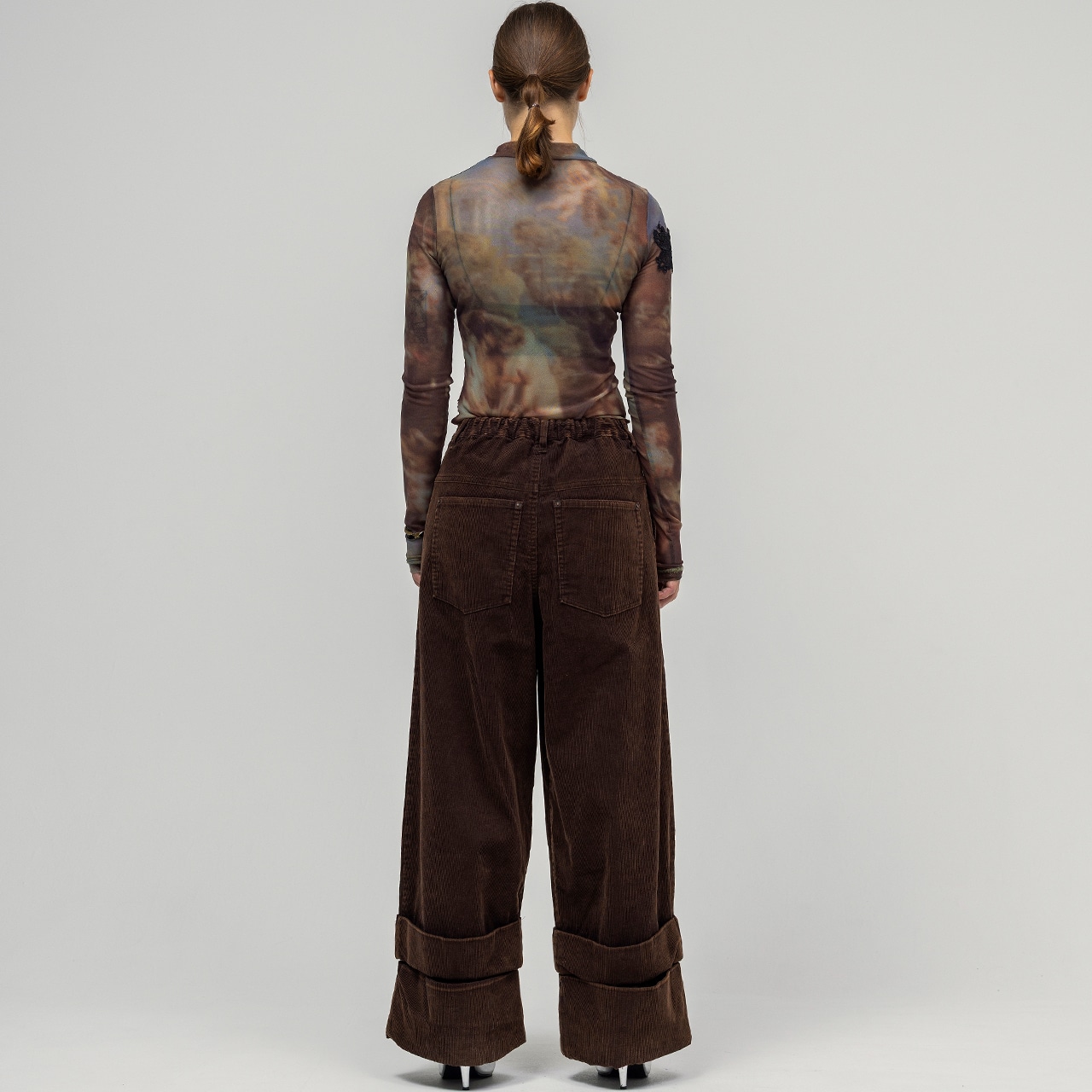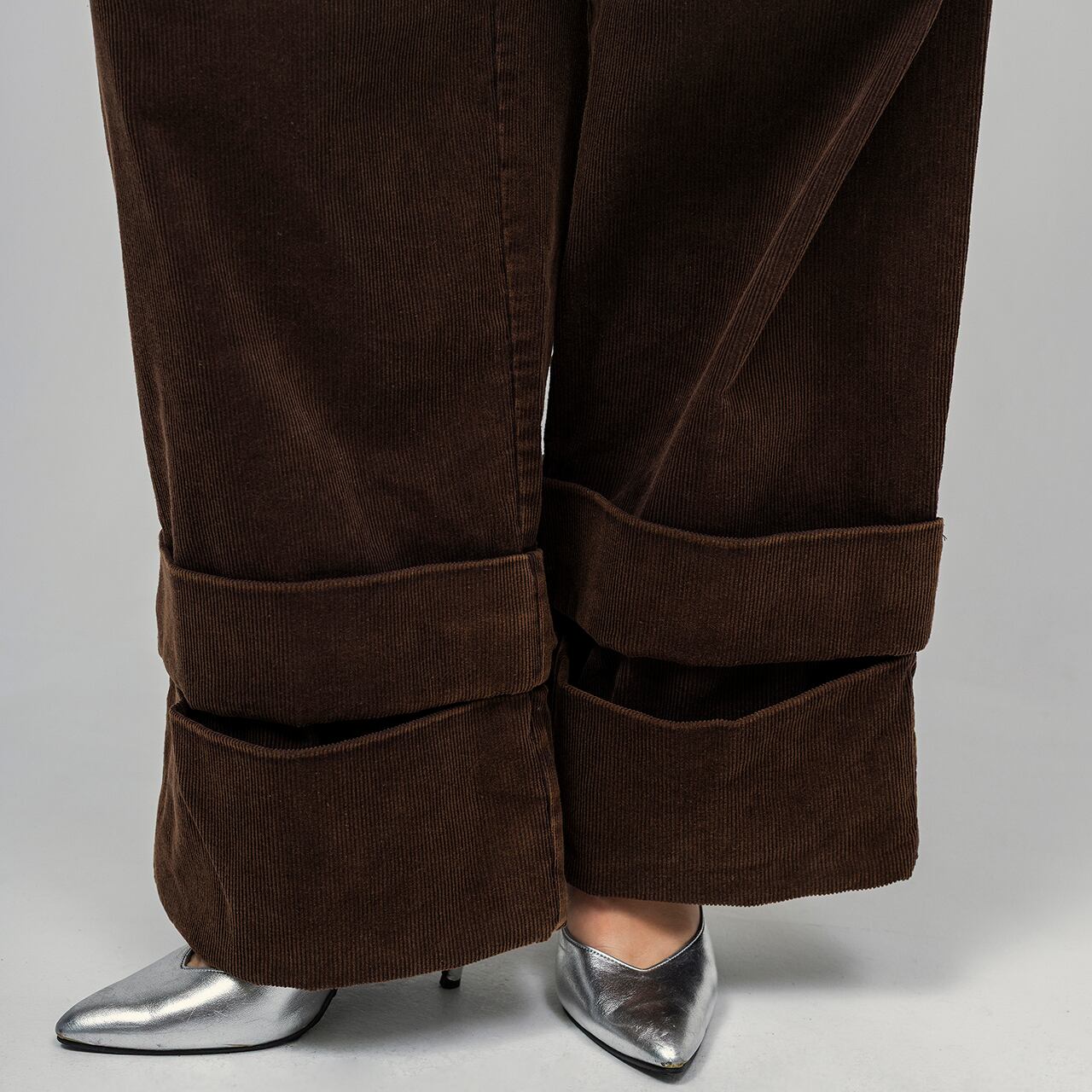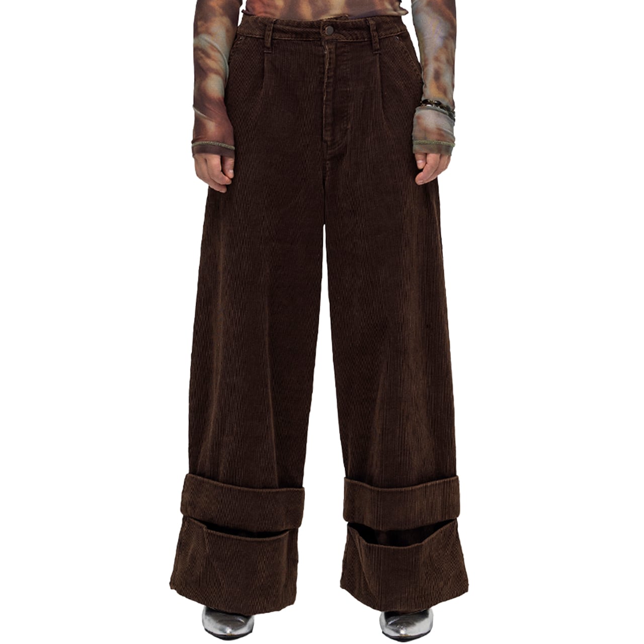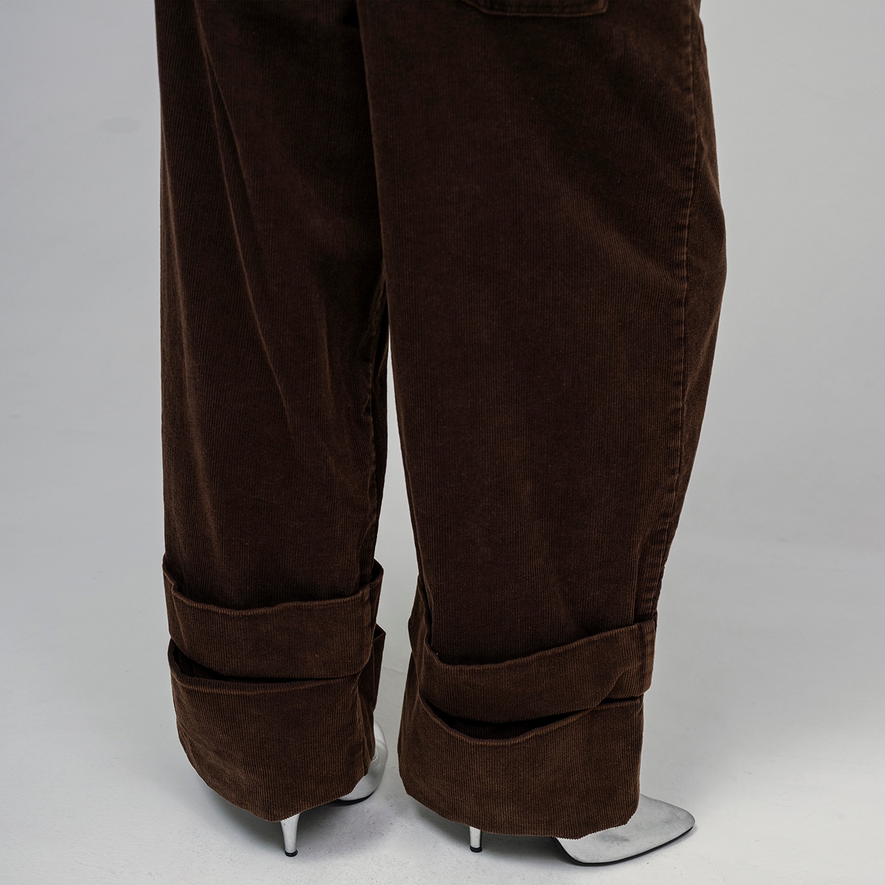裾を大胆に折り返したダブルデザインが特徴的な、重厚感と抜け感を纏うワイドシルエットのコーデュロイパンツ。