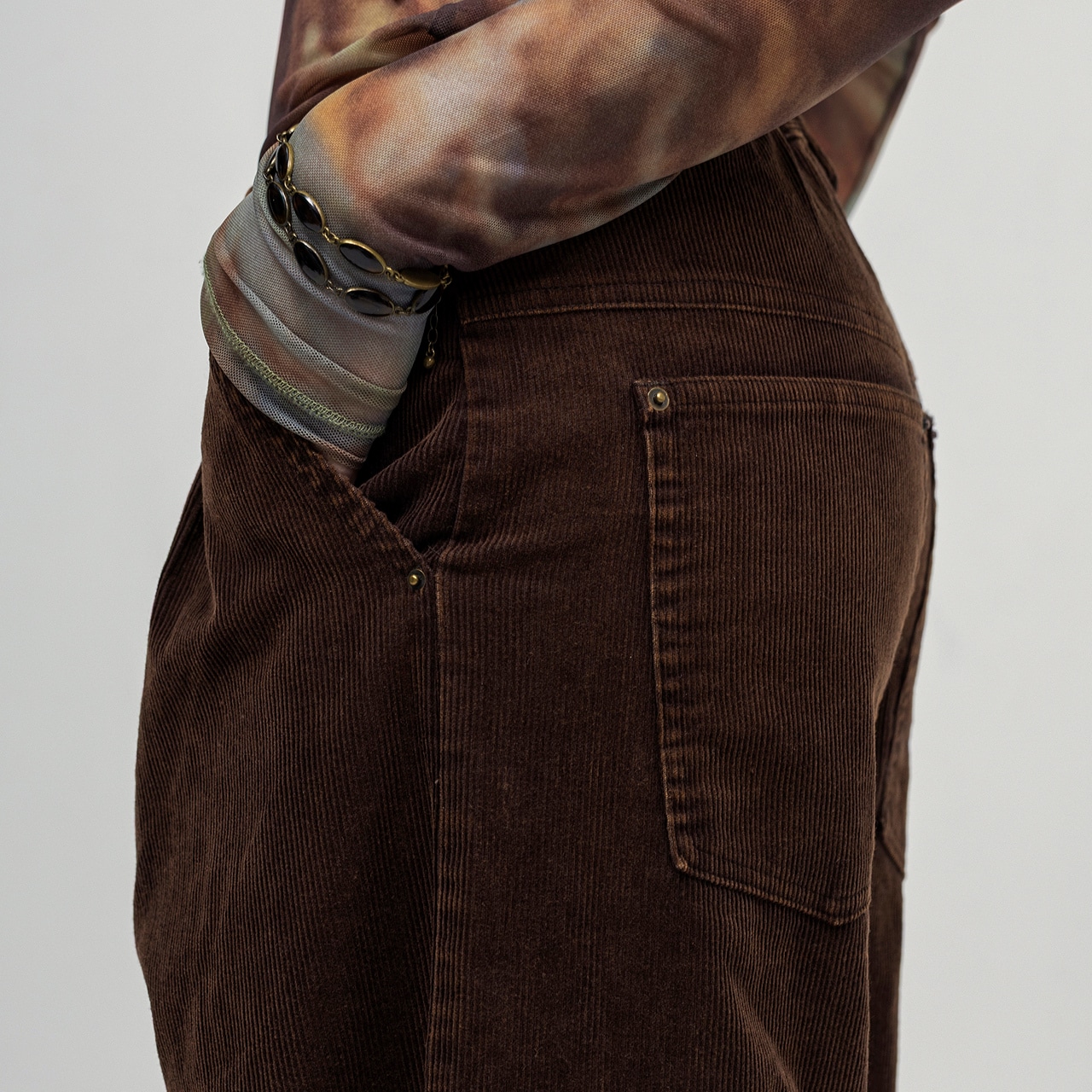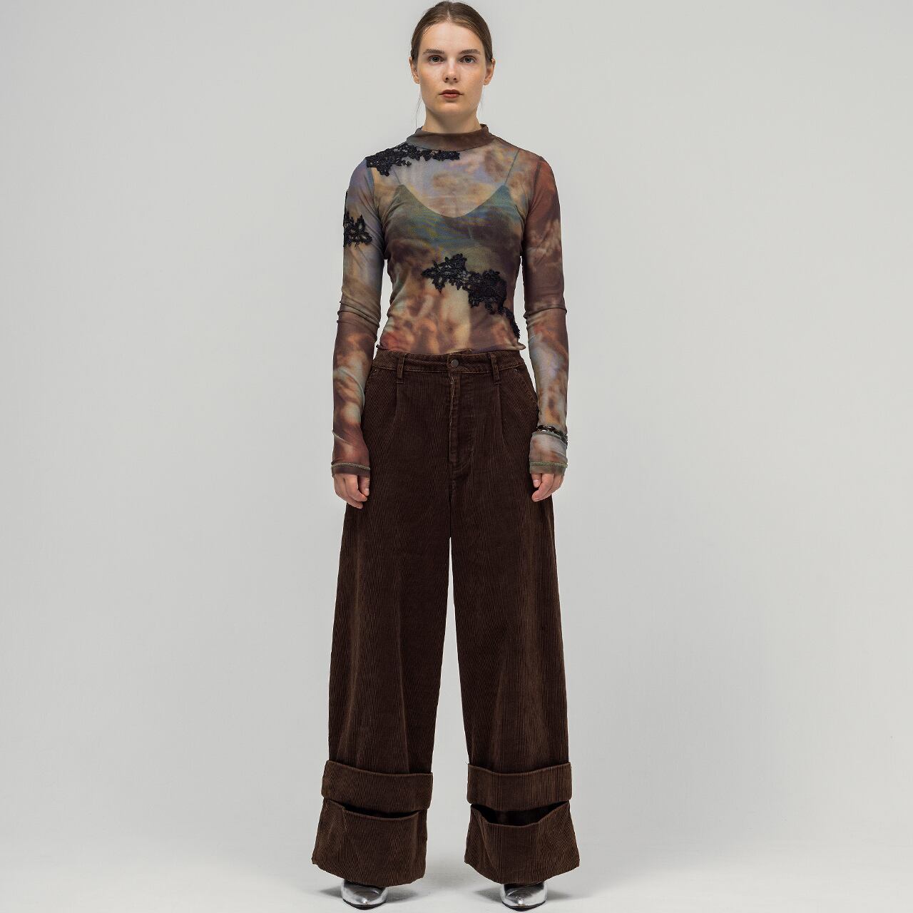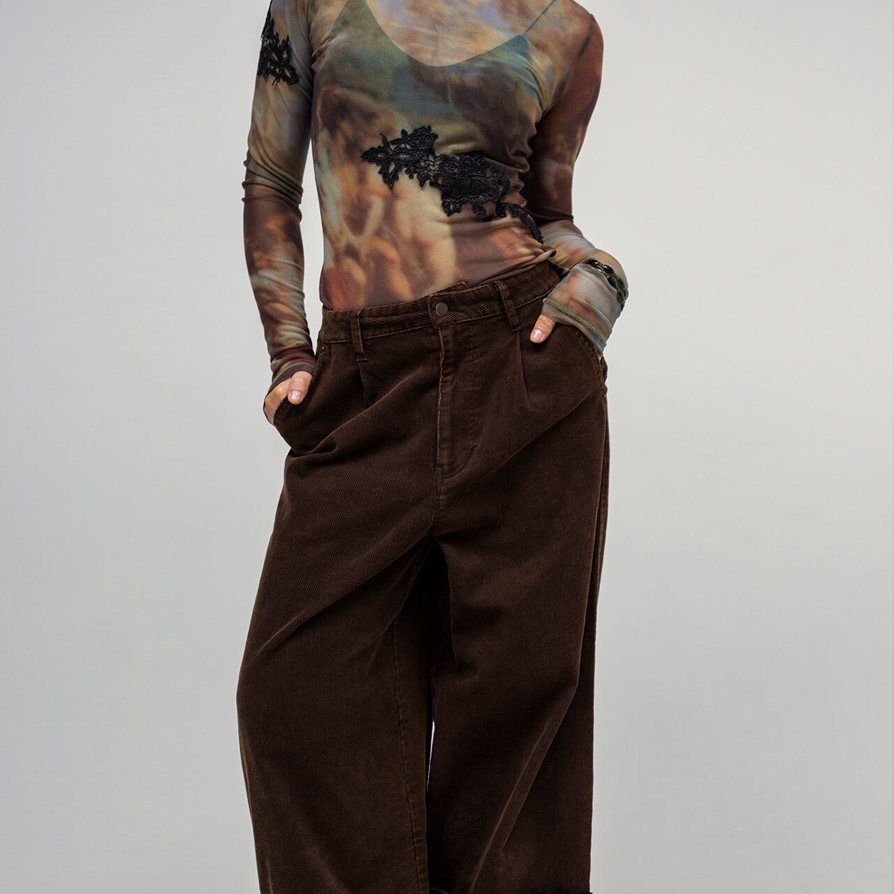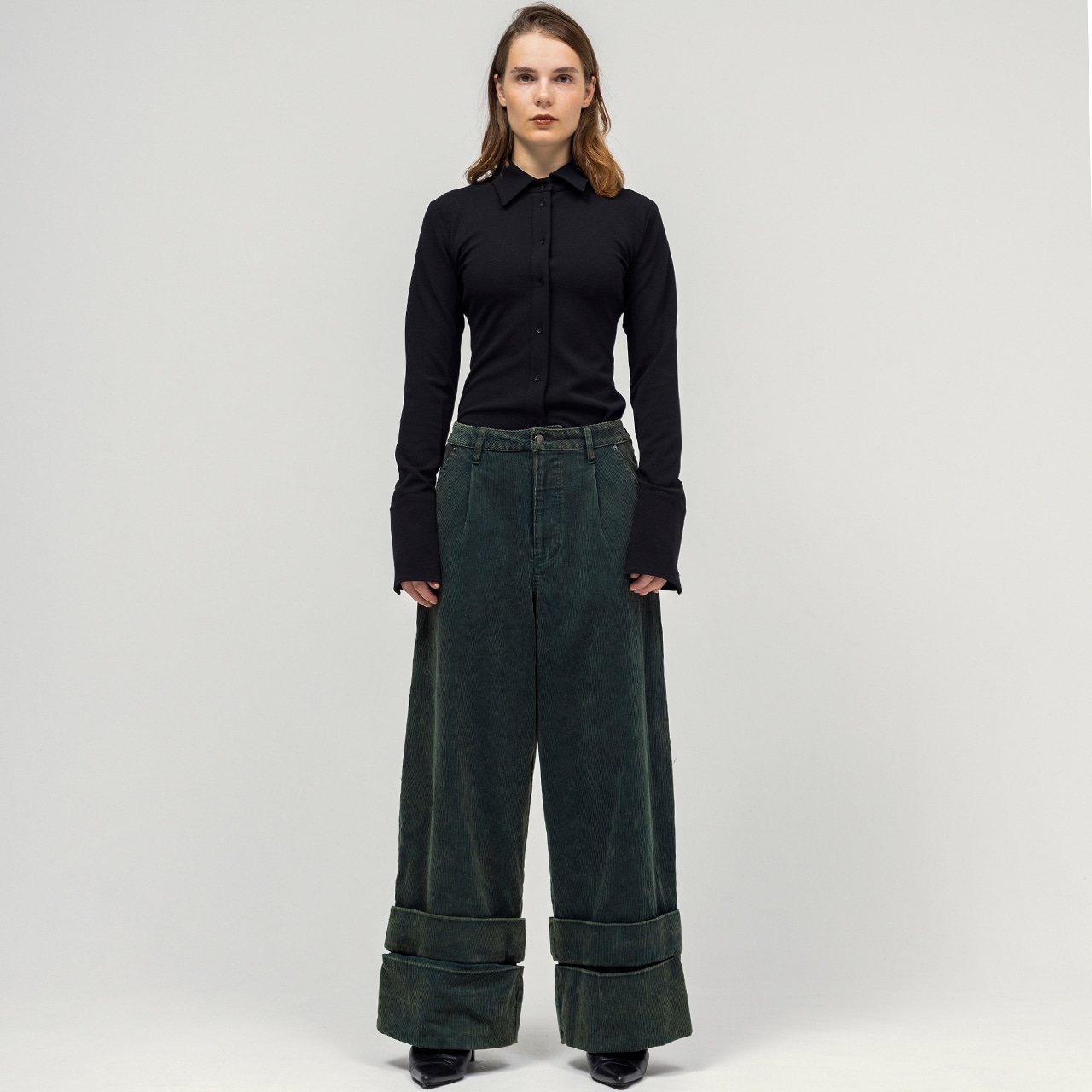 裾を大胆に折り返したダブルデザインが特徴的な、重厚感と抜け感を纏うワイドシルエットのコーデュロイパンツ。