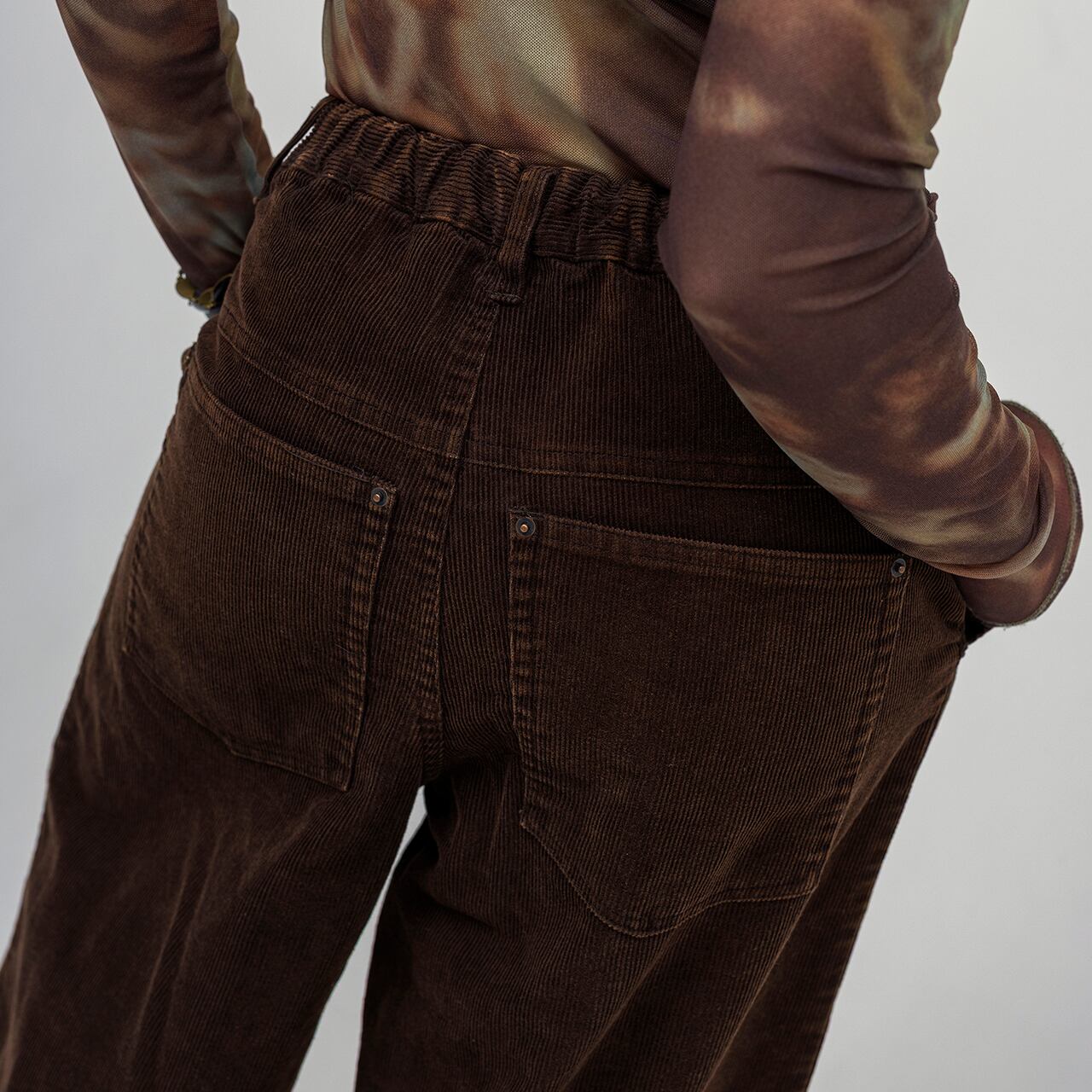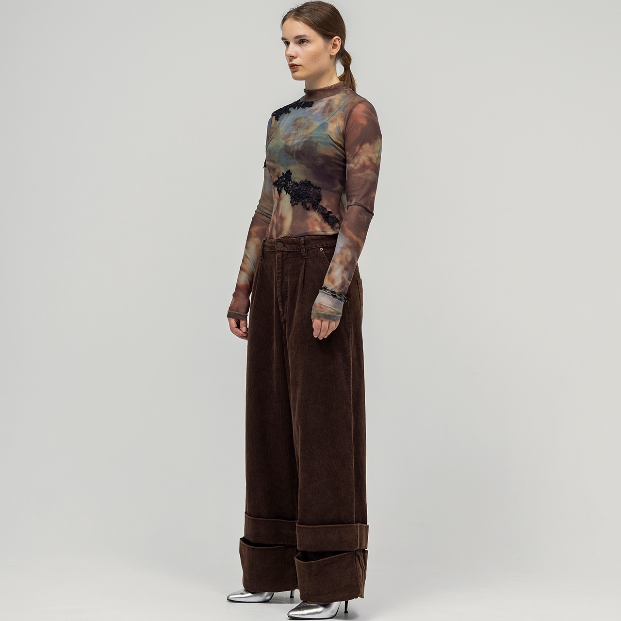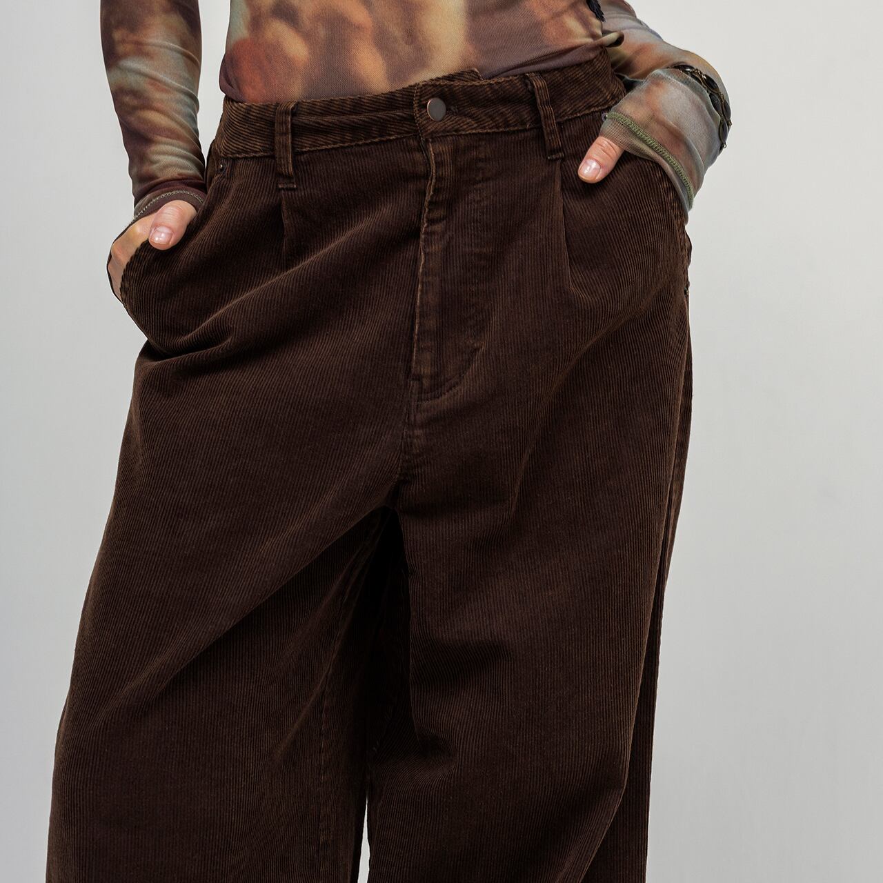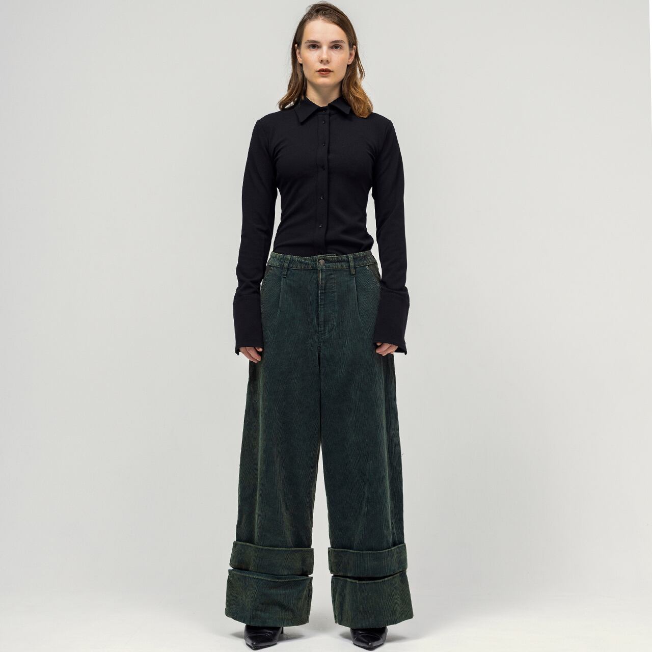 裾を大胆に折り返したダブルデザインが特徴的な、重厚感と抜け感を纏うワイドシルエットのコーデュロイパンツ。
