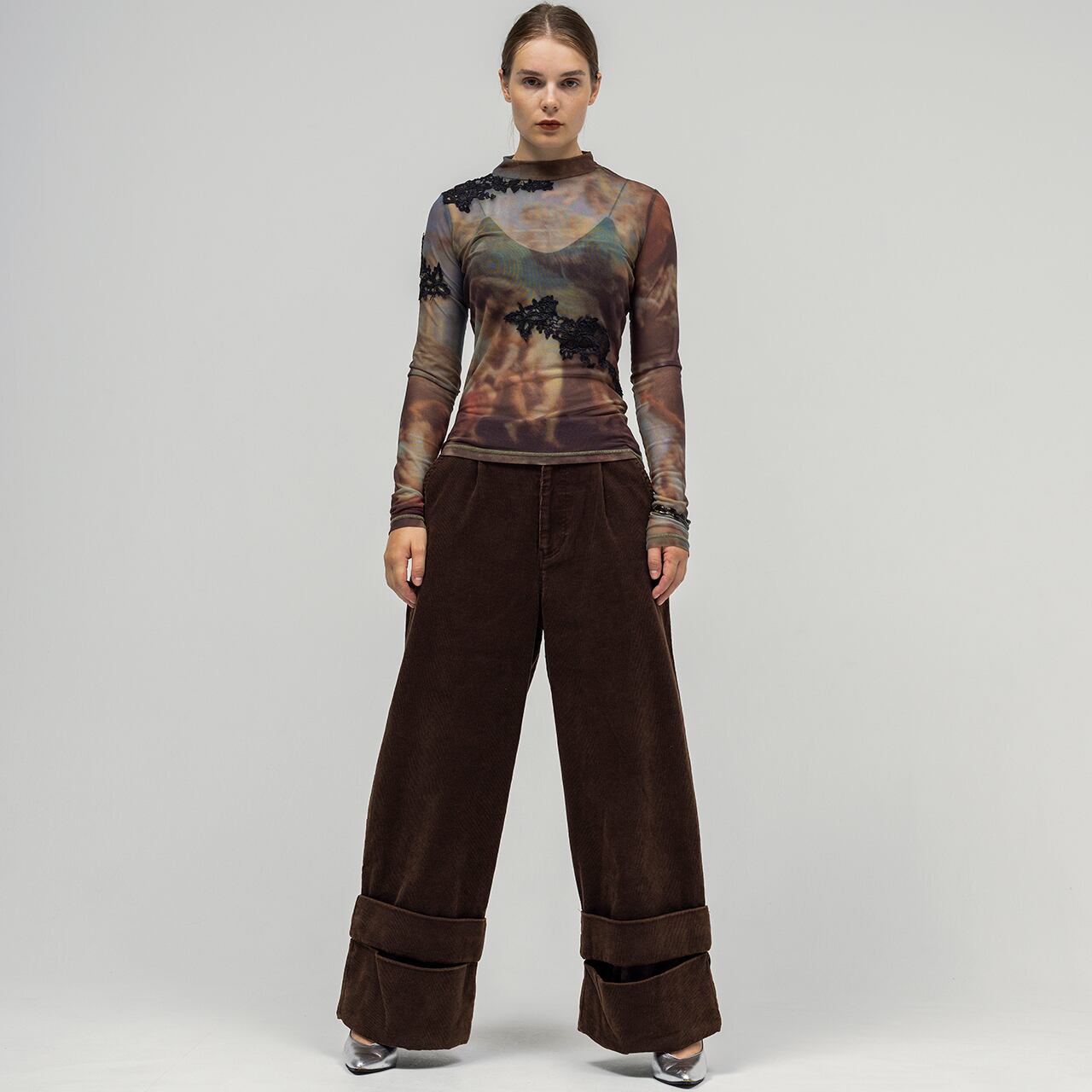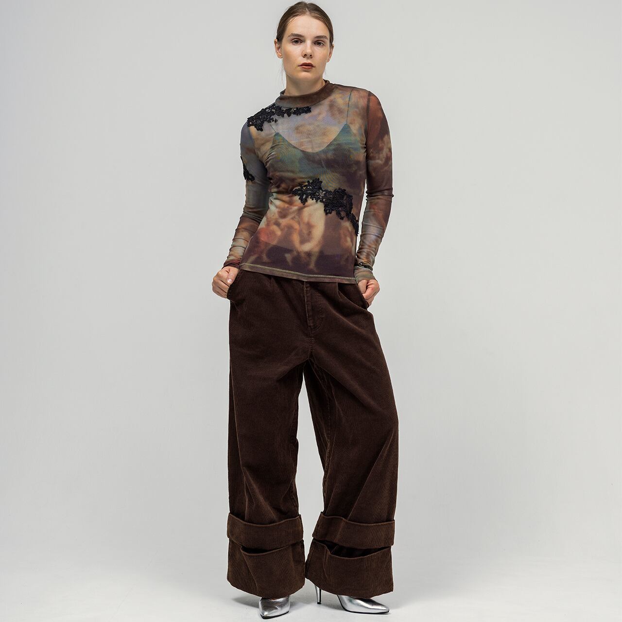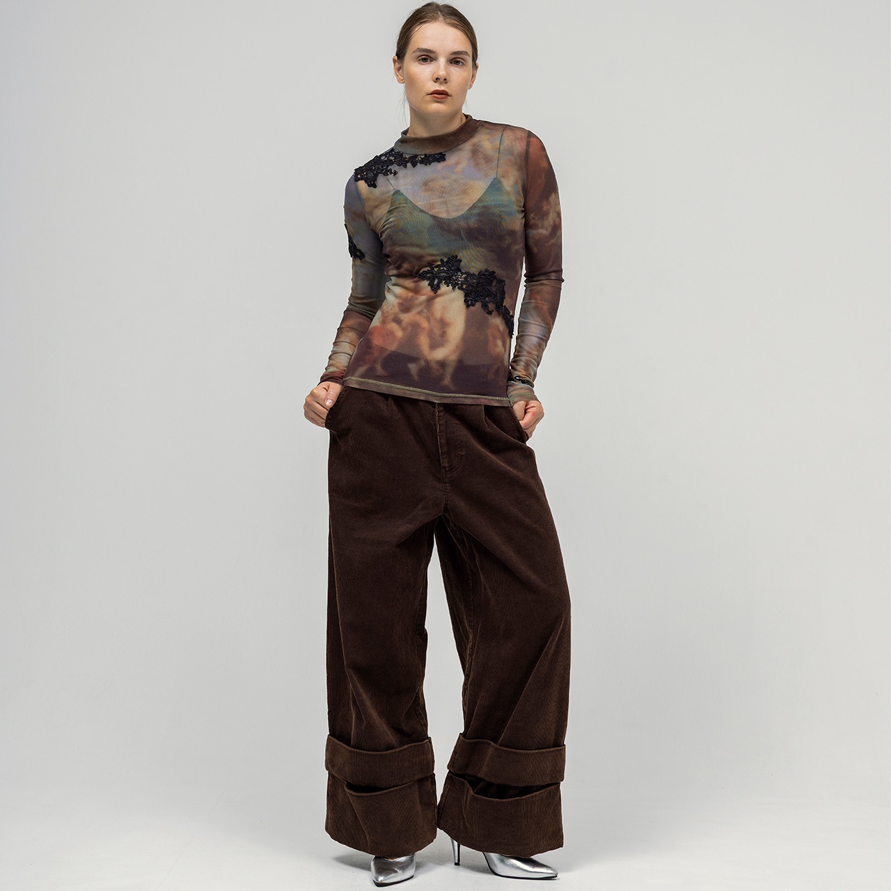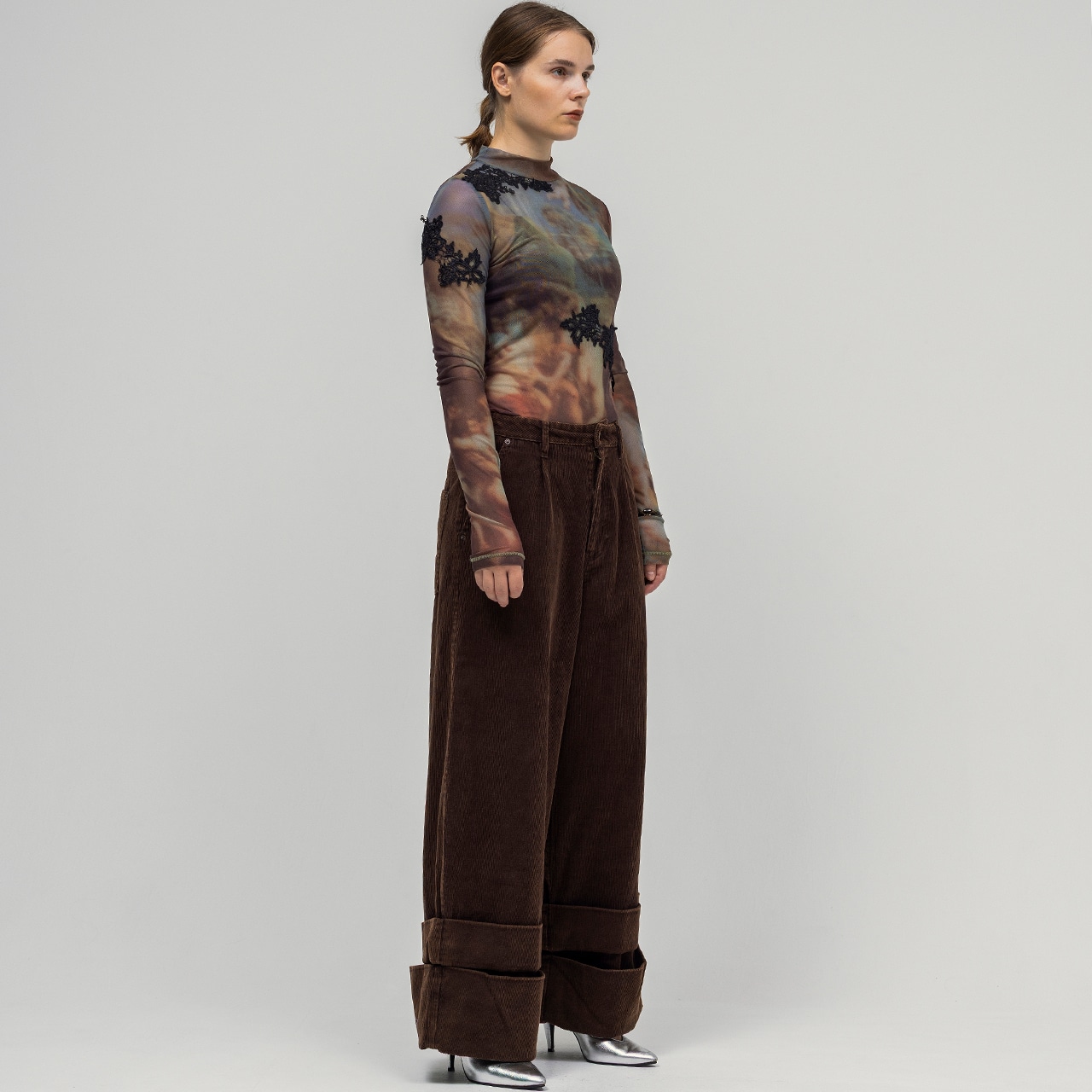 裾を大胆に折り返したダブルデザインが特徴的な、重厚感と抜け感を纏うワイドシルエットのコーデュロイパンツ。