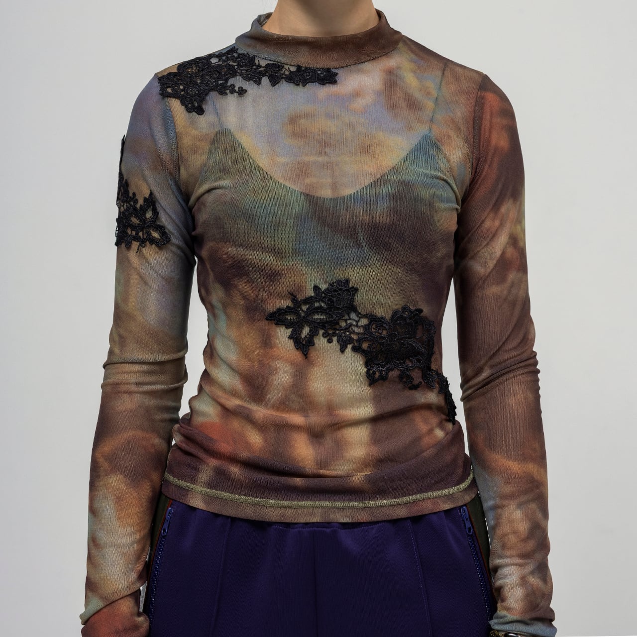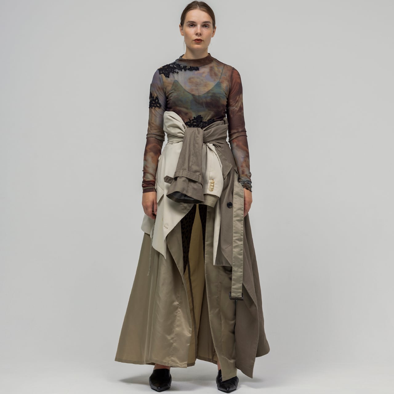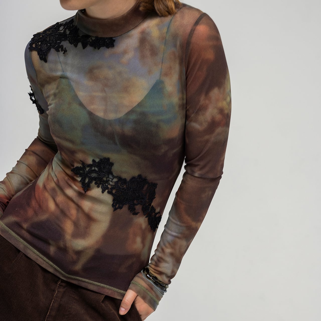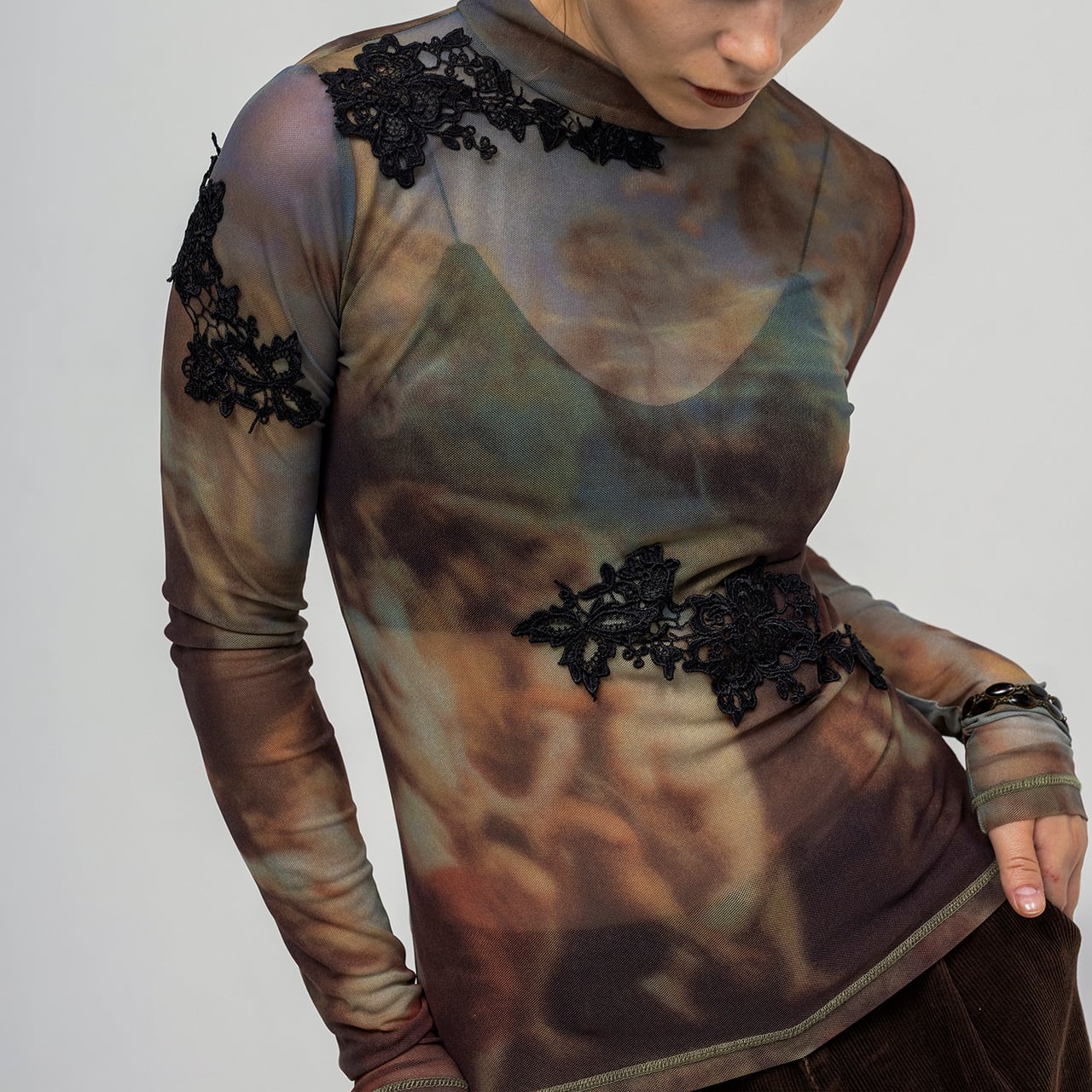 ヨーロッパの古典絵画を大胆にプリントし、表情豊かな立体感のコードレースを施したまるでアートピースのような1着。