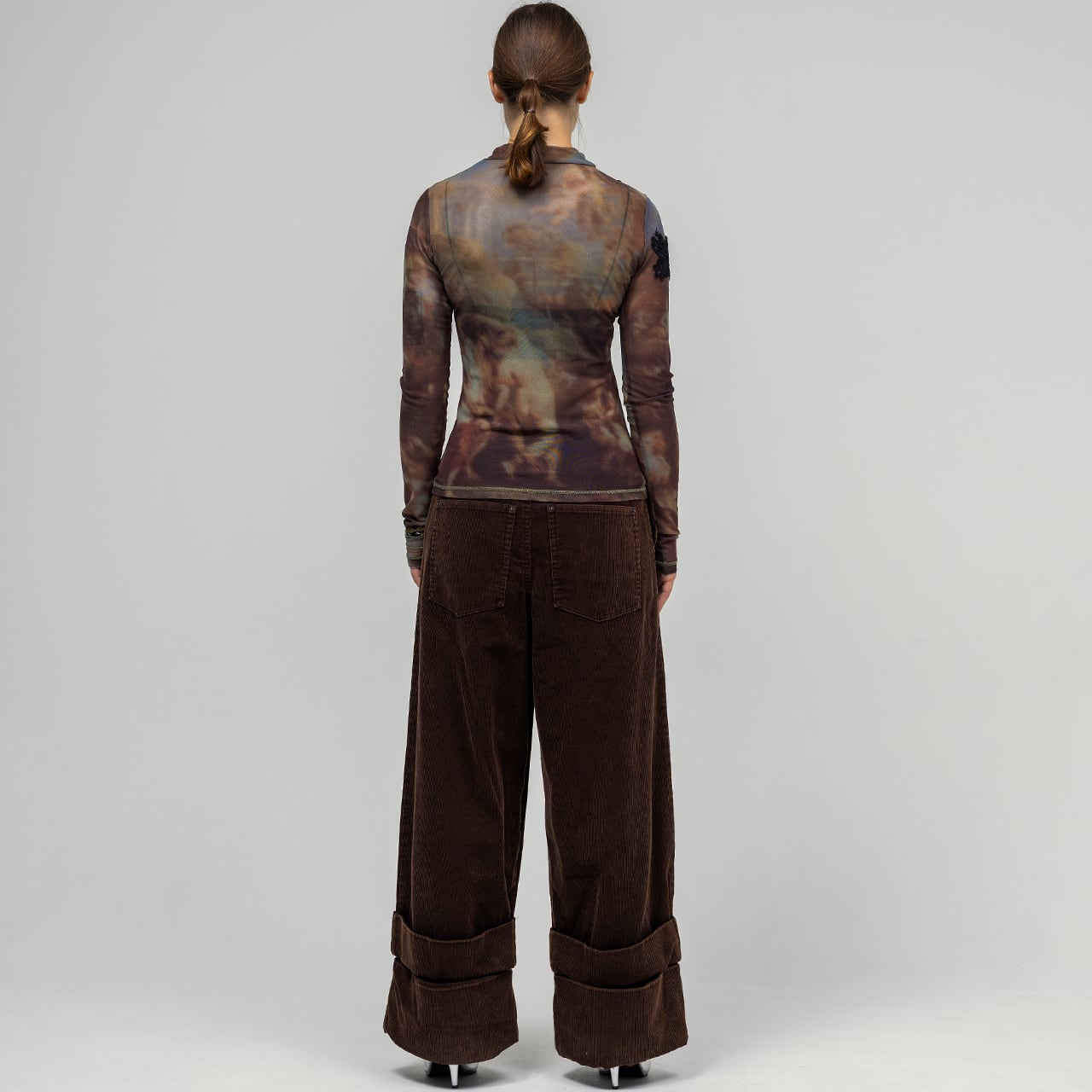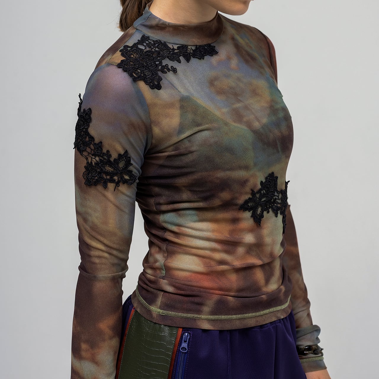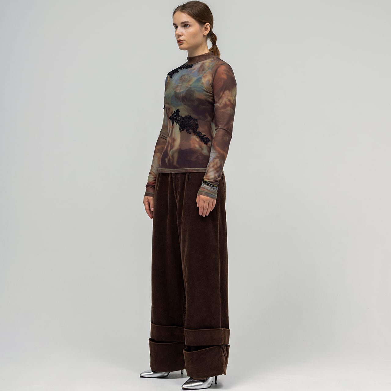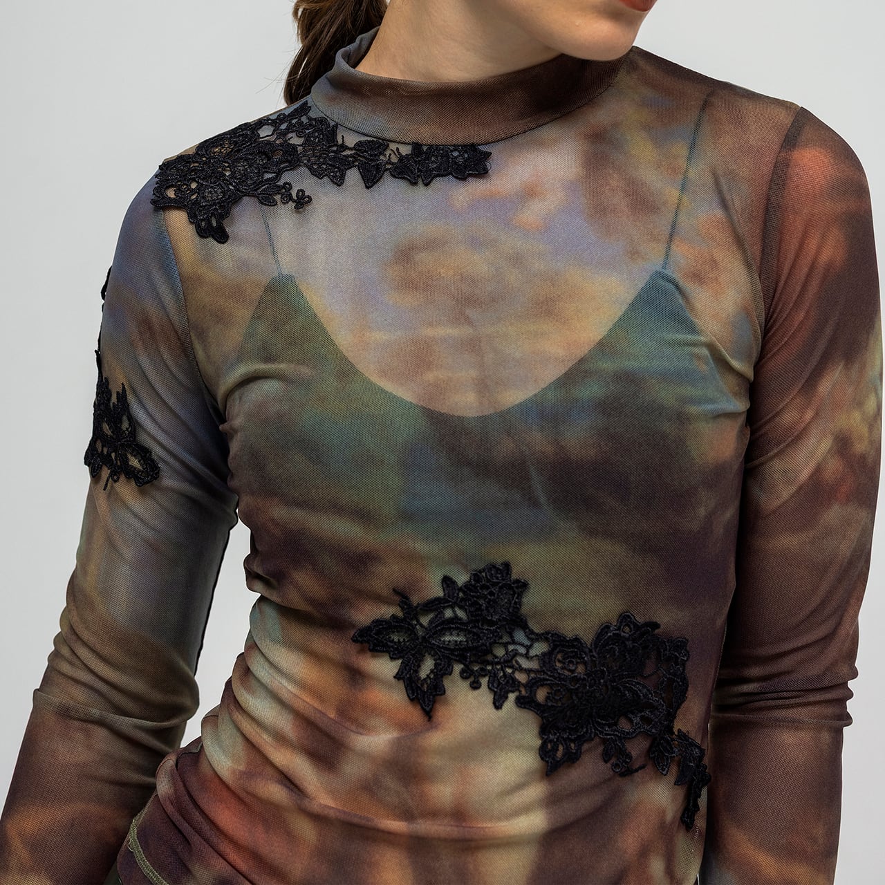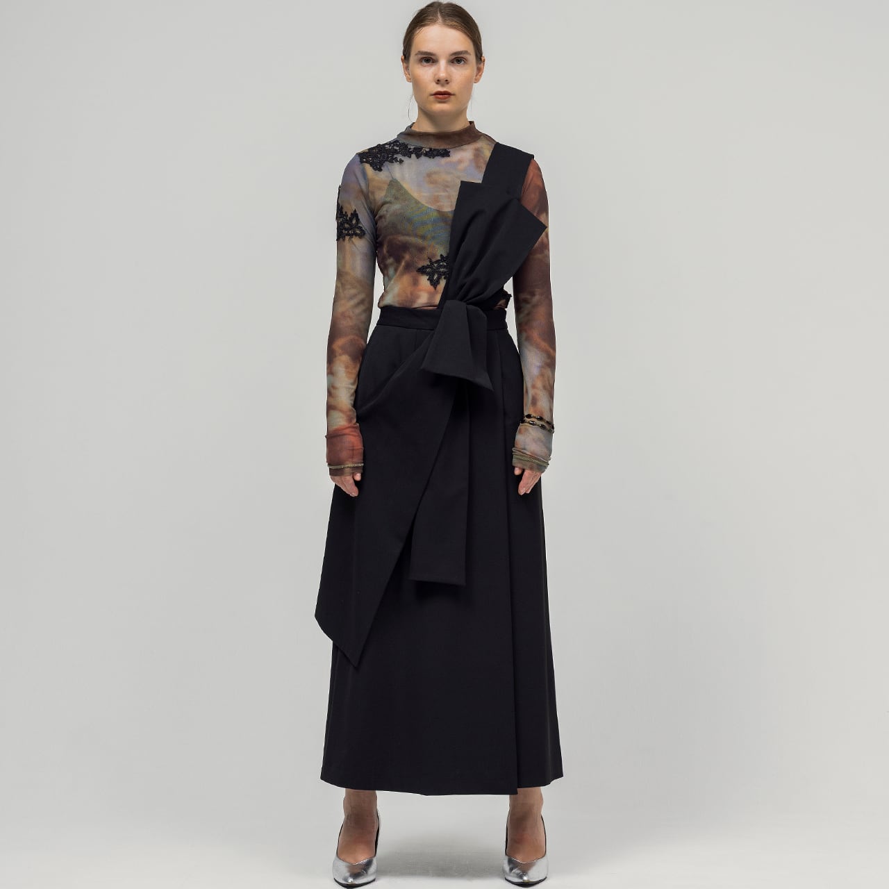 ヨーロッパの古典絵画を大胆にプリントし、表情豊かな立体感のコードレースを施したまるでアートピースのような1着。