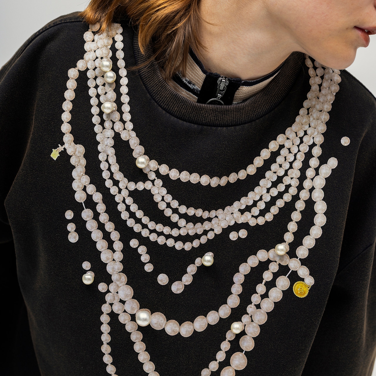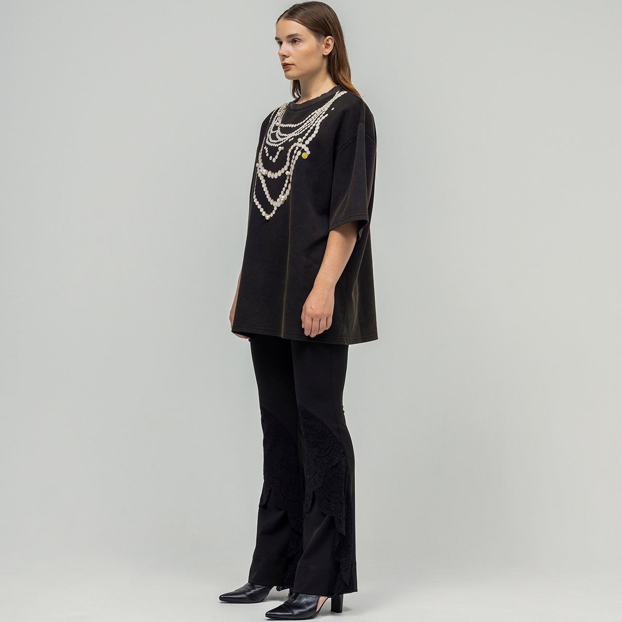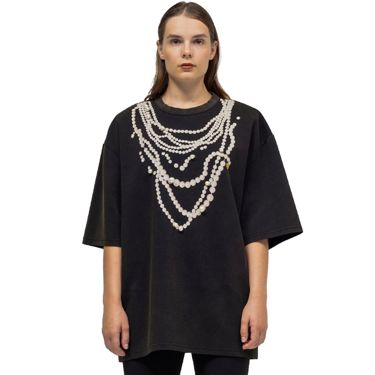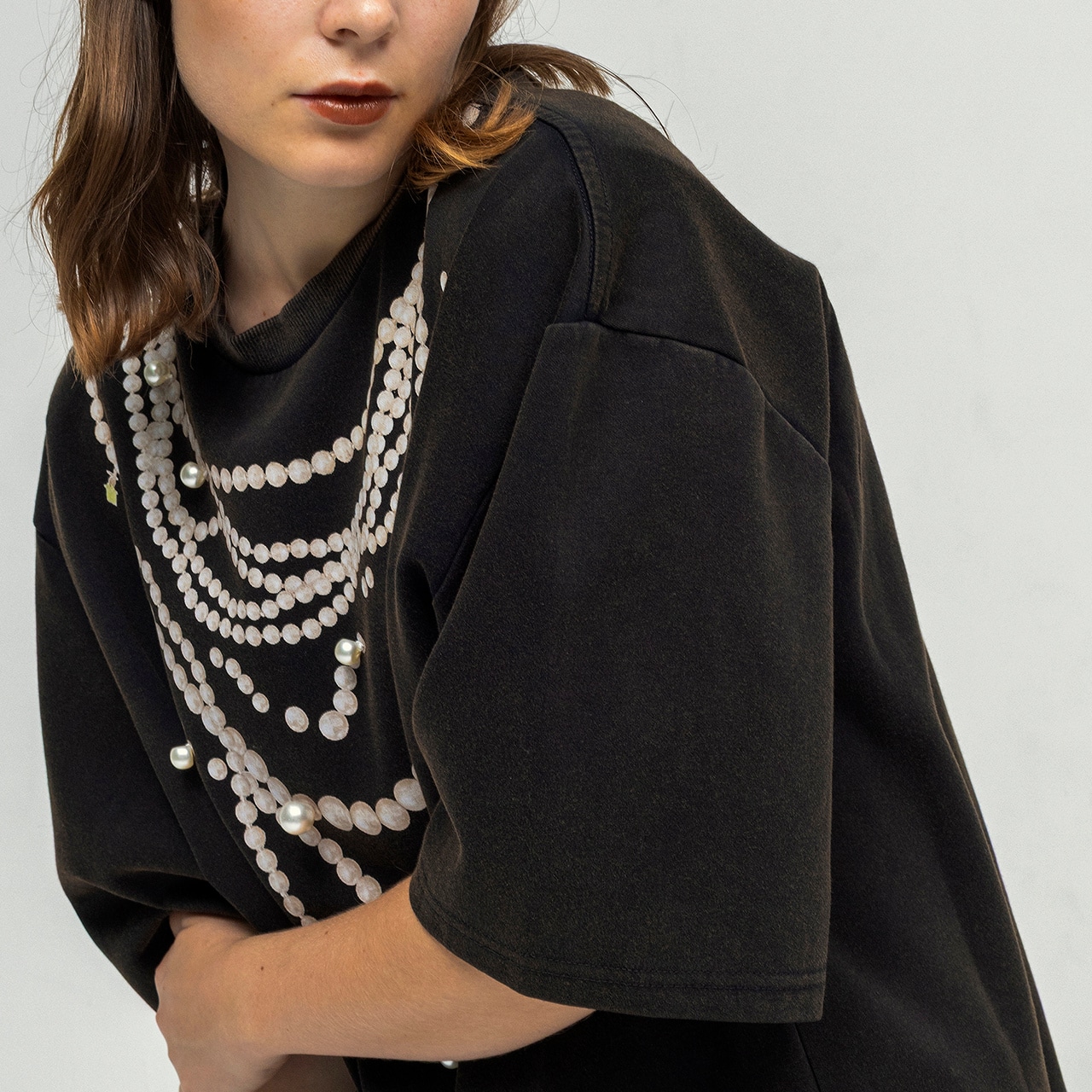 大振りのパールネックレスを描いたトロンプルイユにリアルパールをあしらい、フェイクとリアルが重なり合うBIG TEE。