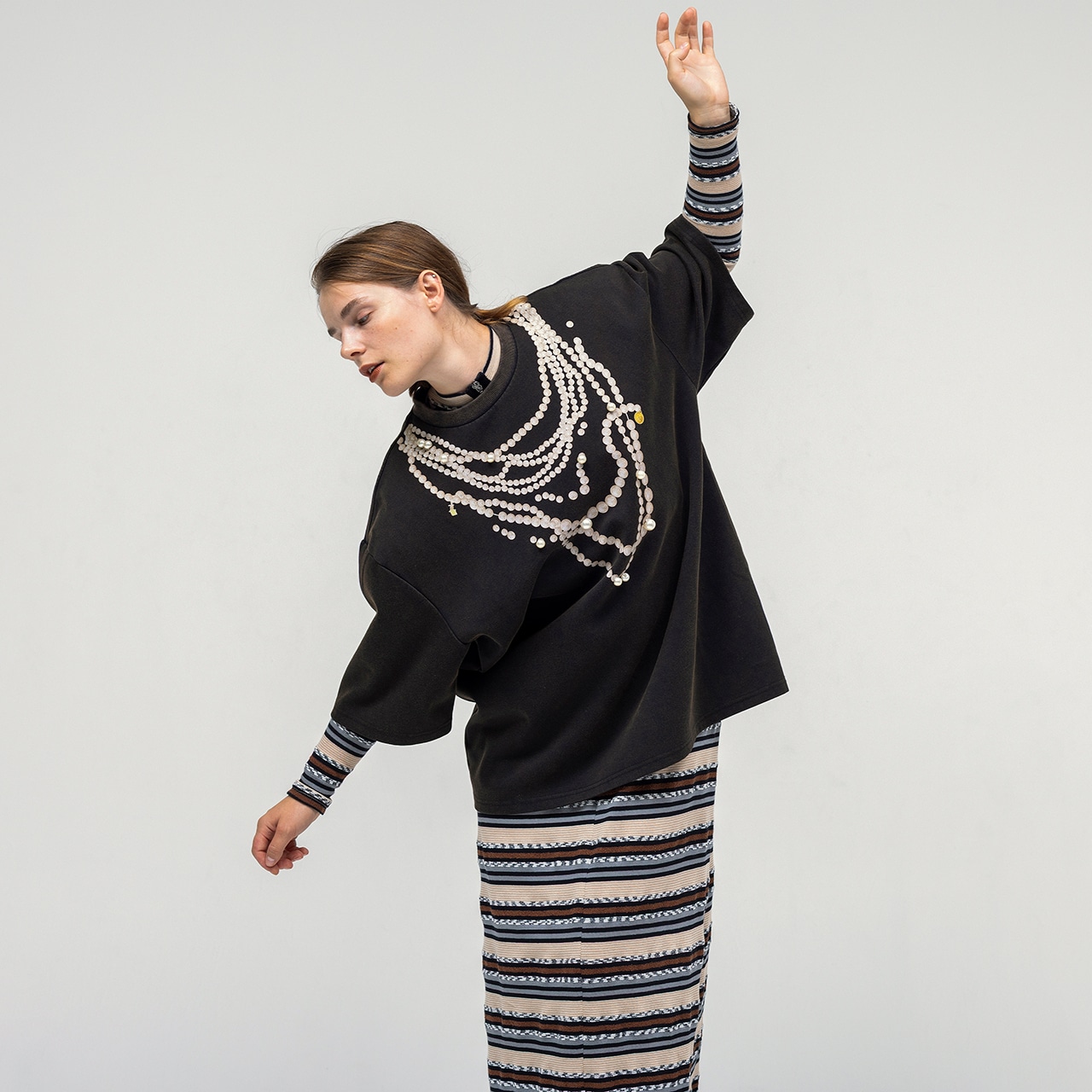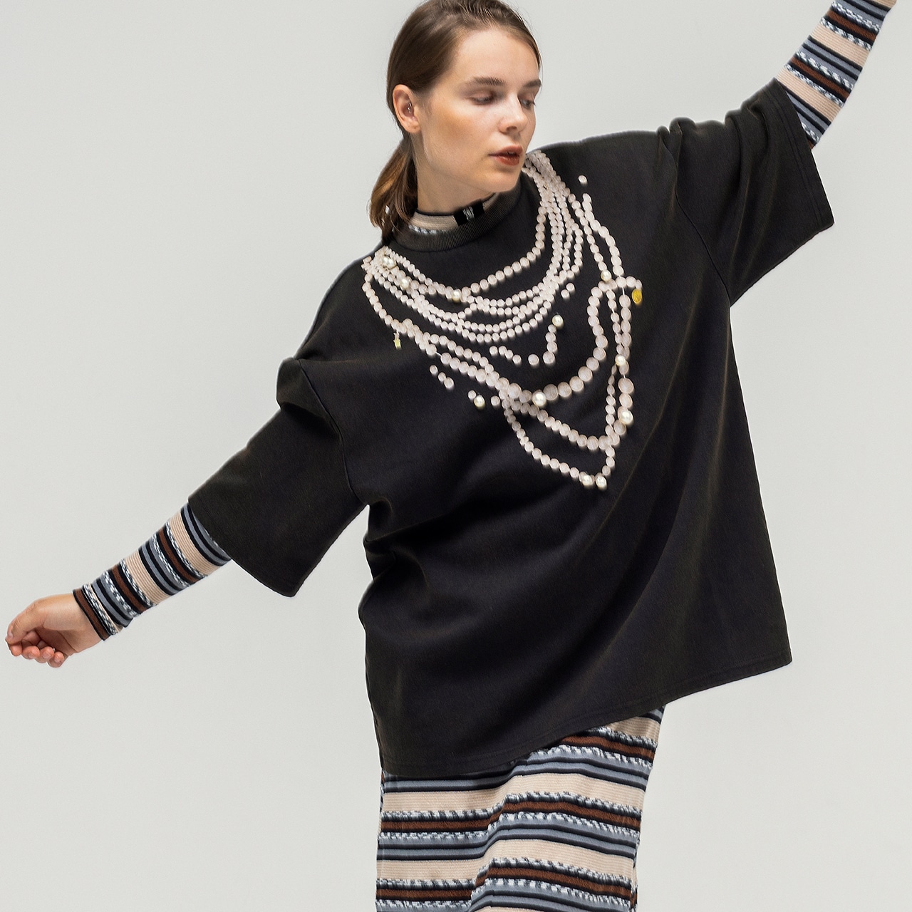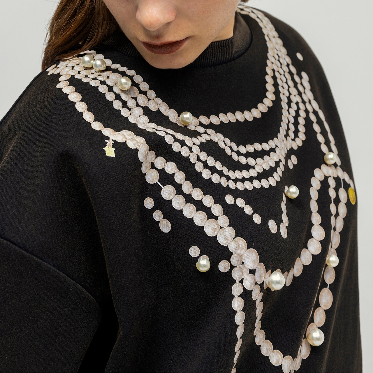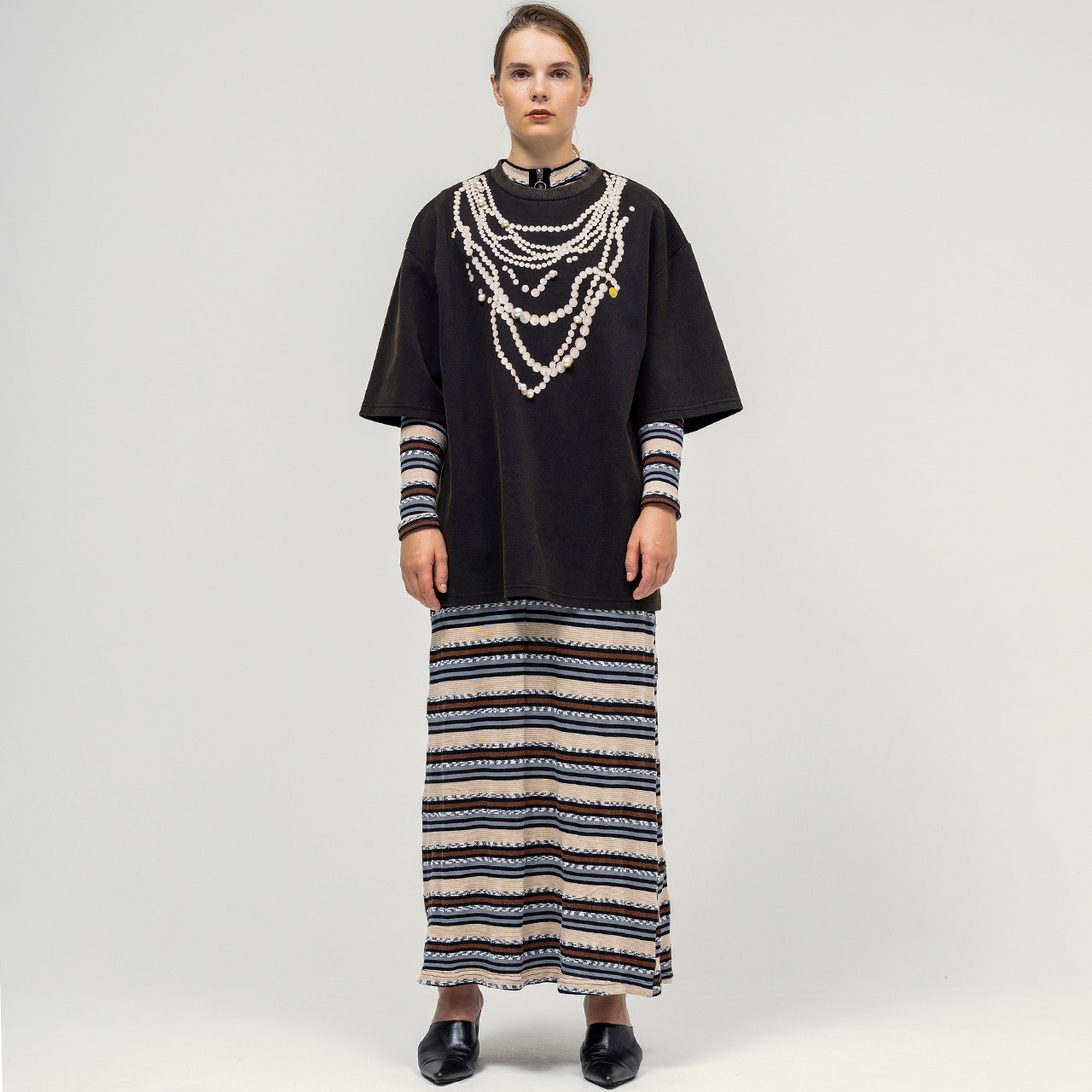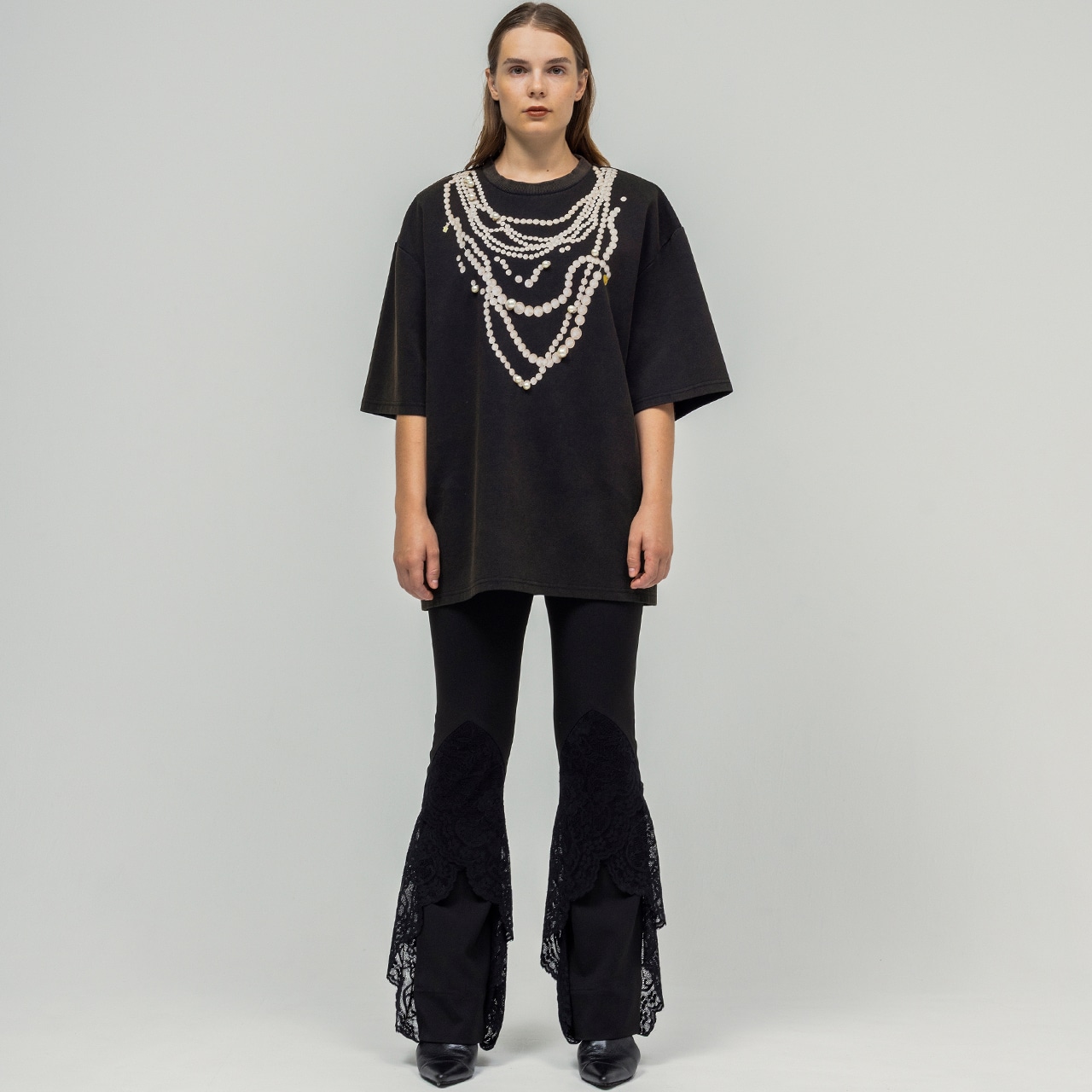 大振りのパールネックレスを描いたトロンプルイユにリアルパールをあしらい、フェイクとリアルが重なり合うBIG TEE。