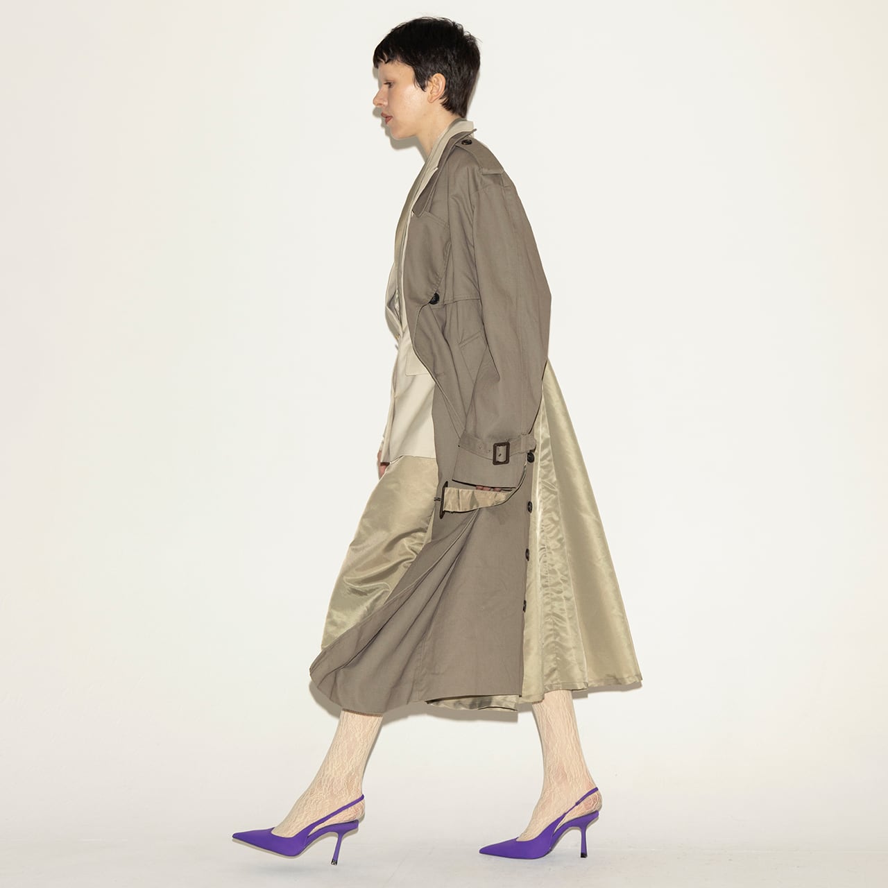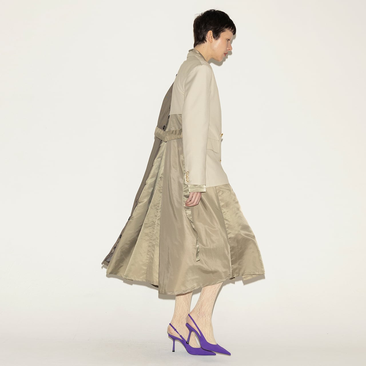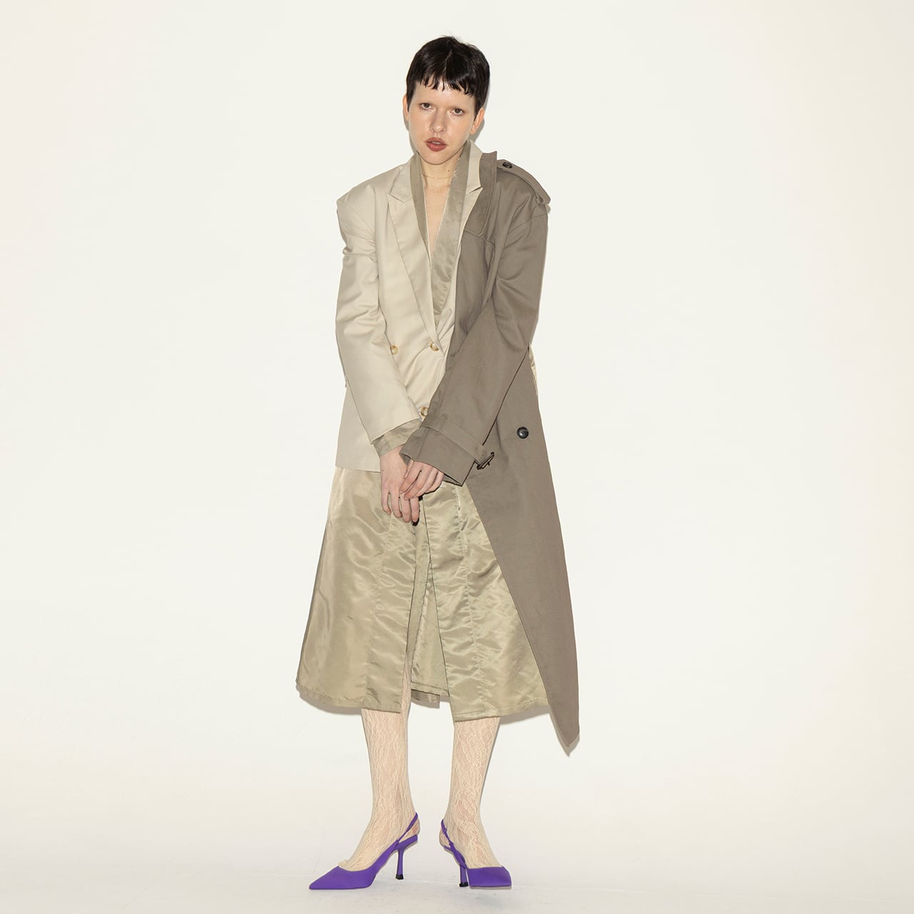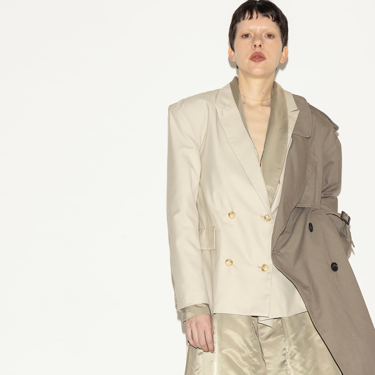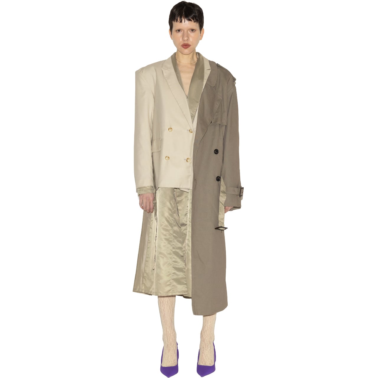 ジャケット、トレンチコート、ガウンの要素を大胆にミックスした、唯一無二のマッシュアップコート。