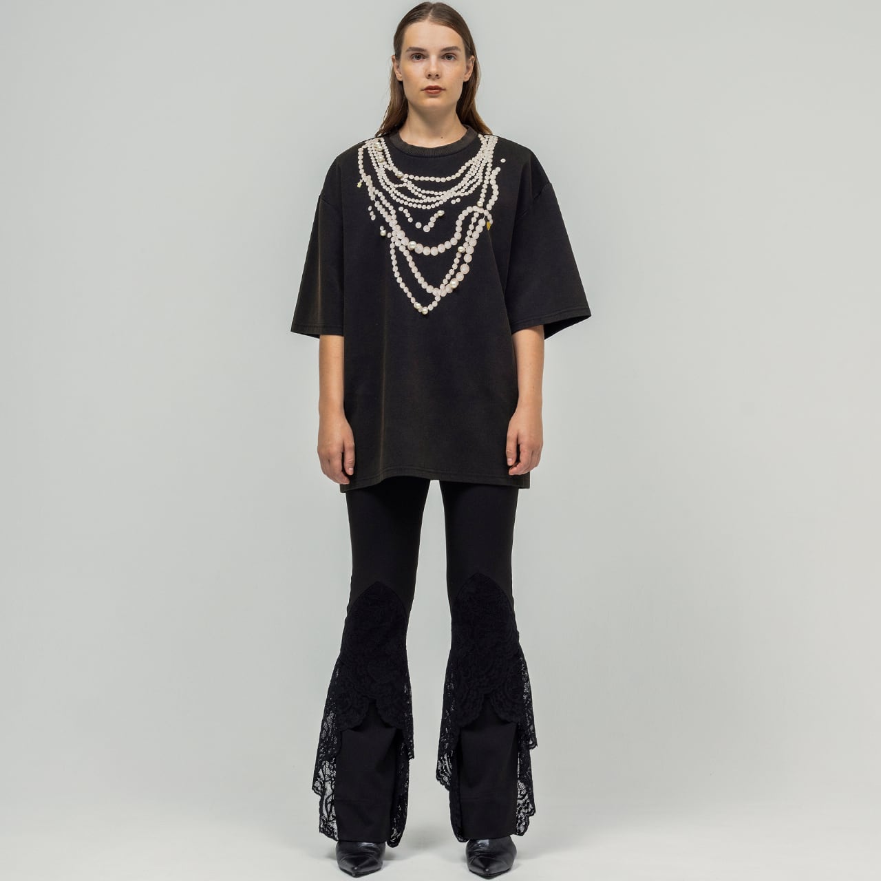 レースの揺らめきが歩くたびにニュアンスを生み、モードとフェミニンが交錯する独自の表情を描きます。