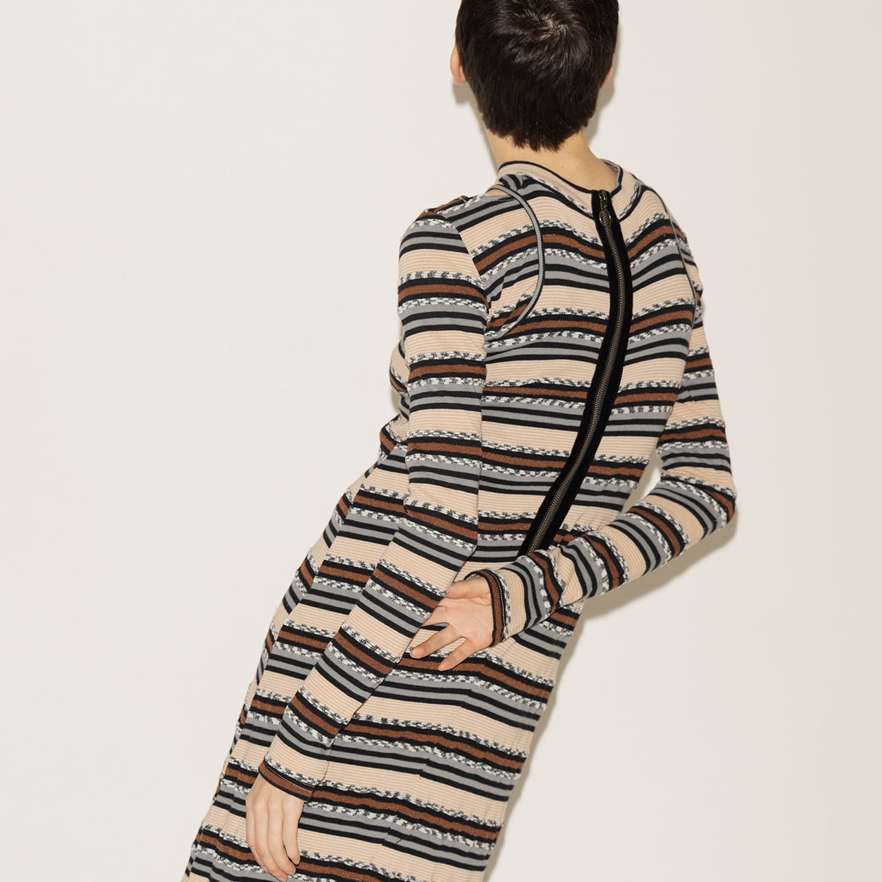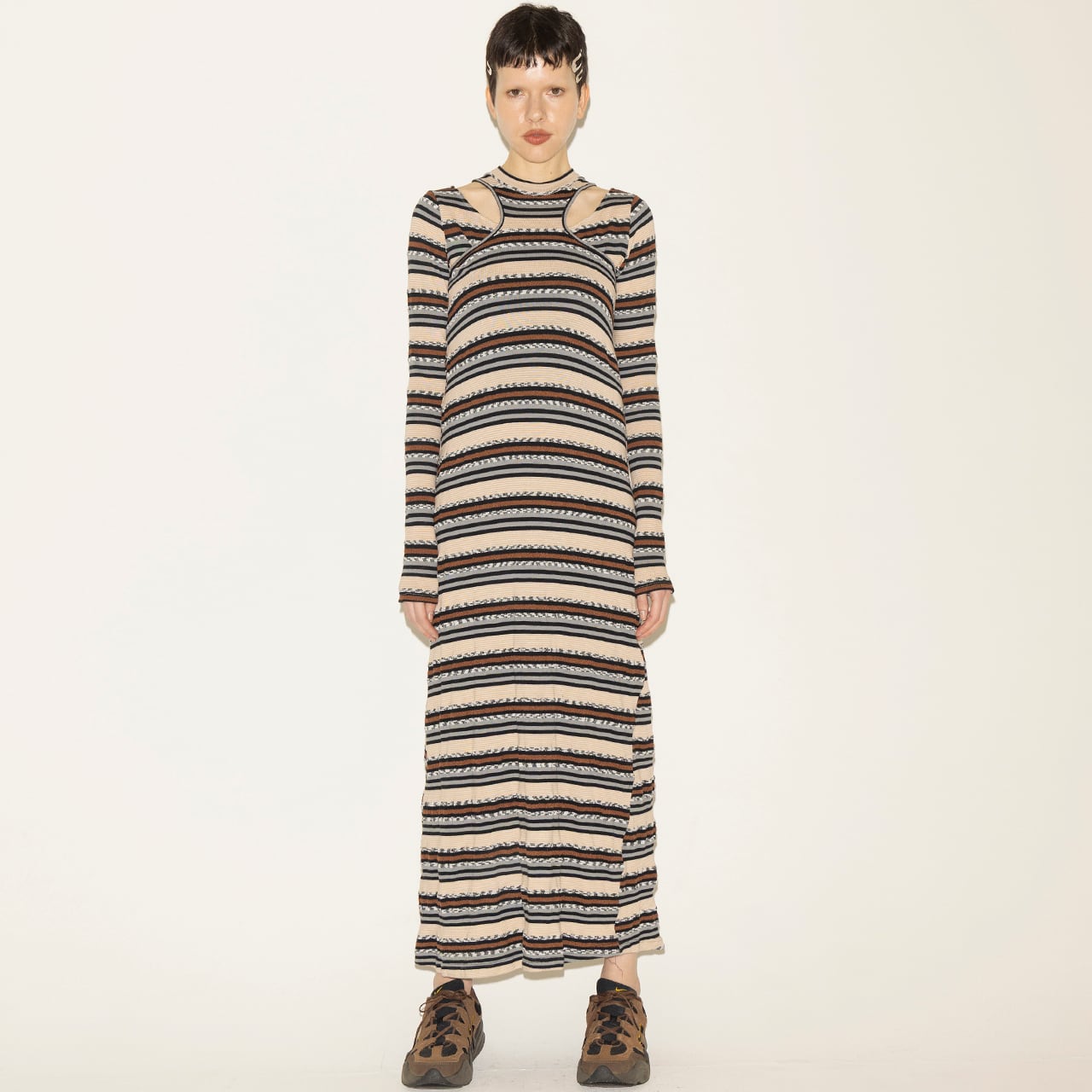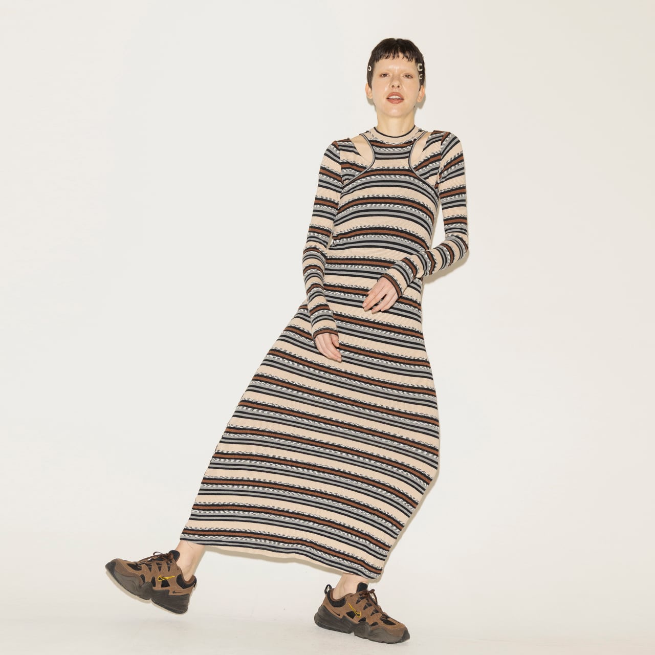 多彩な糸を組み合わせて編み上げた、奥行きのあるマルチボーダーが印象的なトップスとワンピースのセットアイテム。