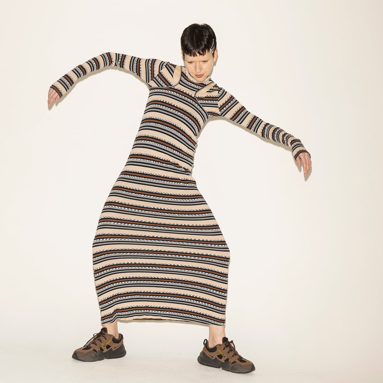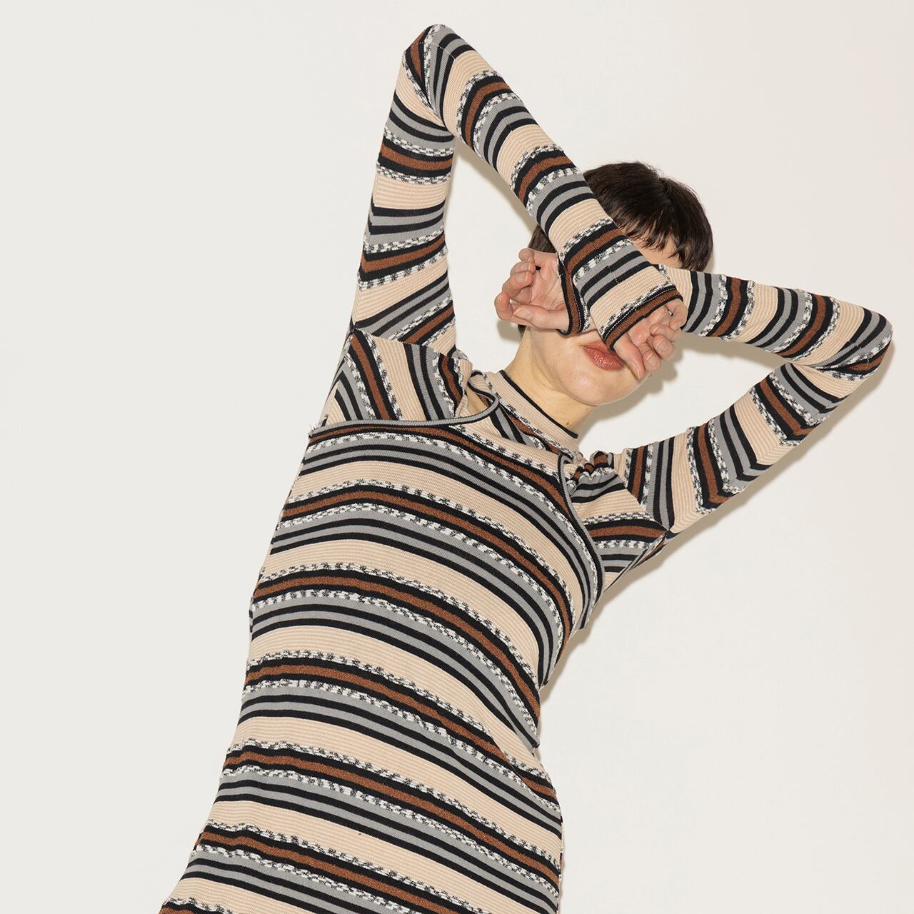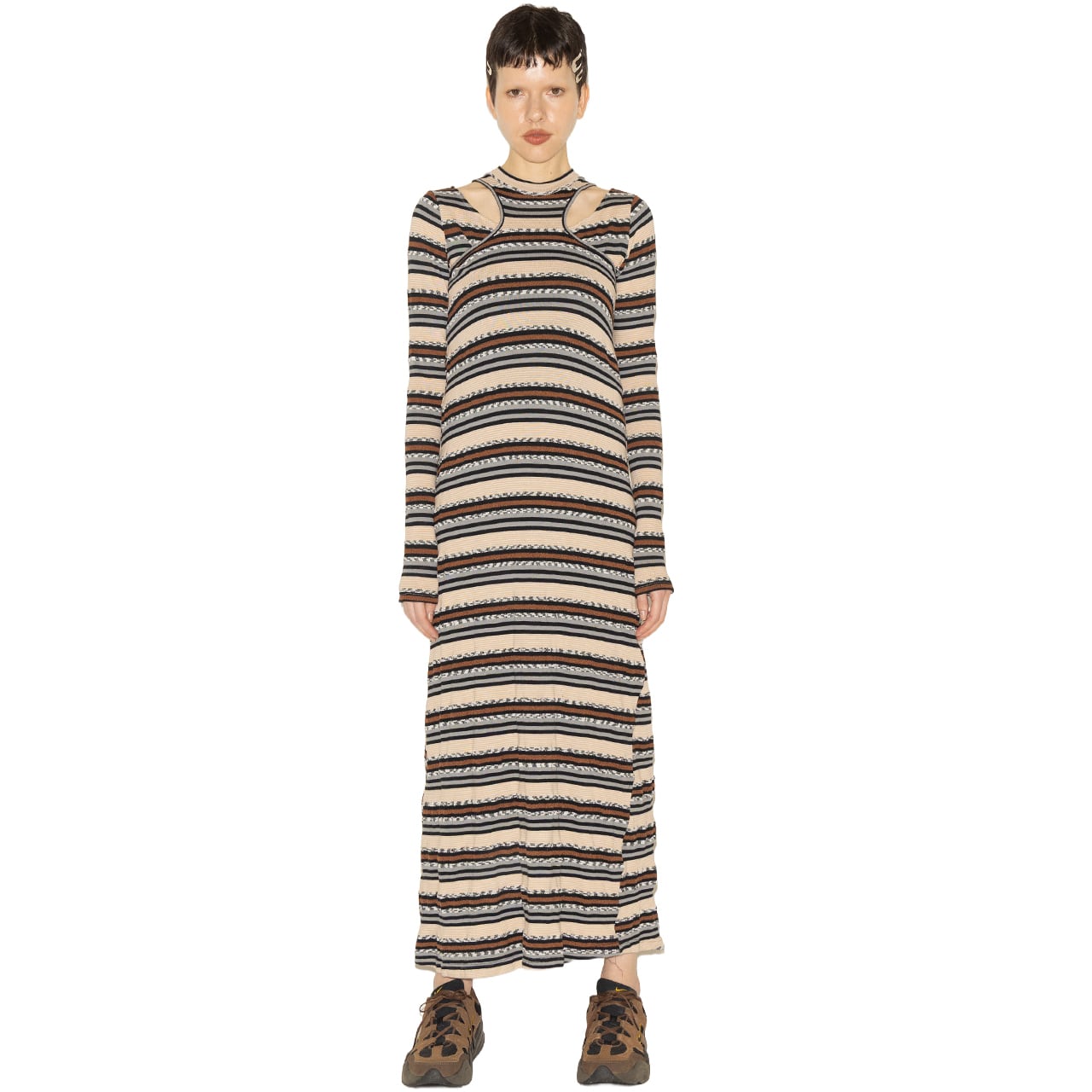 多彩な糸を組み合わせて編み上げた、奥行きのあるマルチボーダーが印象的なトップスとワンピースのセットアイテム。