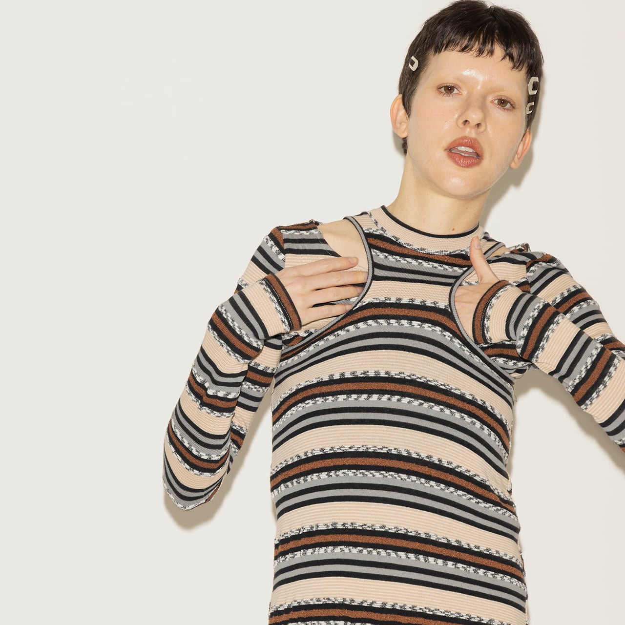 様々な糸で編み上げたマルチボーダーがリズミカルに表情を変え、1枚でもレイヤードでも活躍。