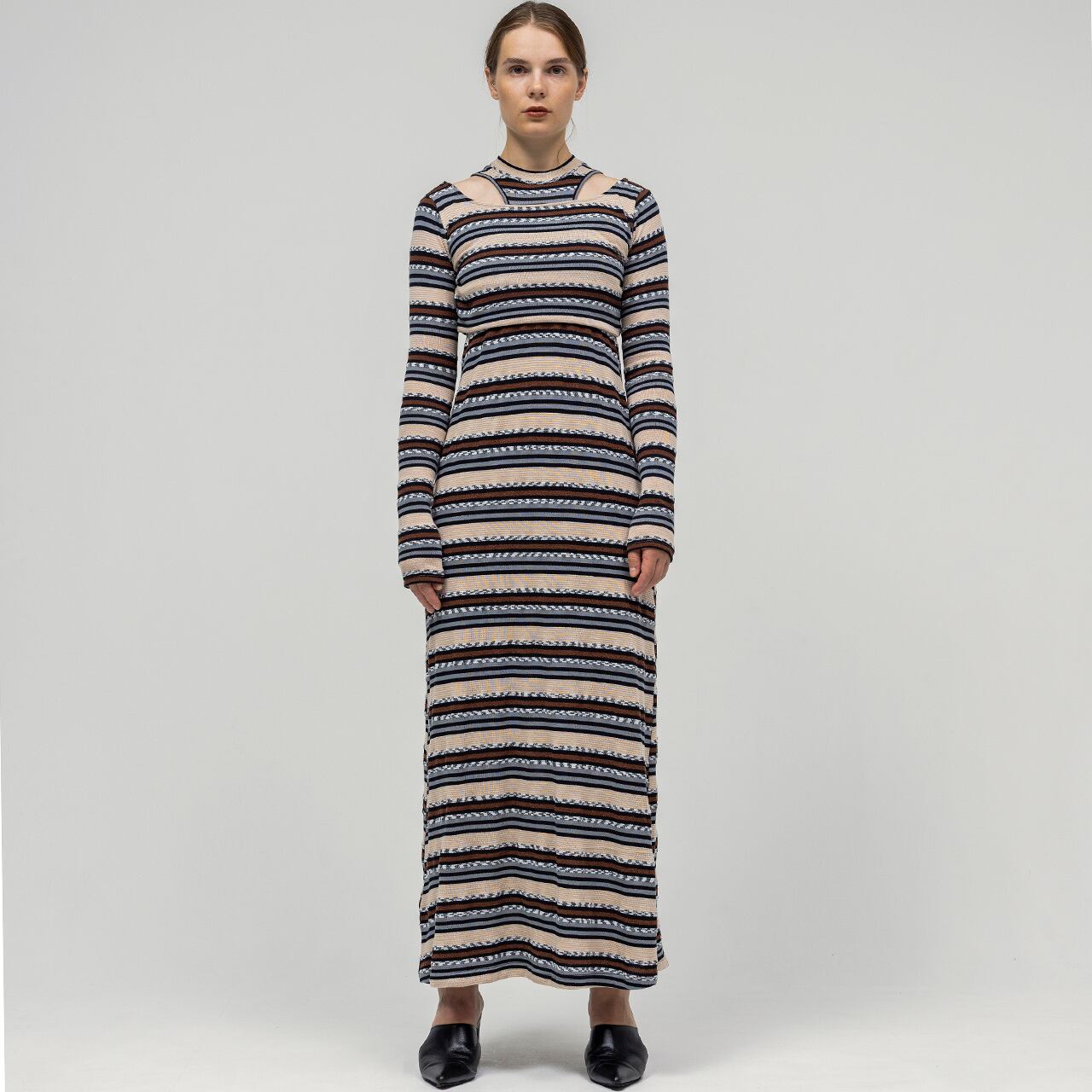多彩な糸を組み合わせて編み上げた、奥行きのあるマルチボーダーが印象的なトップスとワンピースのセットアイテム。