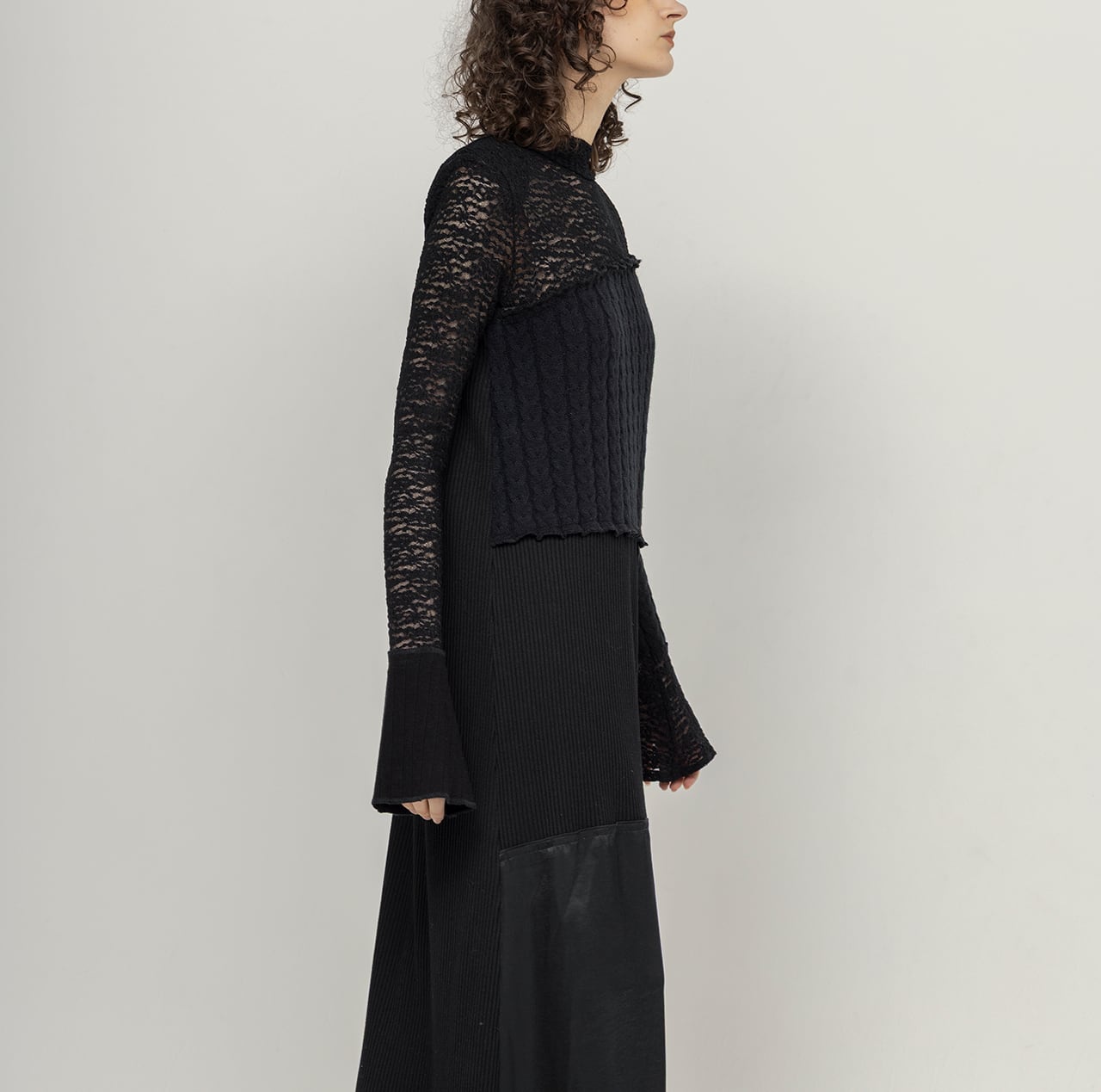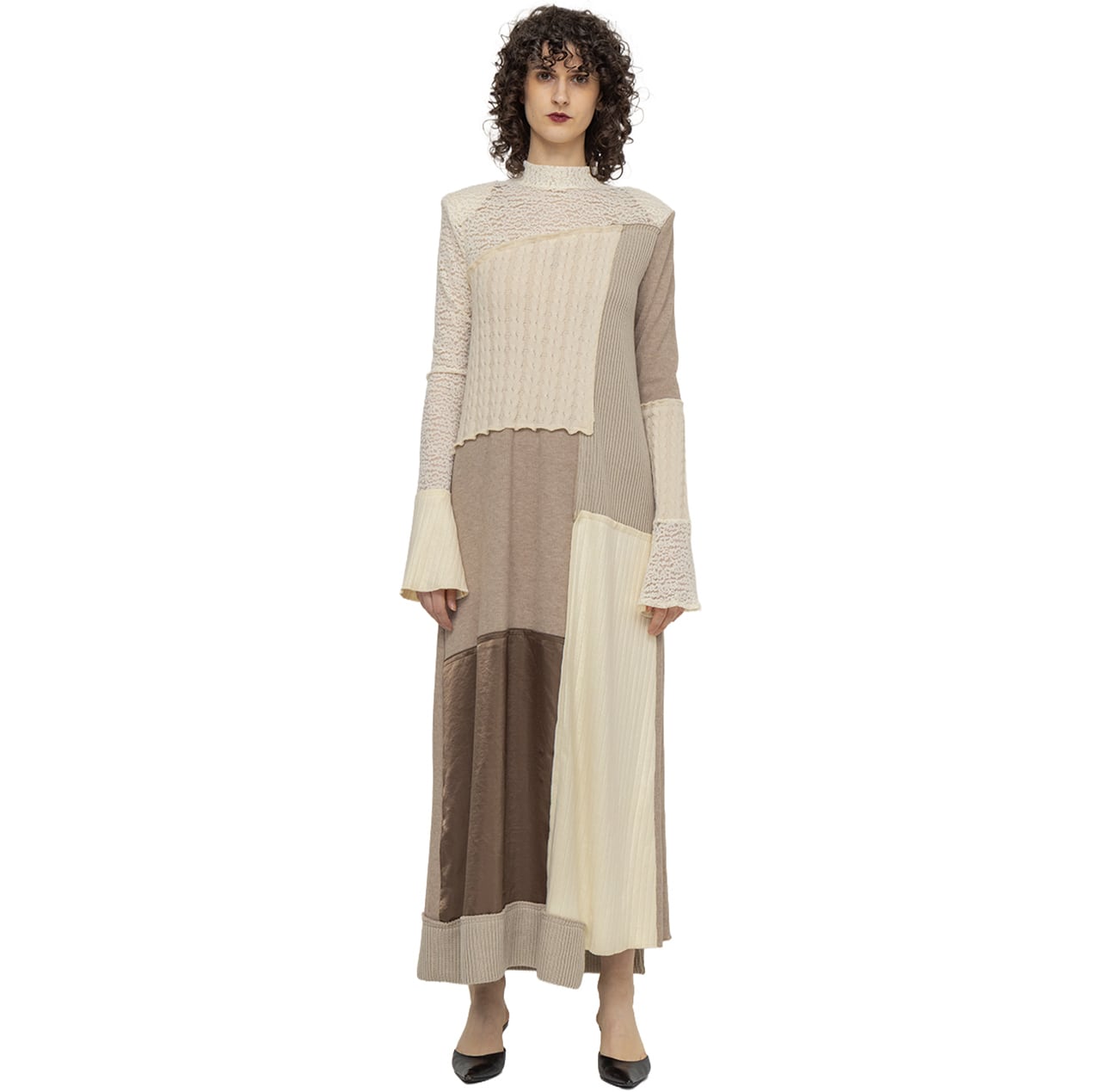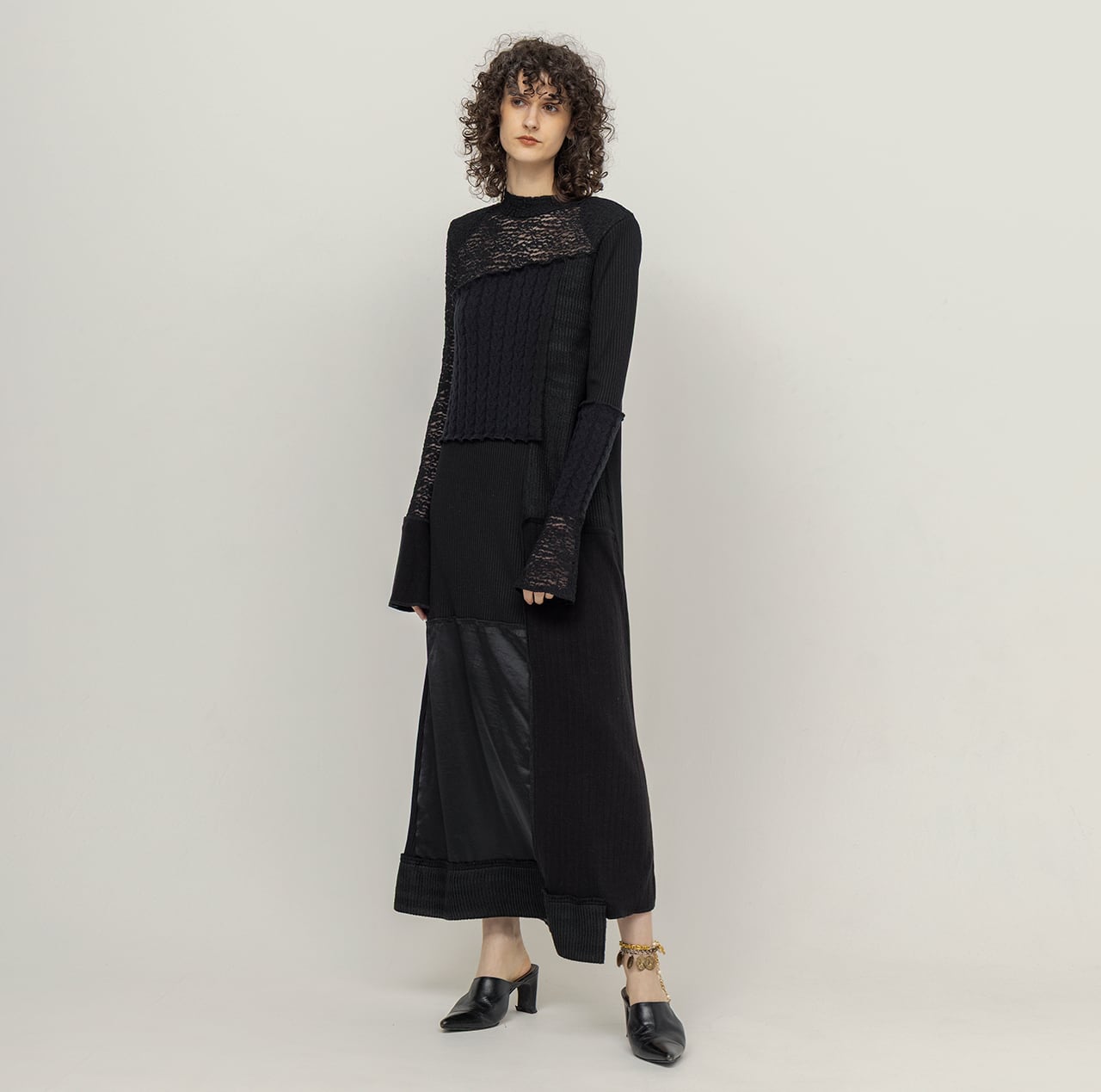 異なる編み地のニットソー4種に、ストレッチレース、ヴィンテージサテンを組み合わせたパッチワークドレス。