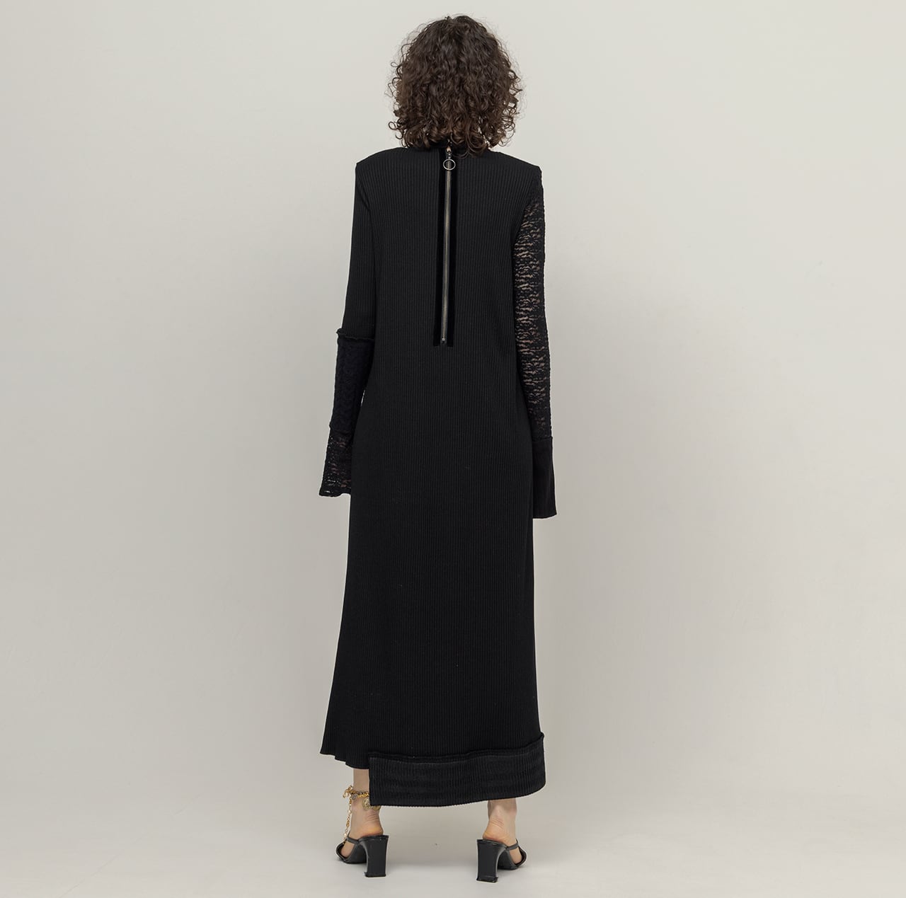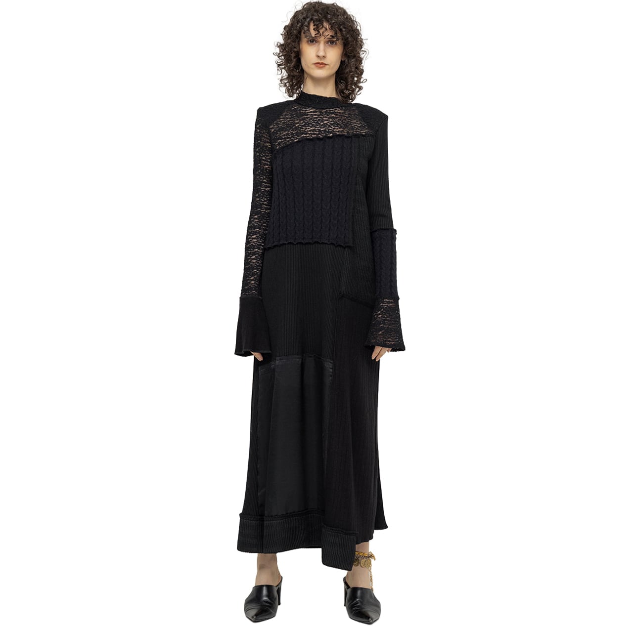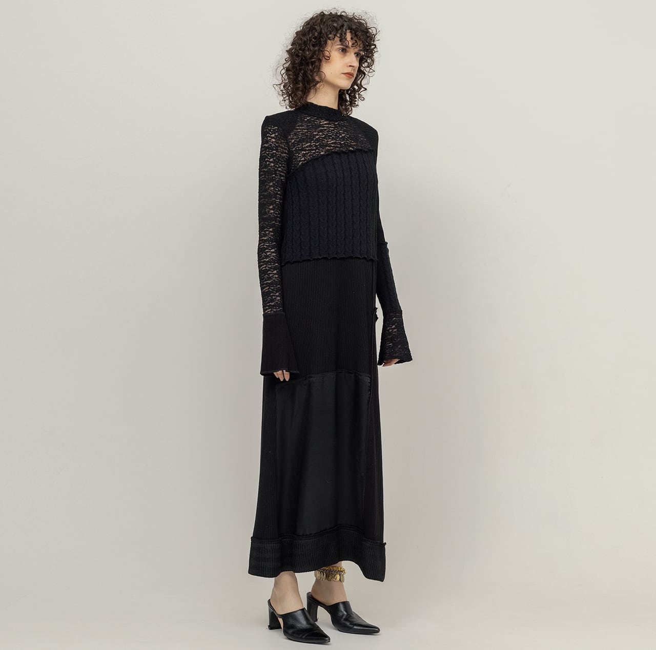 異なる編み地のニットソー4種に、ストレッチレース、ヴィンテージサテンを組み合わせたパッチワークドレス。
