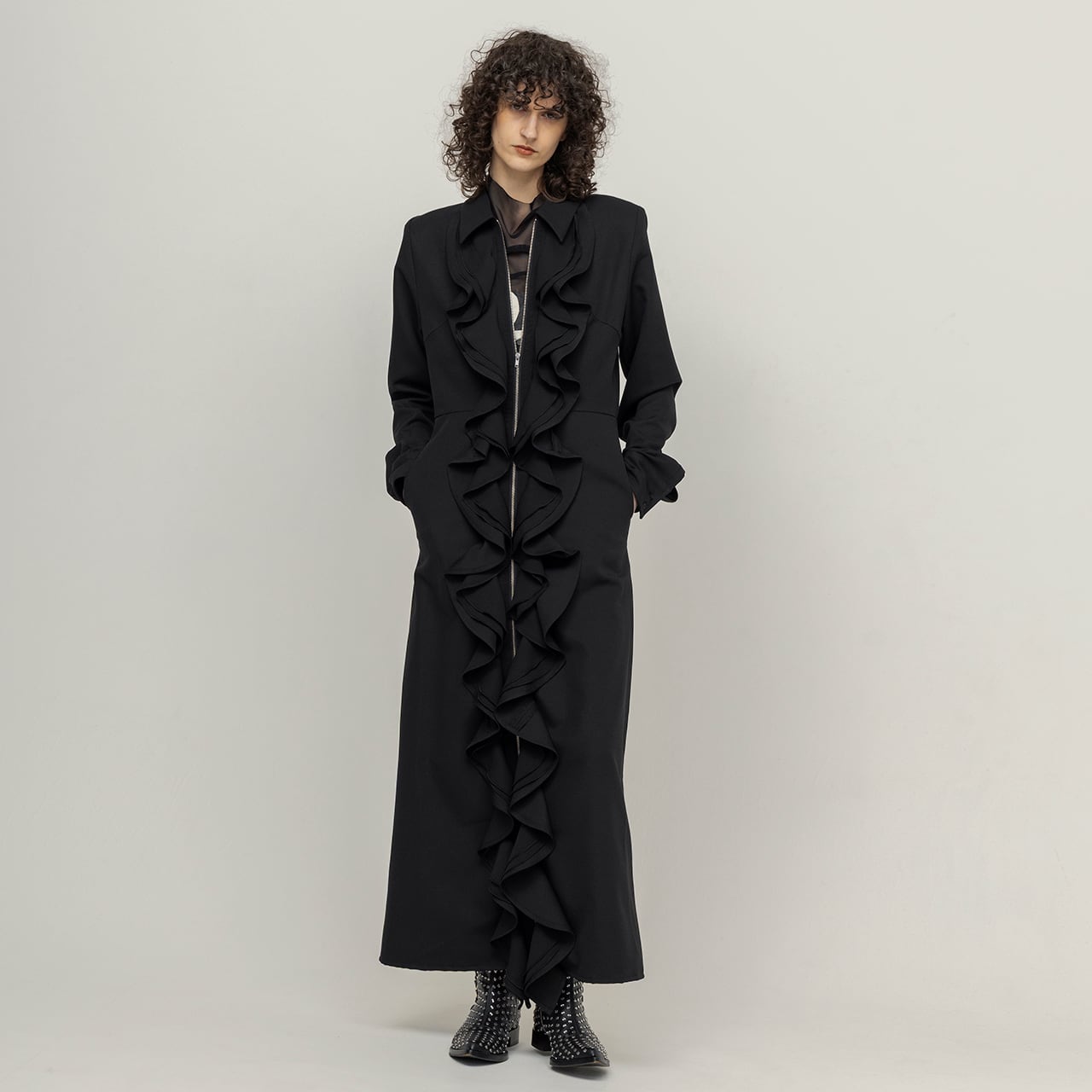 デコラティブなフリルを立体的に重ね、フロントにはスポーティなジップを走らせたドレス。