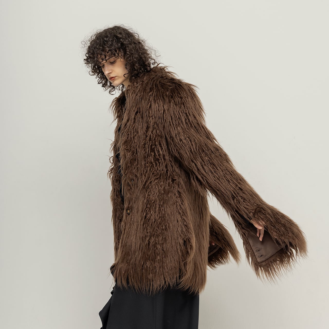 深みのある質感とクリーンなシルエットを同時に叶えるロングスリーブフェイクファーコート。