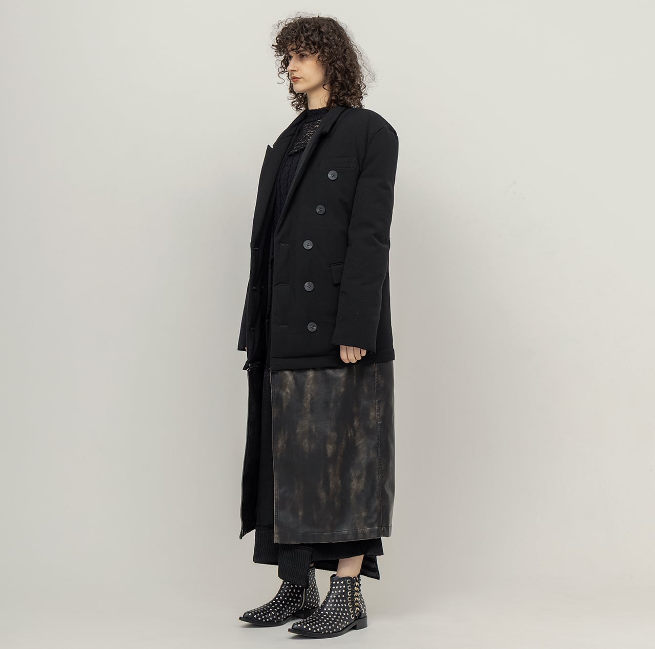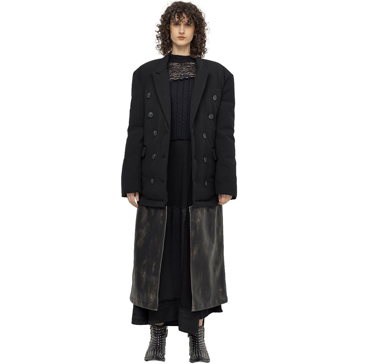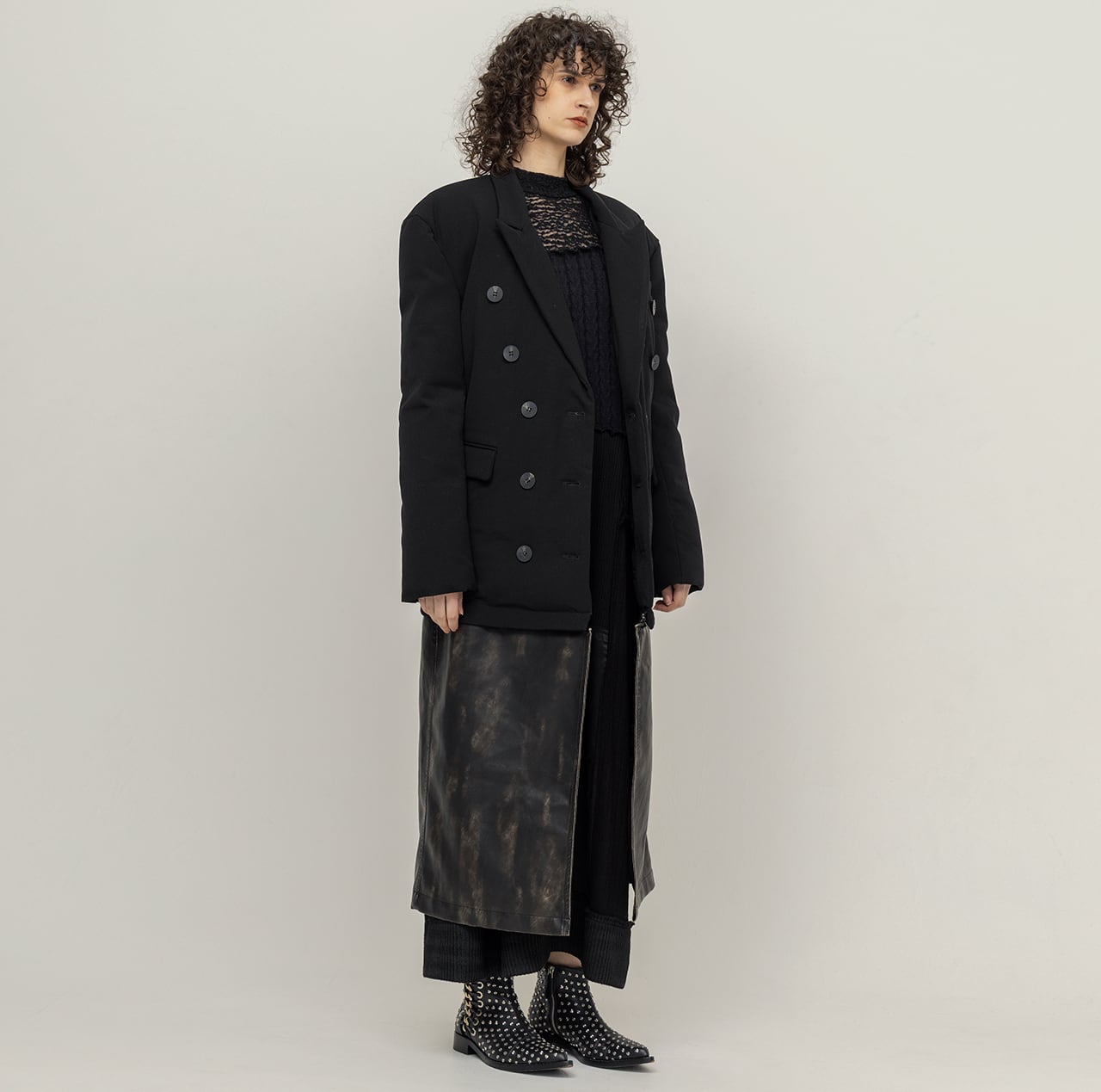 ツイルのジャケット型ダウンと、ハードウォッシュ加工を施した合皮パネルをレイヤードした構築的なデザインが、クラシックと実験性を絶妙なバランスで実現。