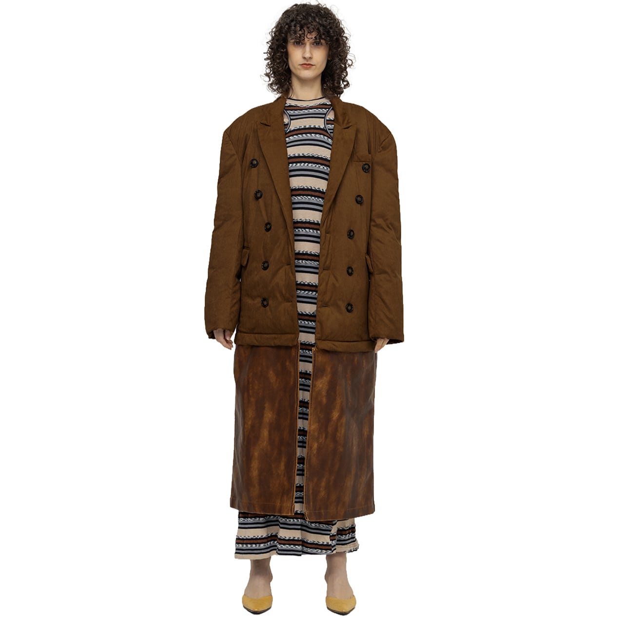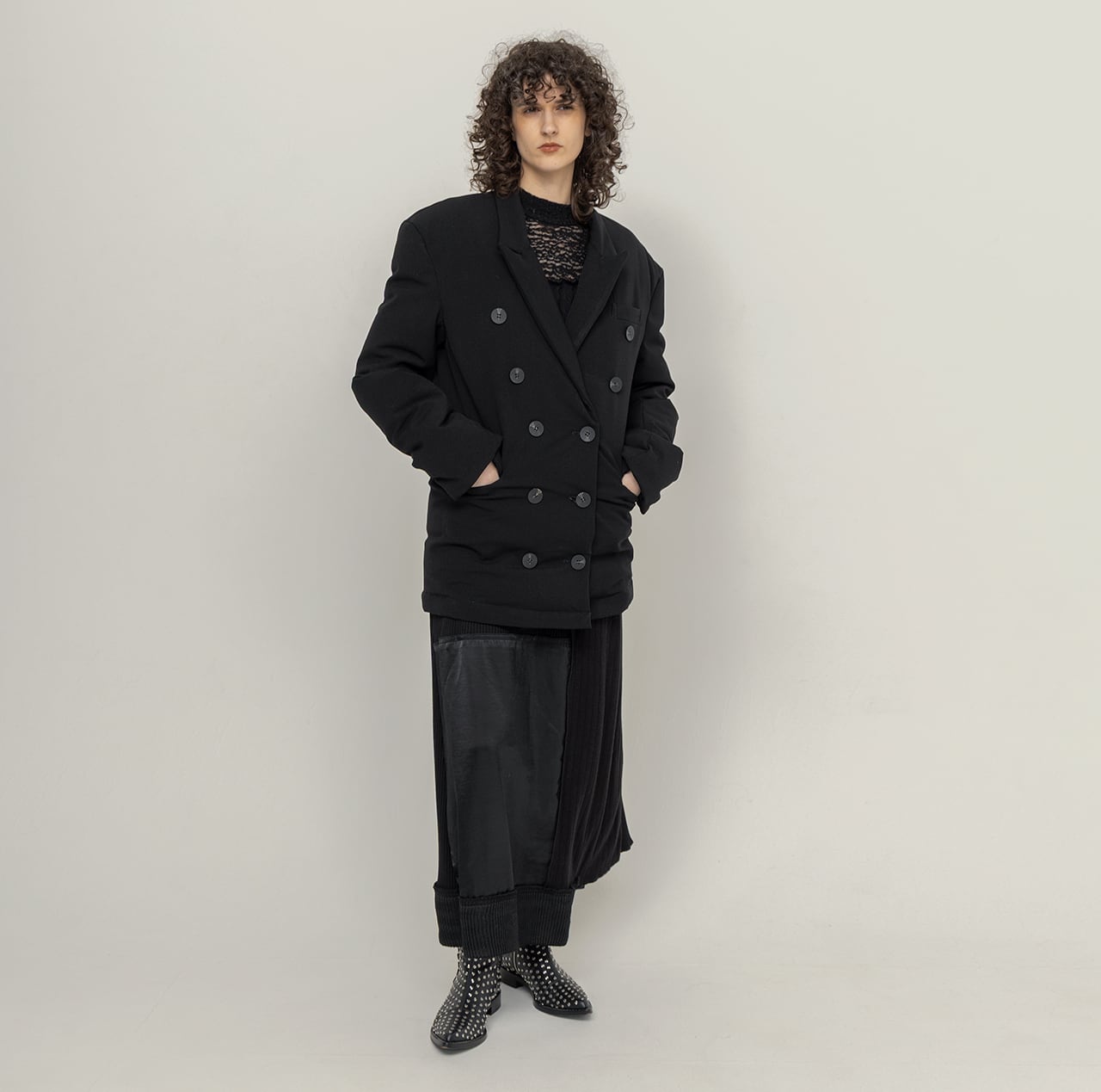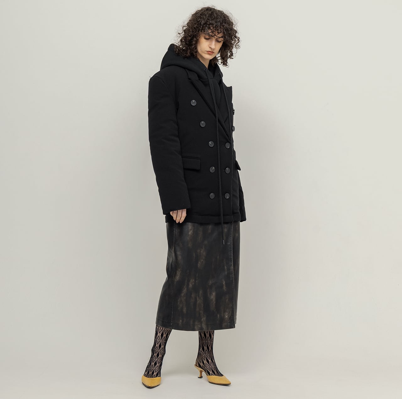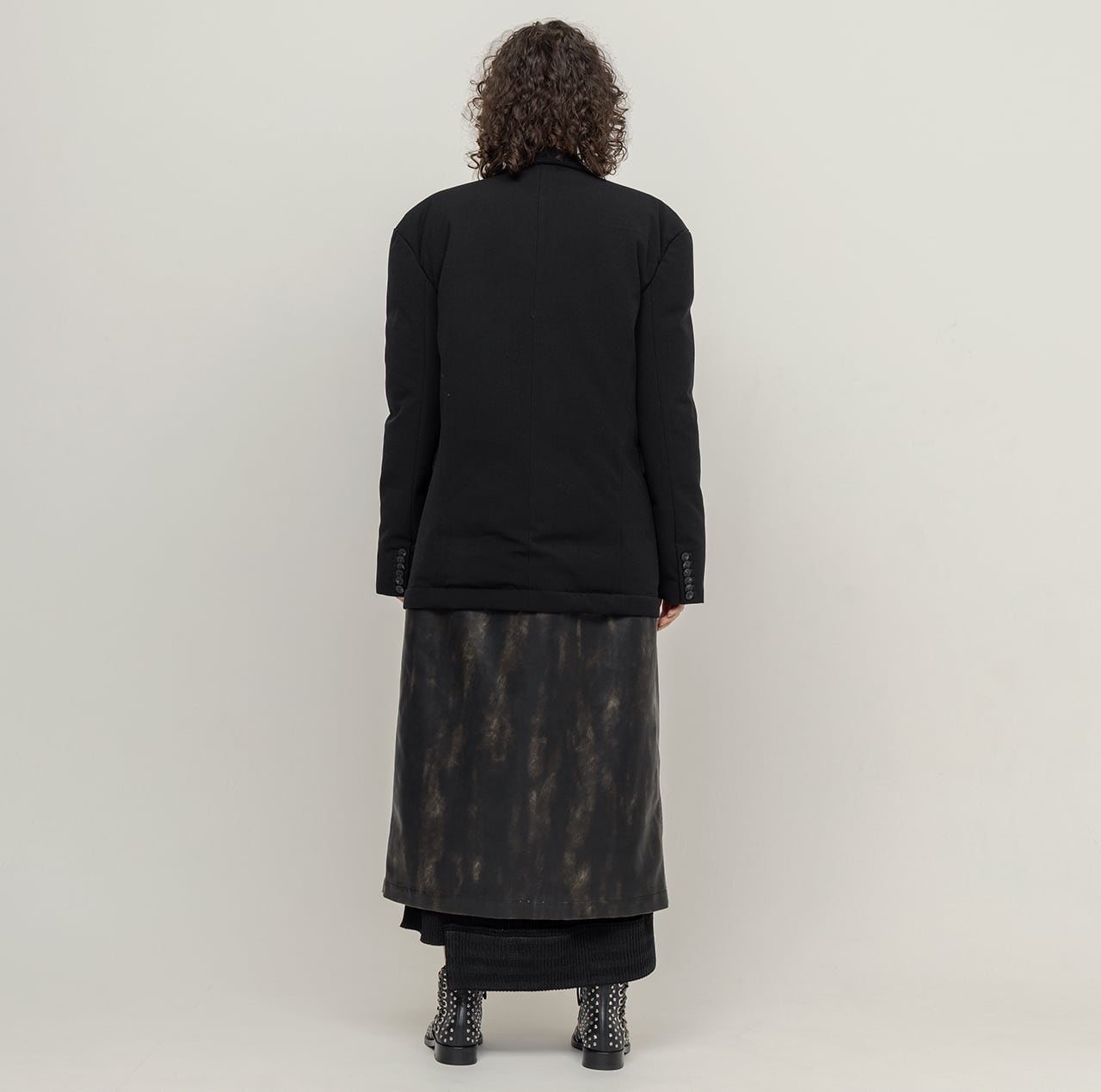 ツイルのジャケット型ダウンと、ハードウォッシュ加工を施した合皮パネルをレイヤードした構築的なデザインが、クラシックと実験性を絶妙なバランスで実現。