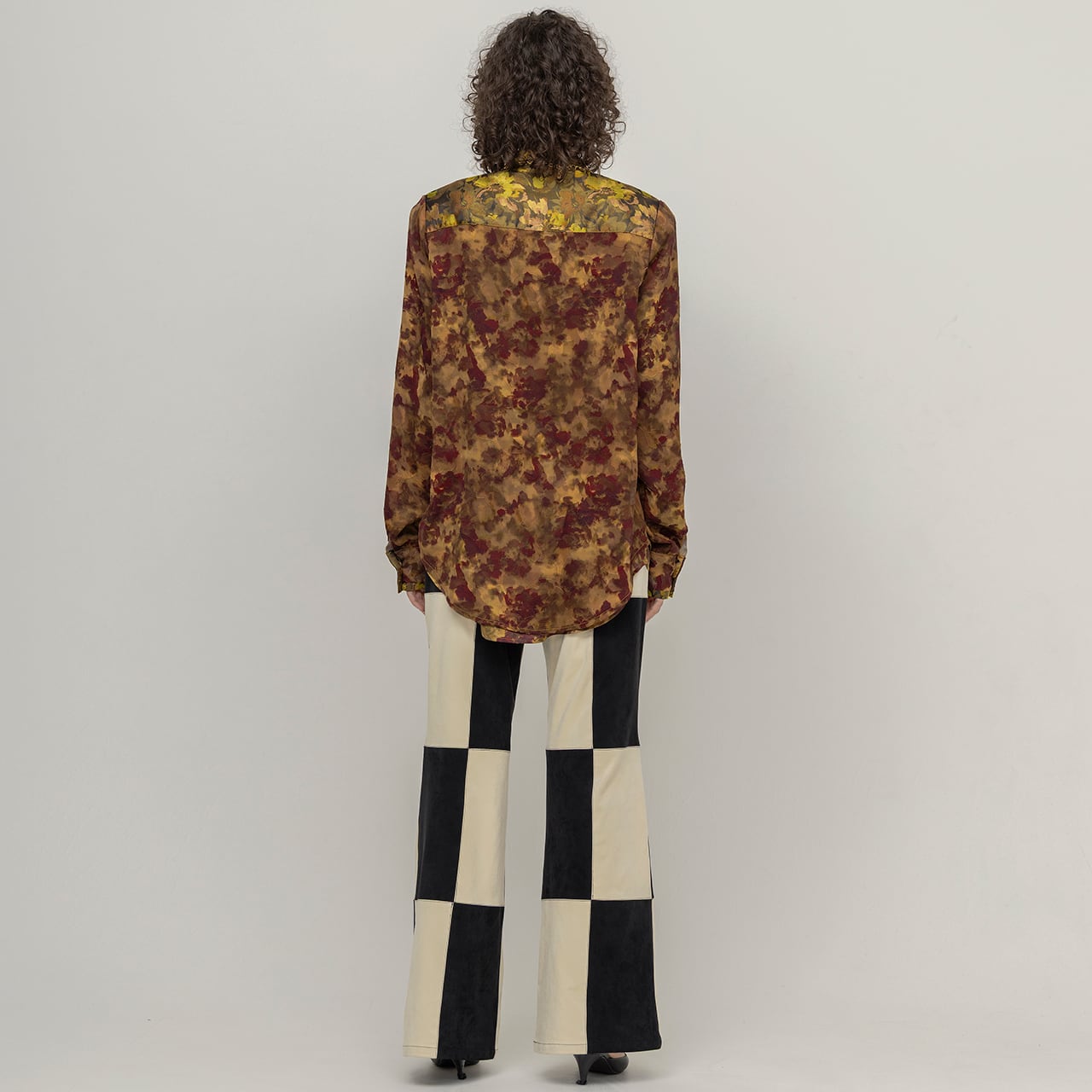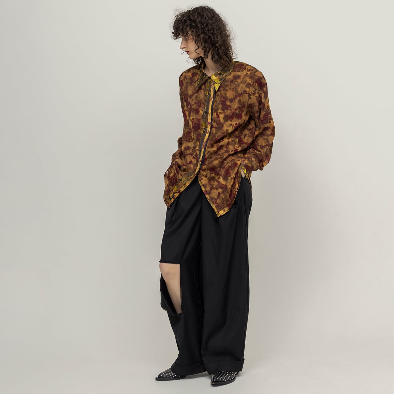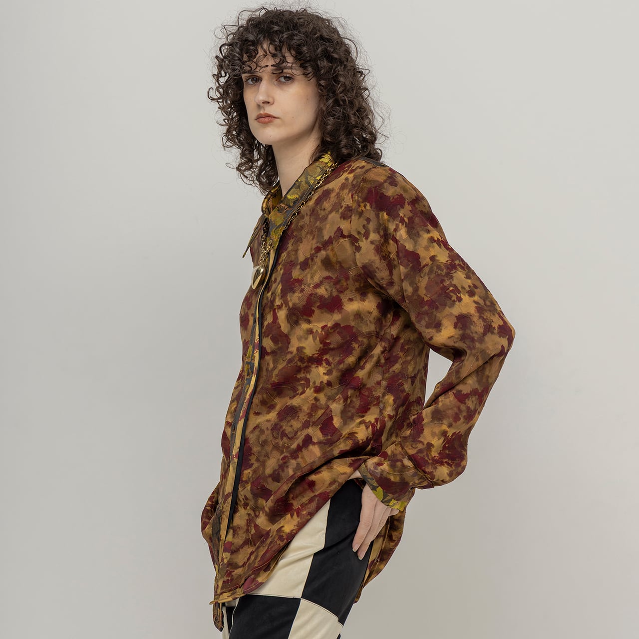 にじみのあるフラワープリントを重ね、多層的な奥行きをつくるレイヤードシャツ。