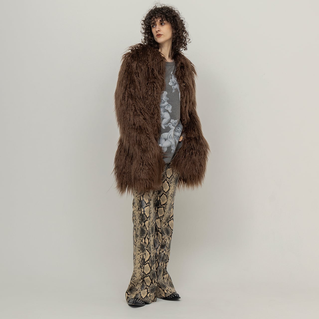 パイソン柄にエンボス加工を施したストレッチ性のあるフェイクレザーが身体の動きに寄り添い、ストレスのない穿き心地を叶える。
