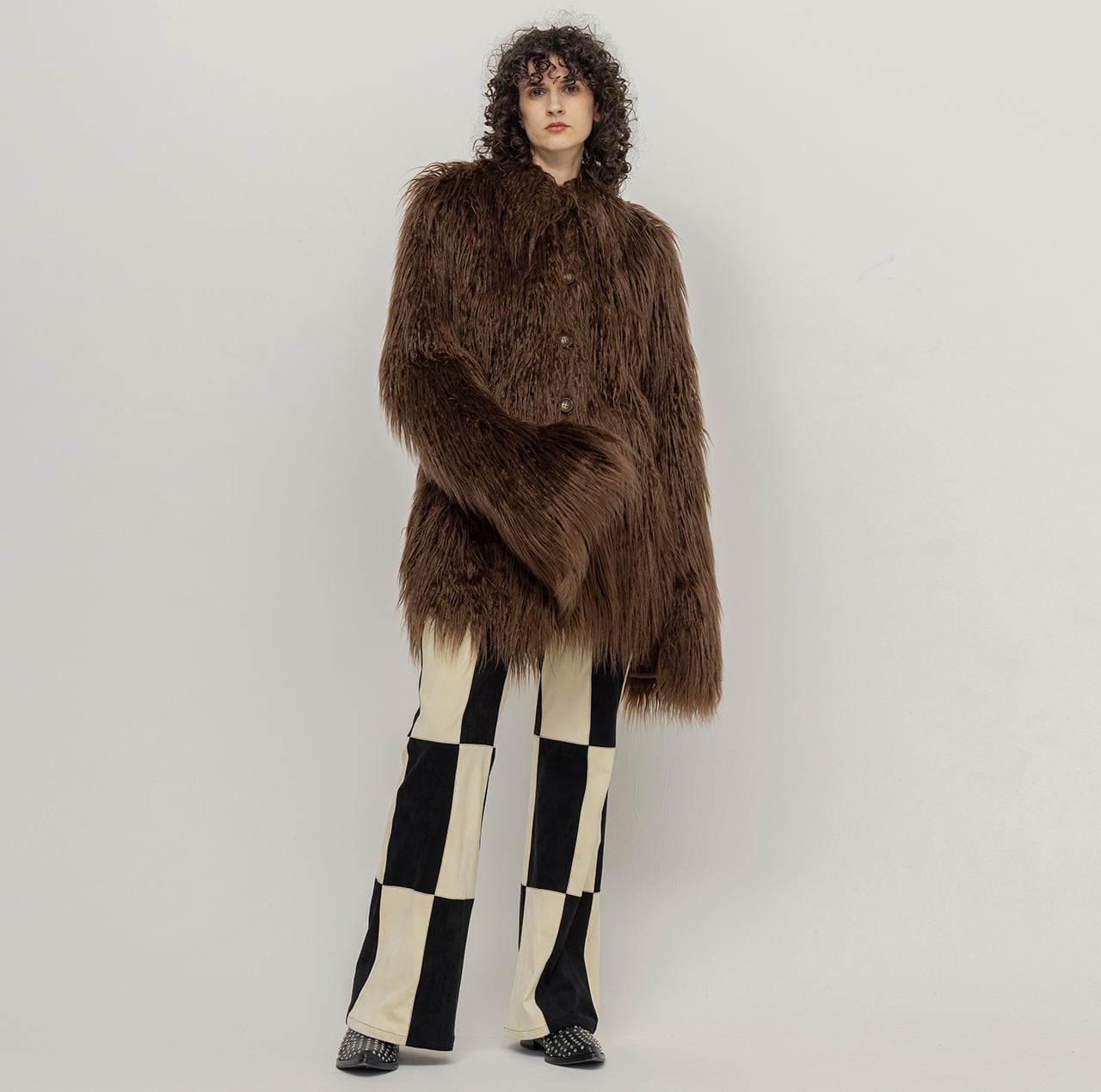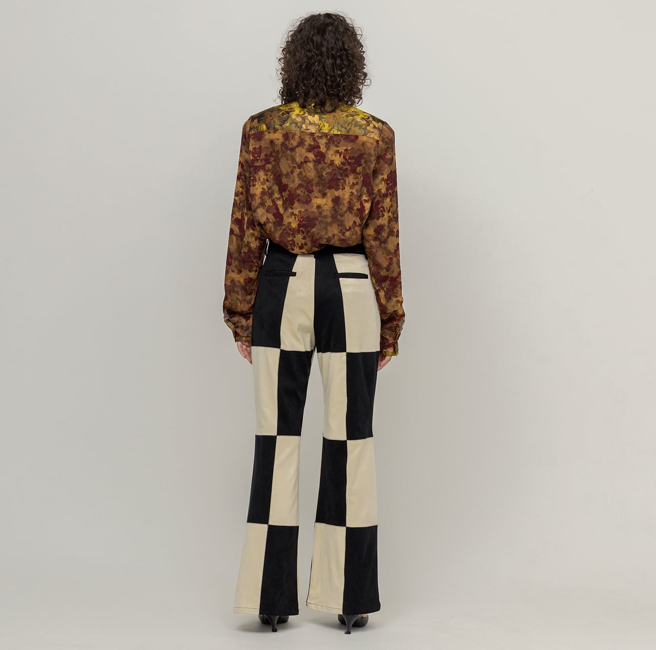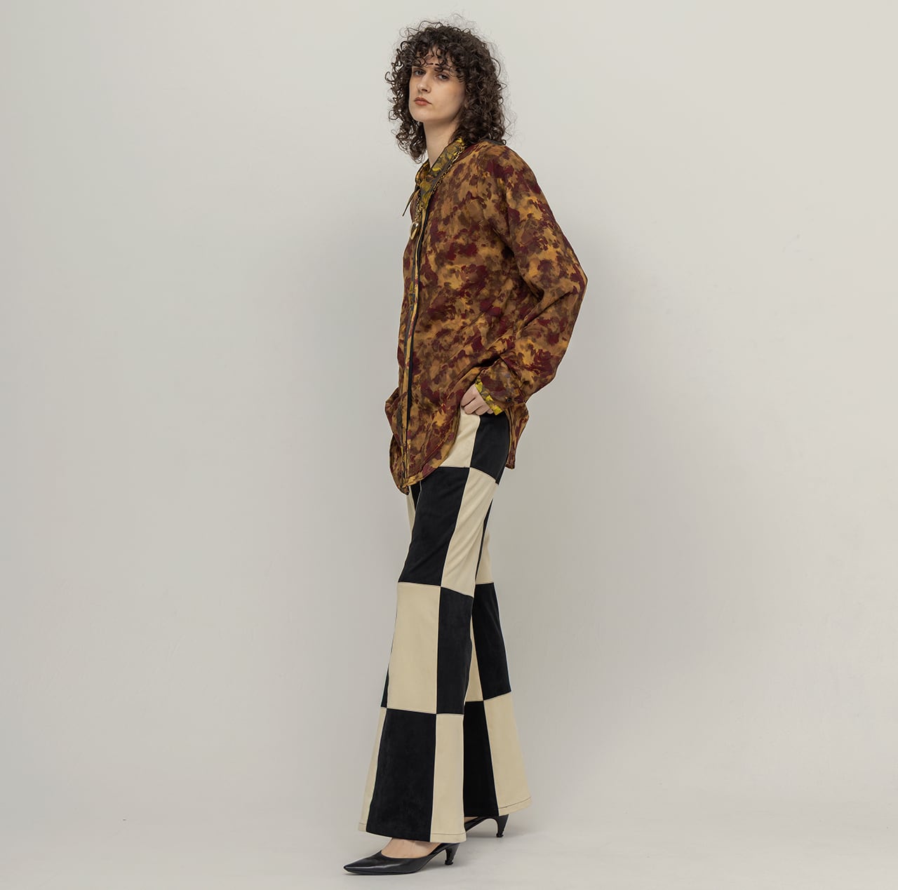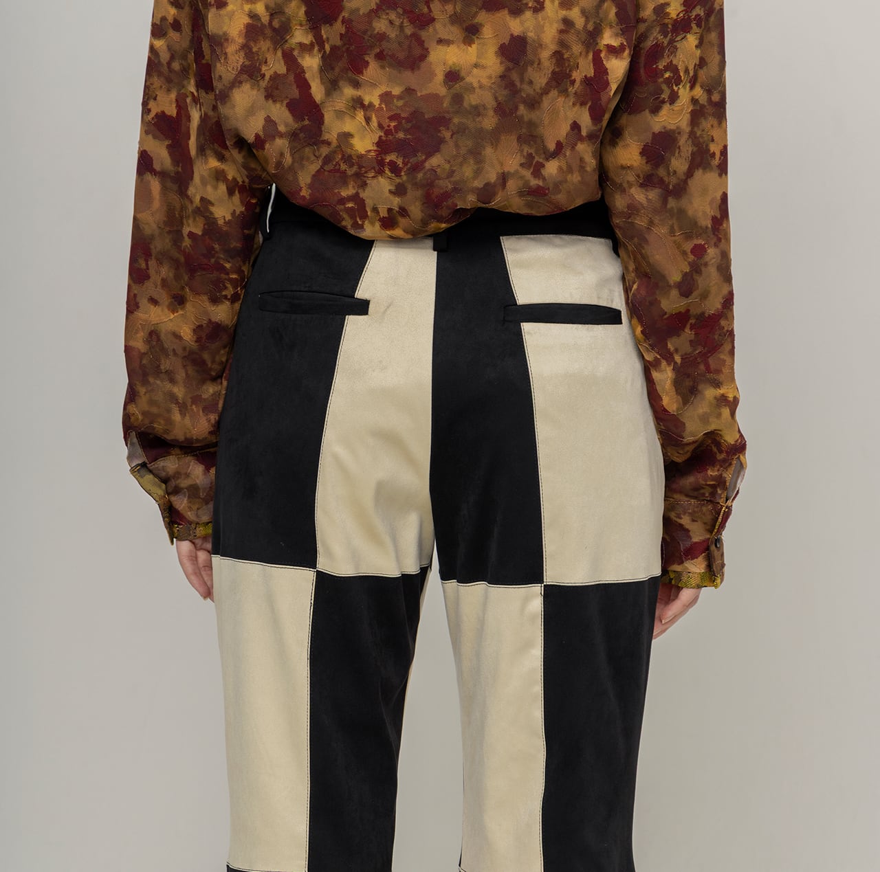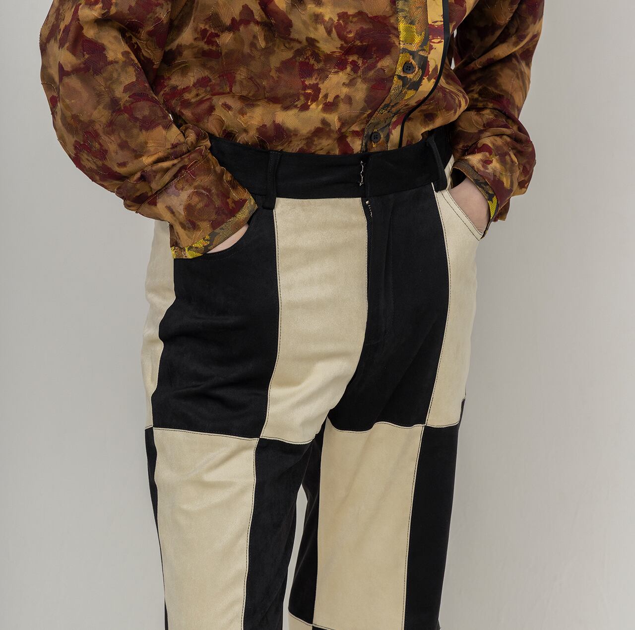 2色のフェイクスエードを継ぎ合わせ、チェッカー柄を再構築したフレアパンツ。