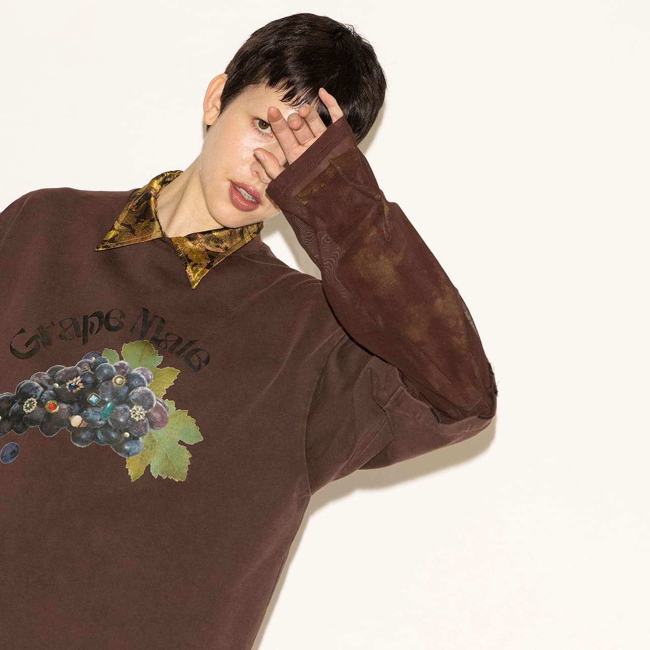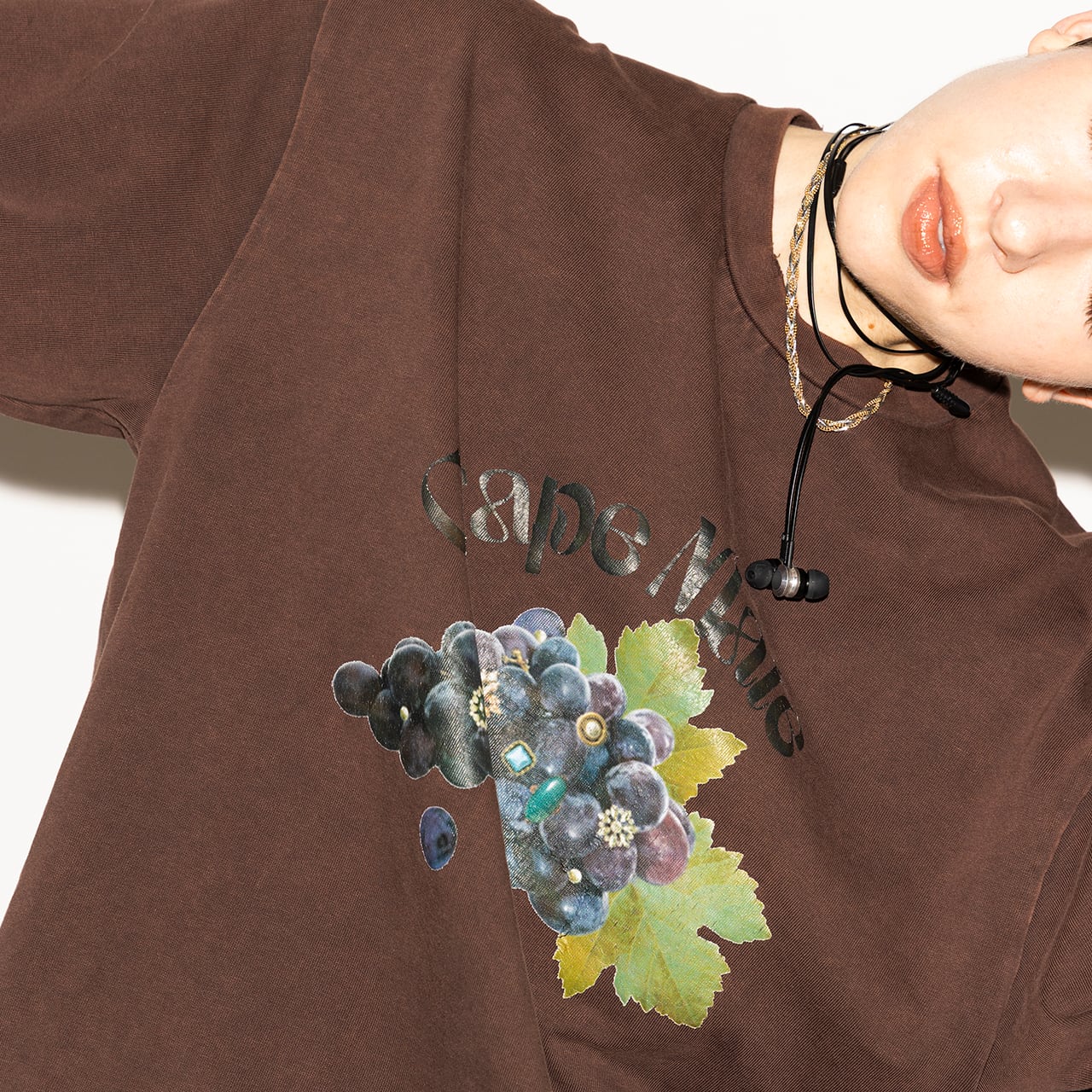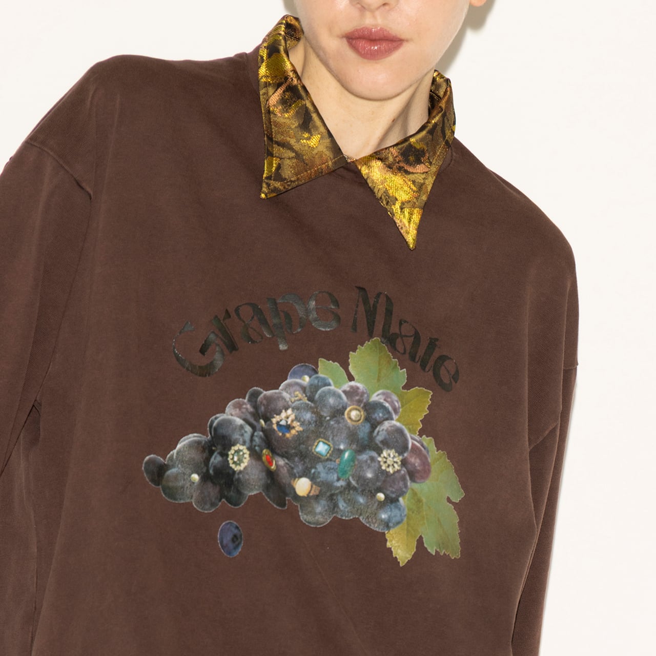 葡萄をモチーフにしたオリジナルデザインは、転写プリントならではの貼り付けたような厚みと艶感が特徴。