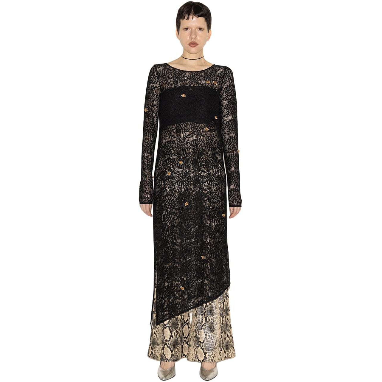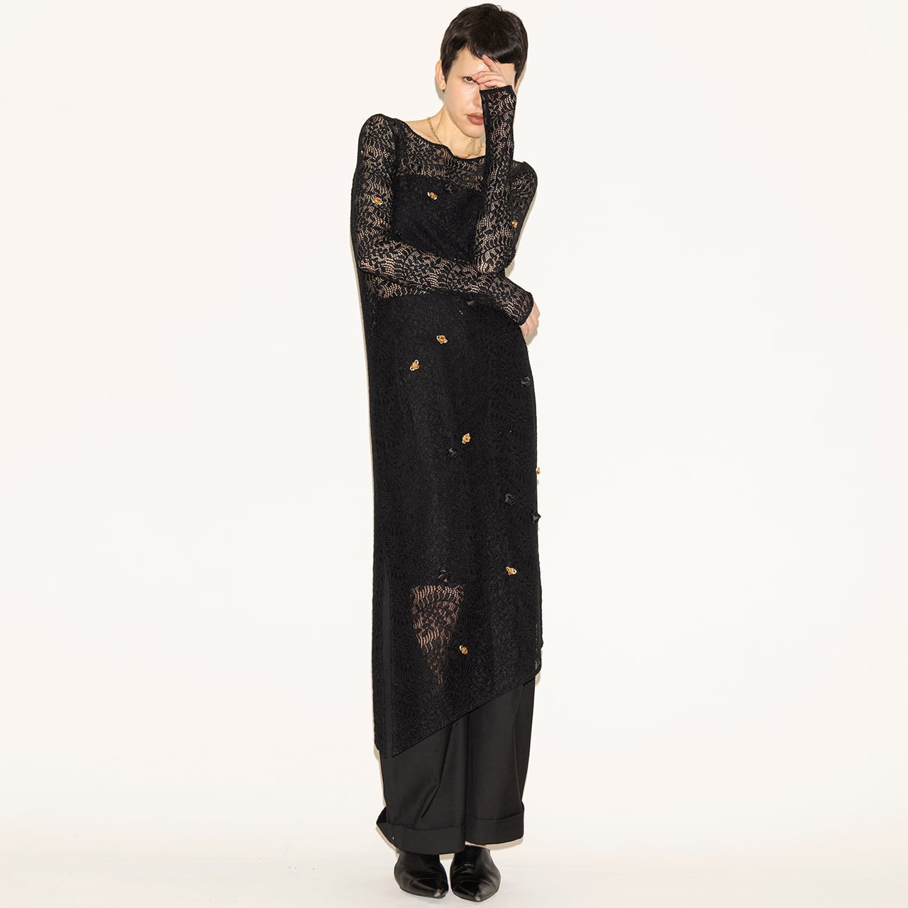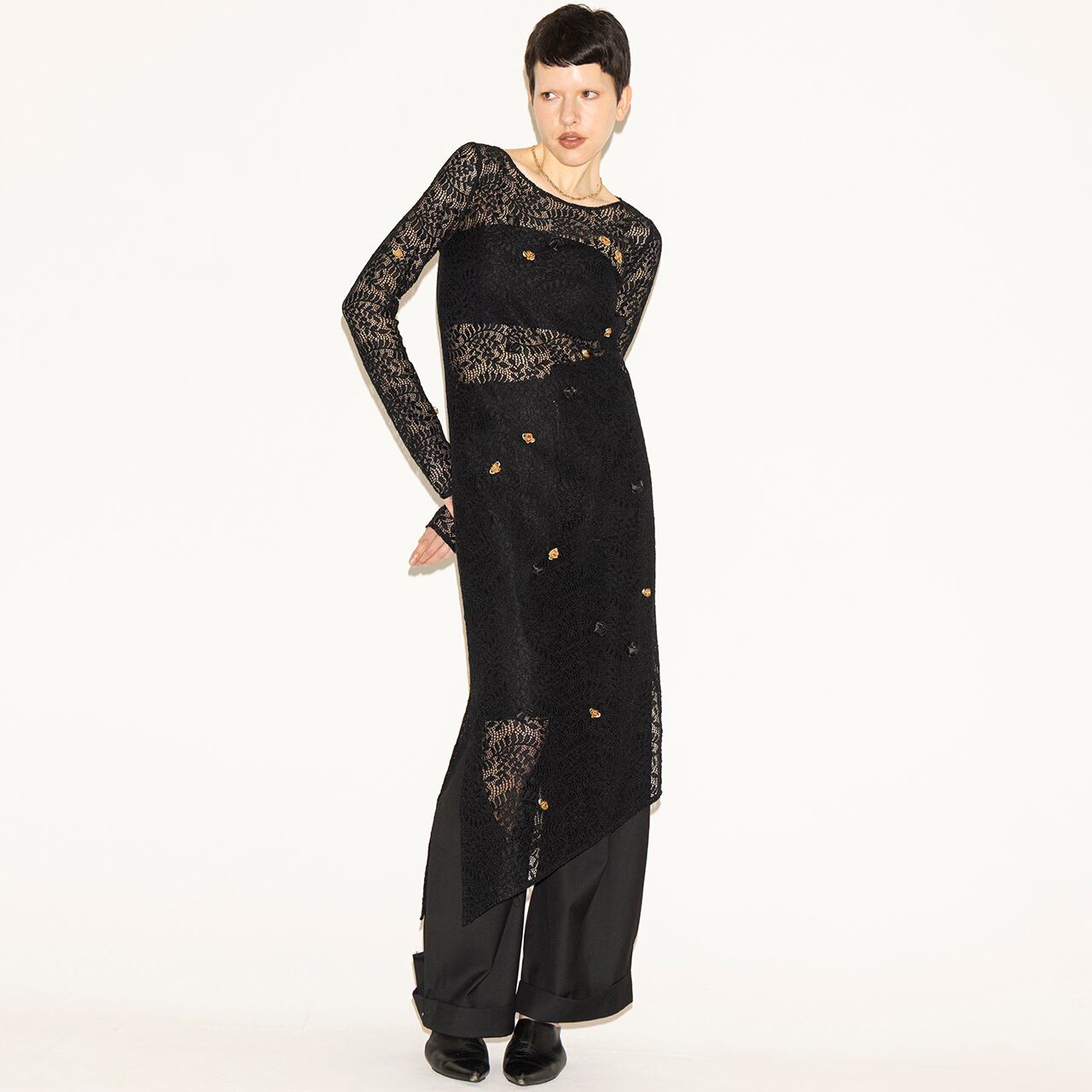 立体的なフラワーモチーフをランダムに散りばめた、アシンメトリードレス。