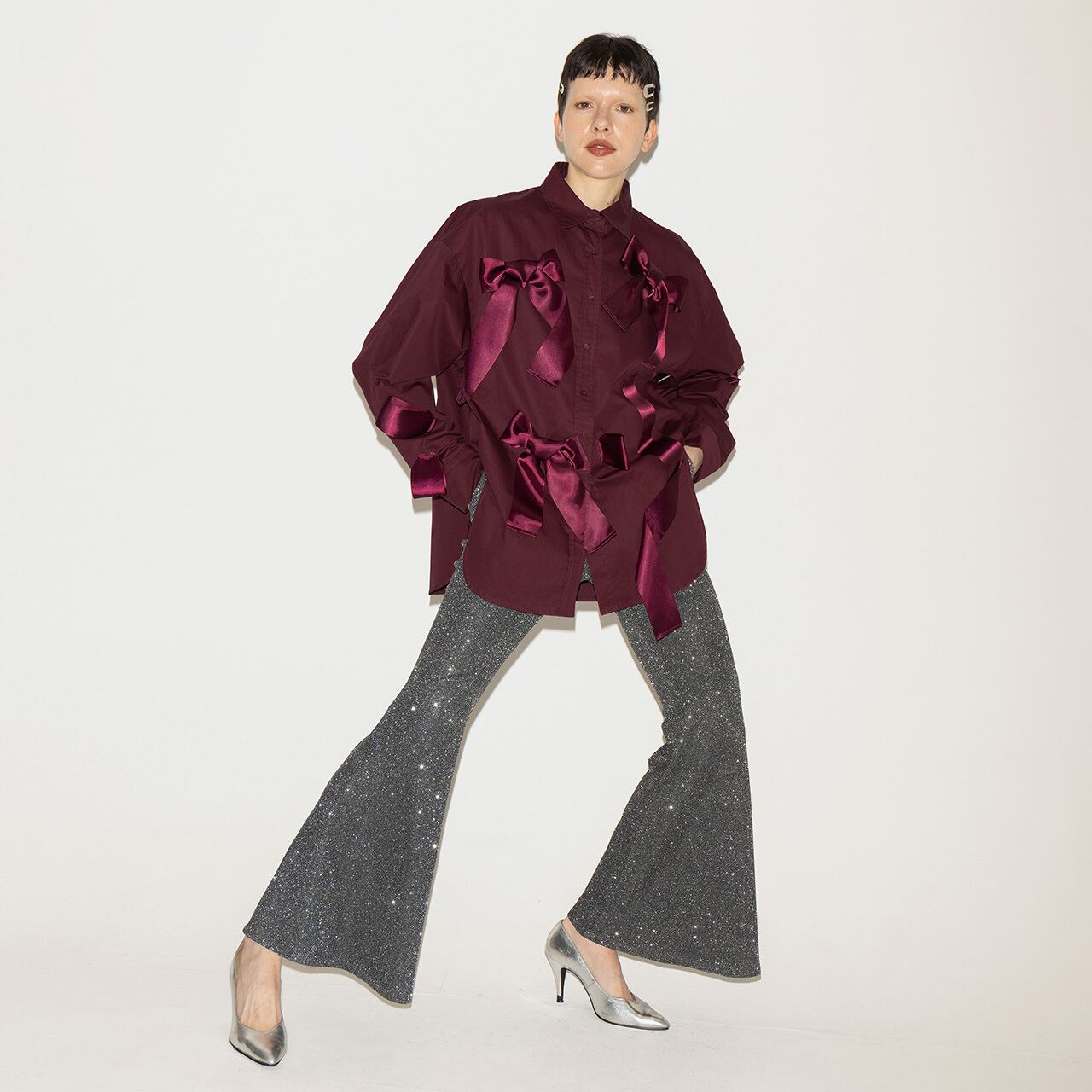 光をまとい、ラインを引き上げるフレアパンツ。