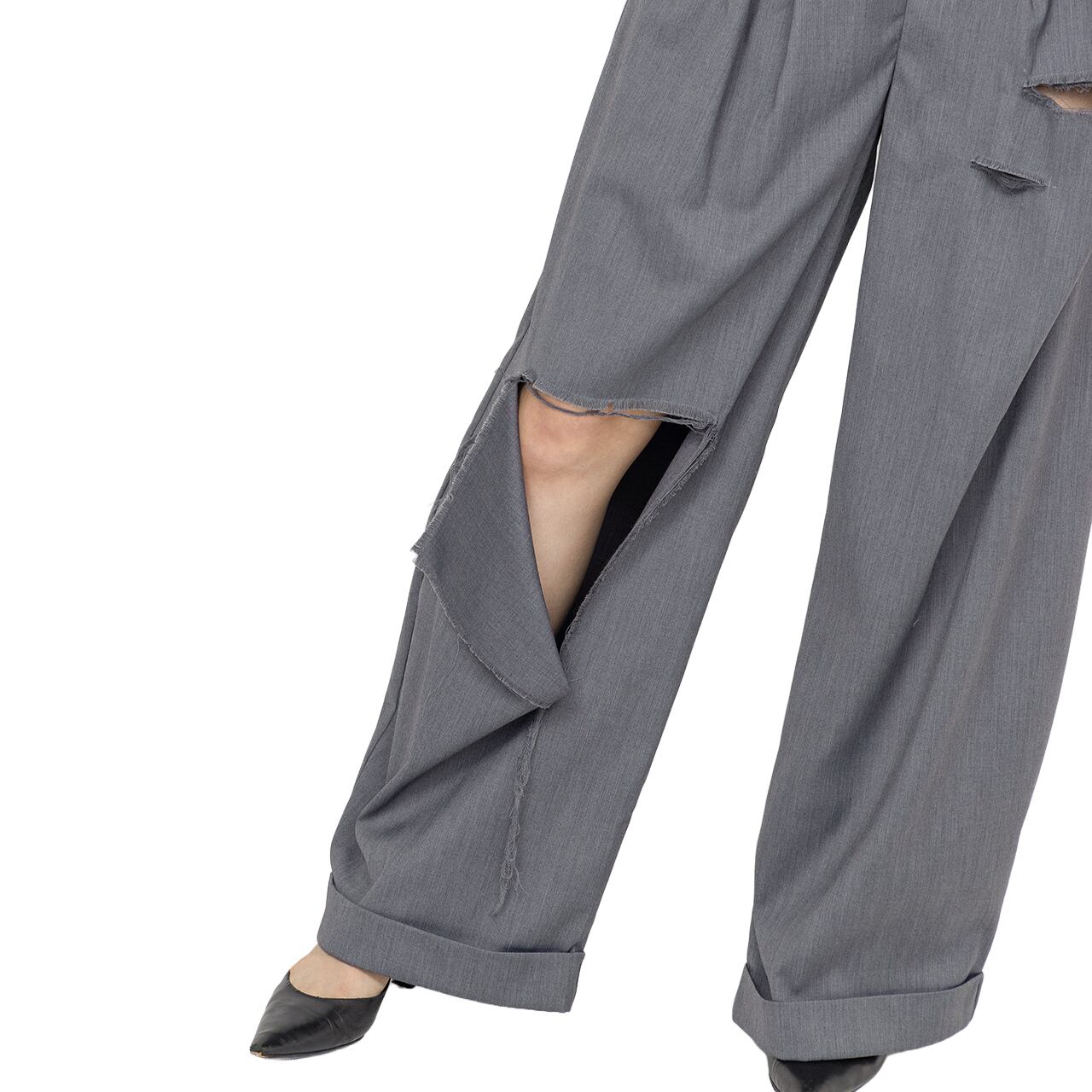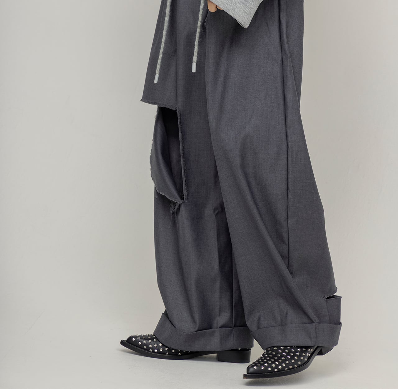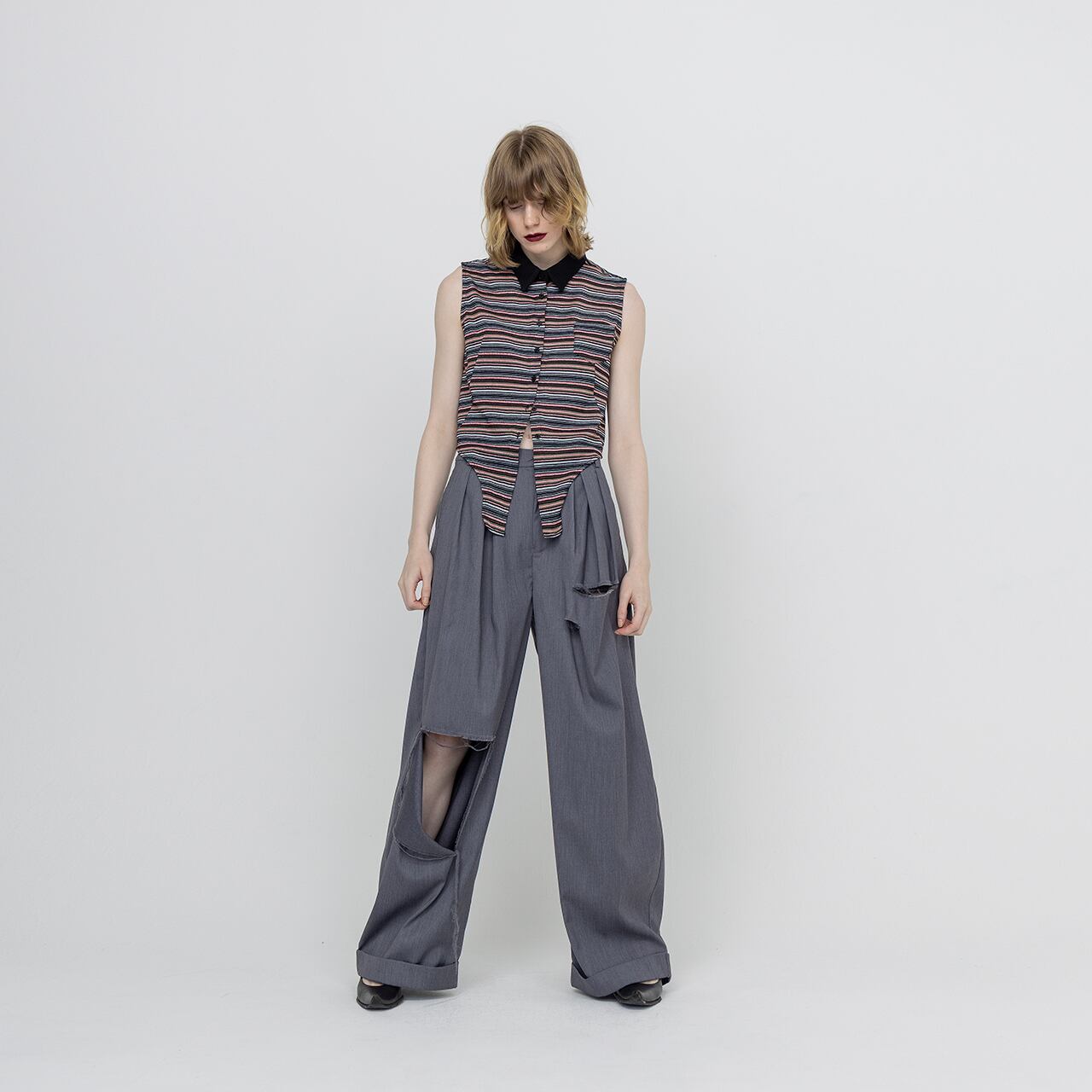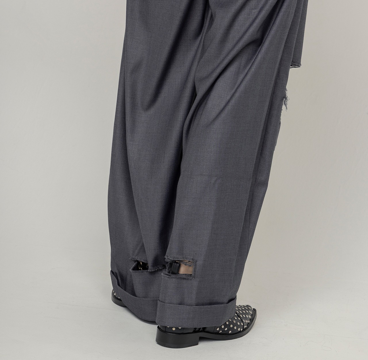 綺麗めな印象のスラックスに大胆なダメージを施し、グランジ要素をプラスした1着。