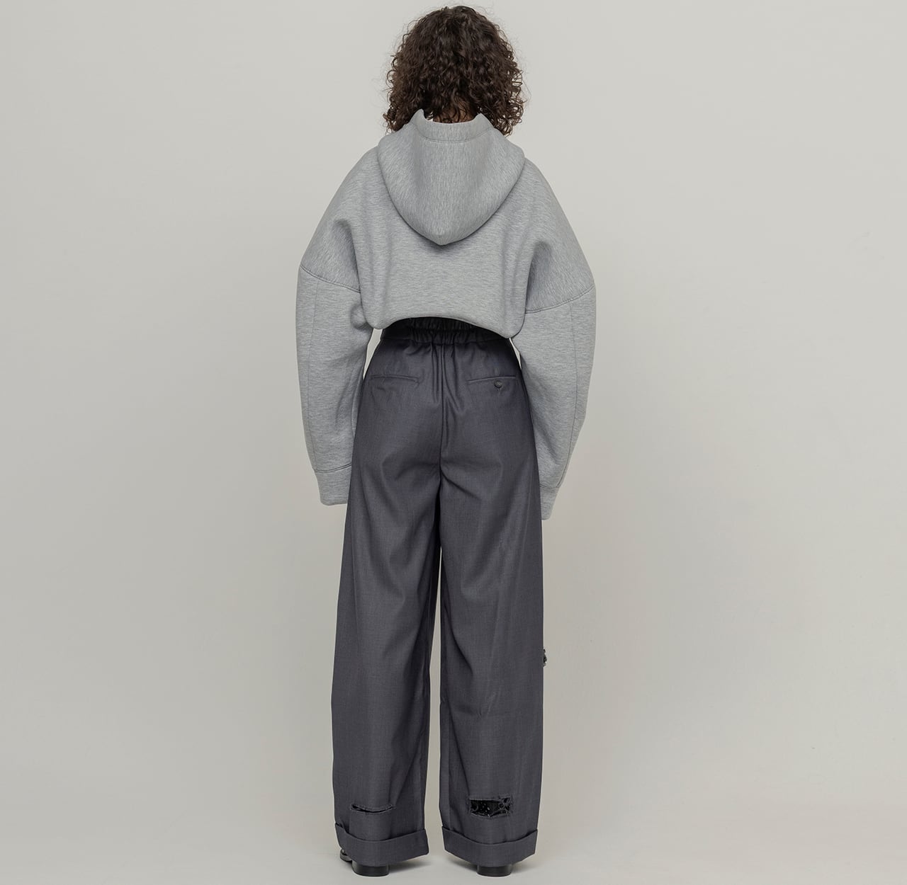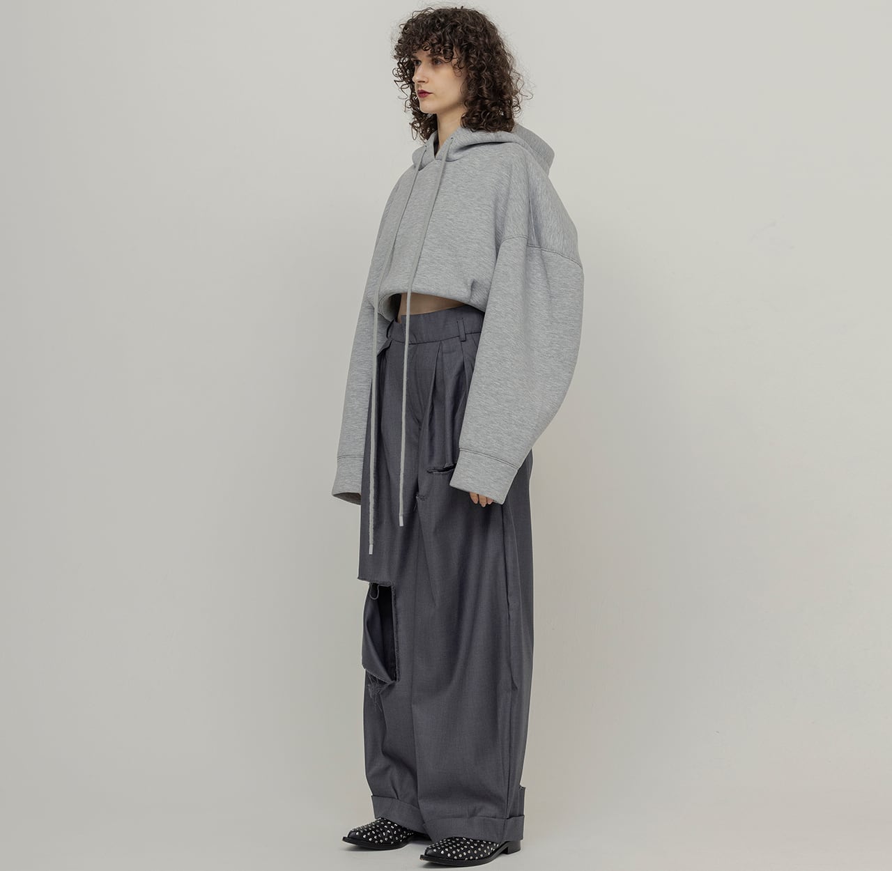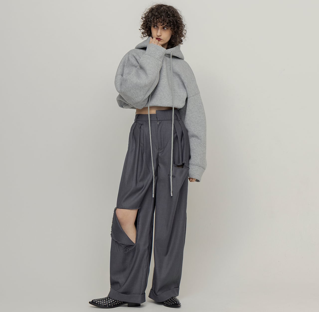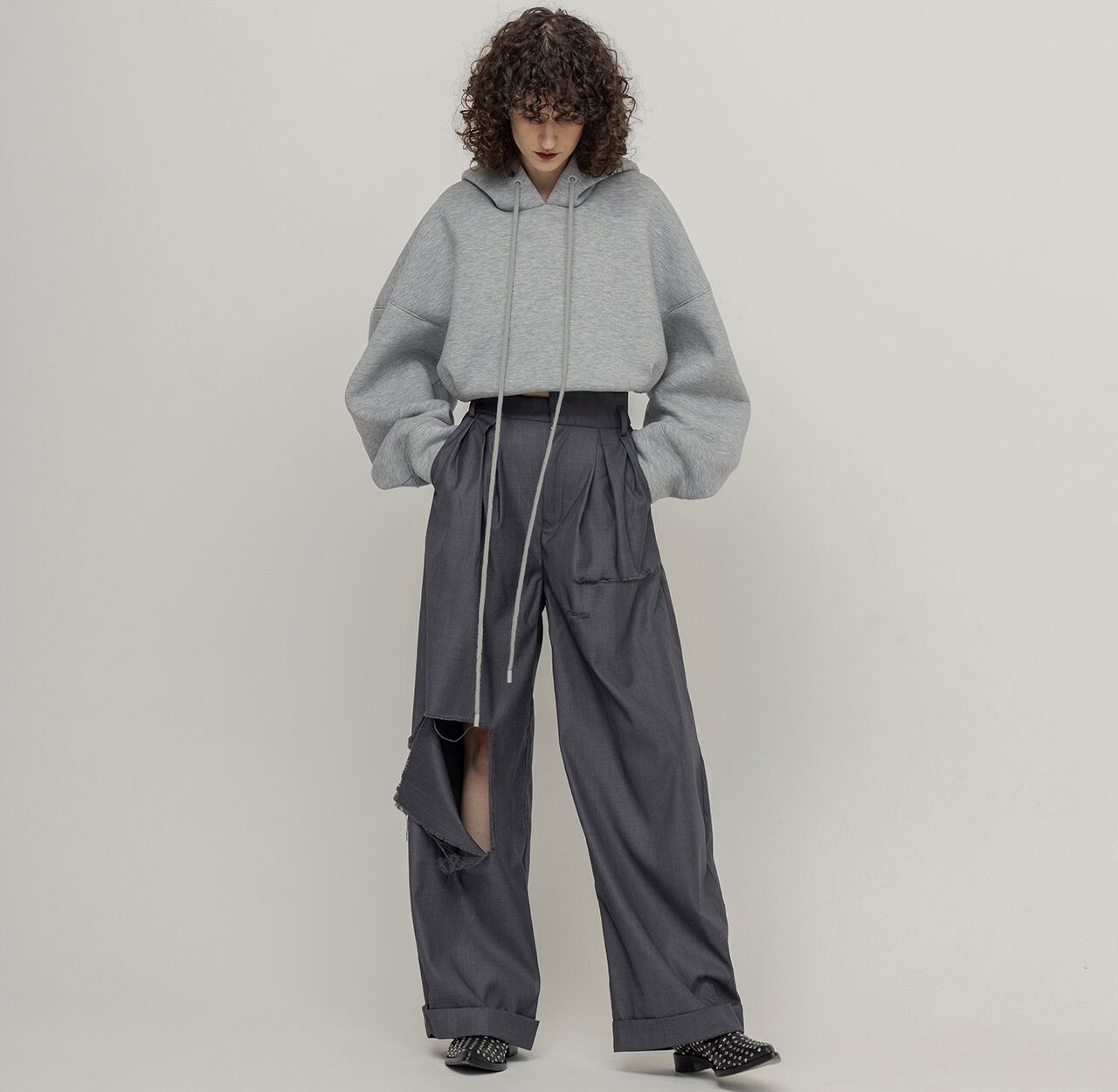 綺麗めな印象のスラックスに大胆なダメージを施し、グランジ要素をプラスした1着。