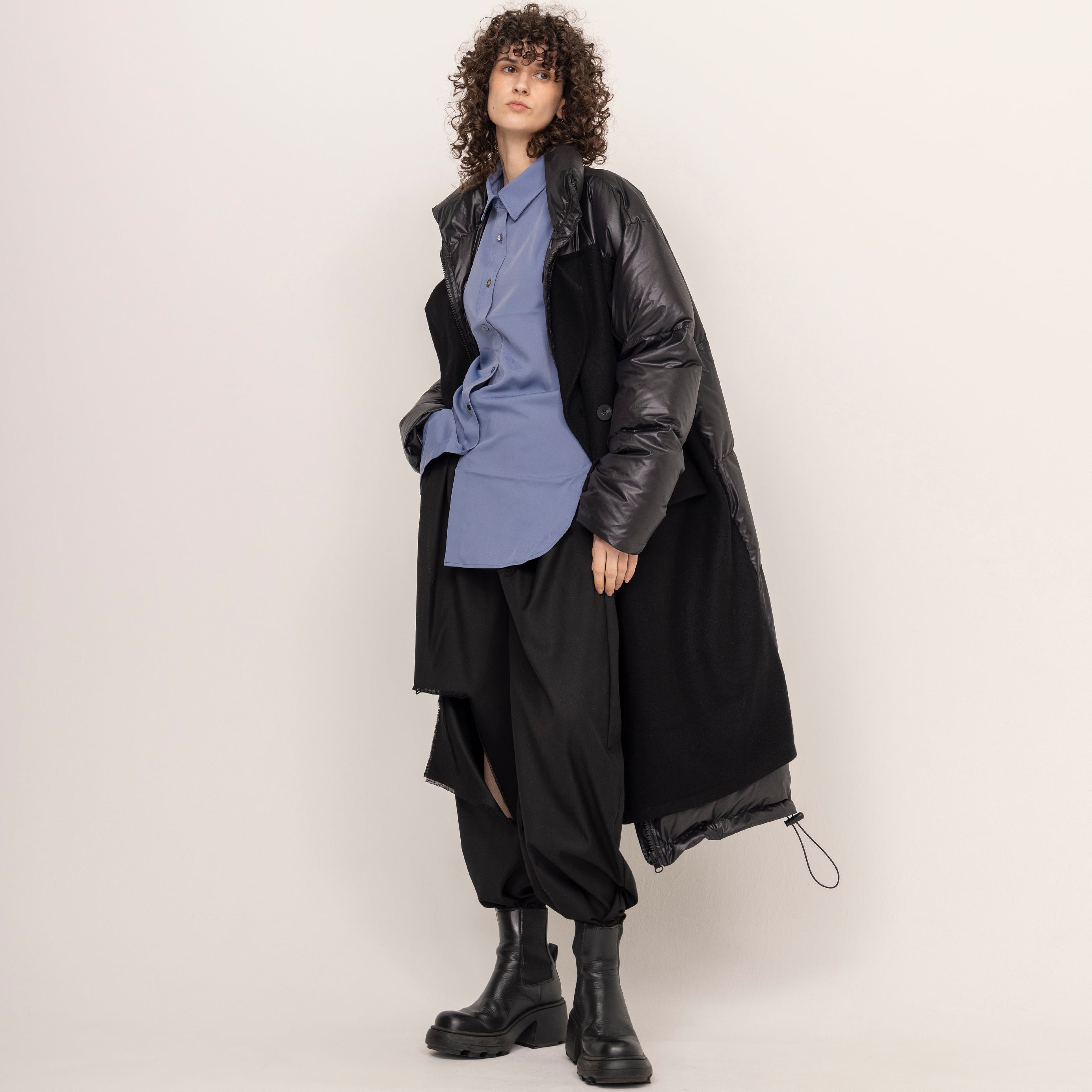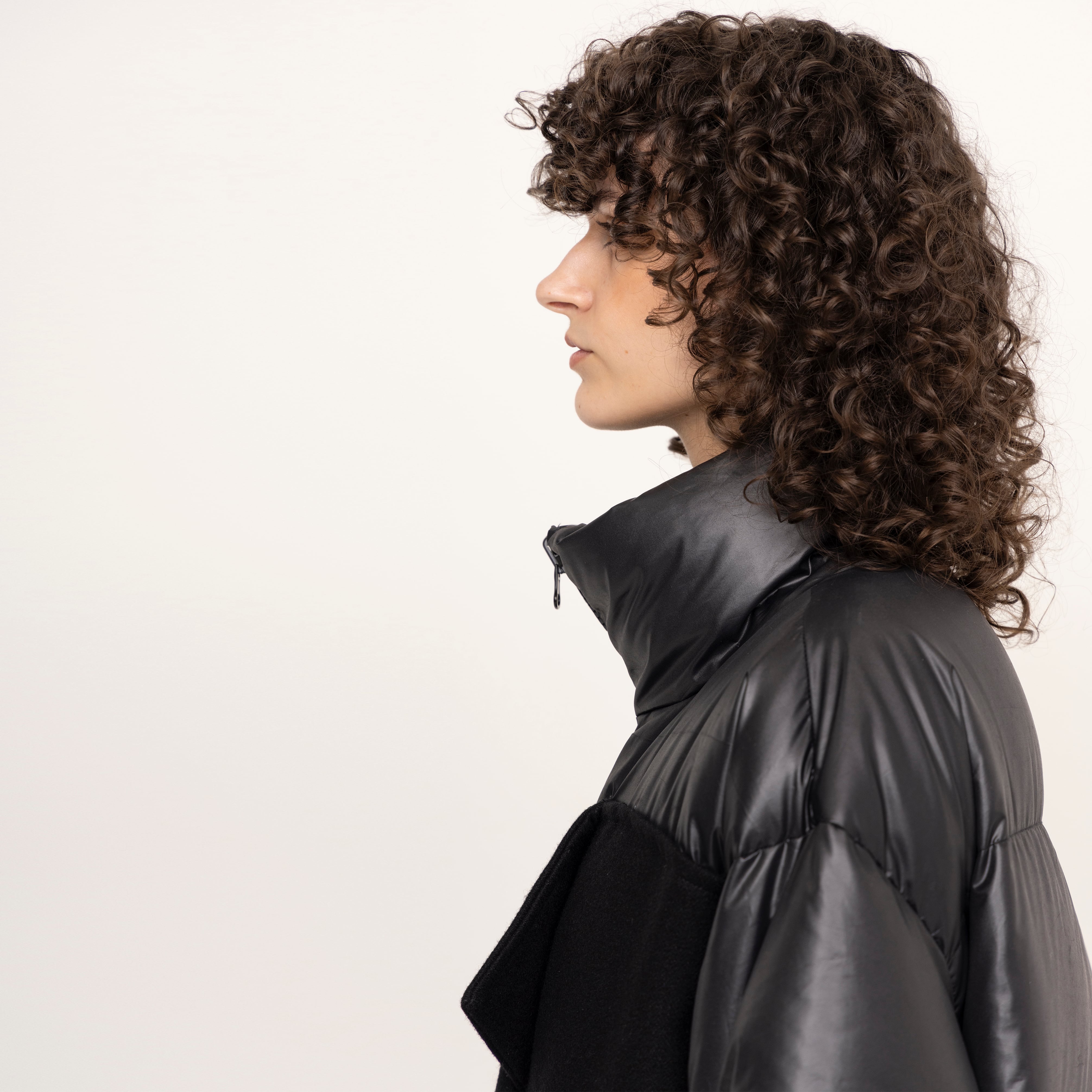艶のあるナイロン素材とウールの異素材コンビが、奥行きのあるモード感を演出します。
